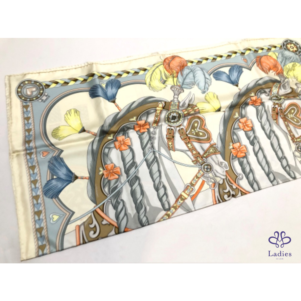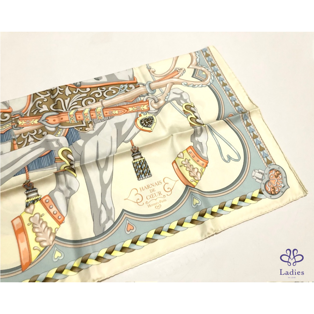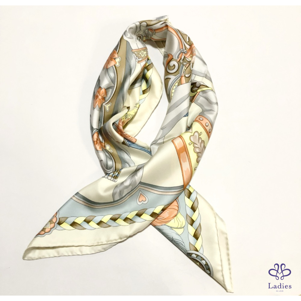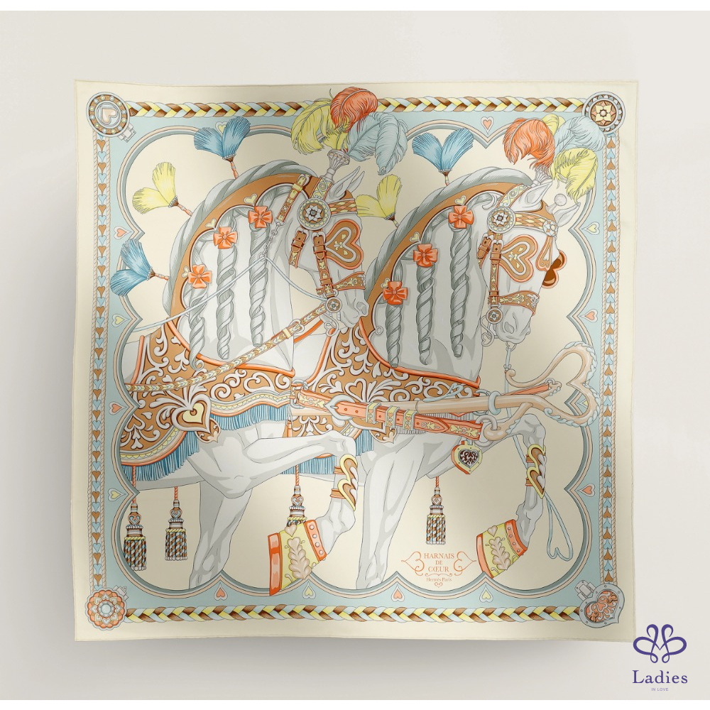 Hermes 愛馬仕 Harnais de Coeur 甜蜜馬鞍 奶油色 / 灰色 珍珠白 / 杏桃色 90x90cm 絲巾方巾