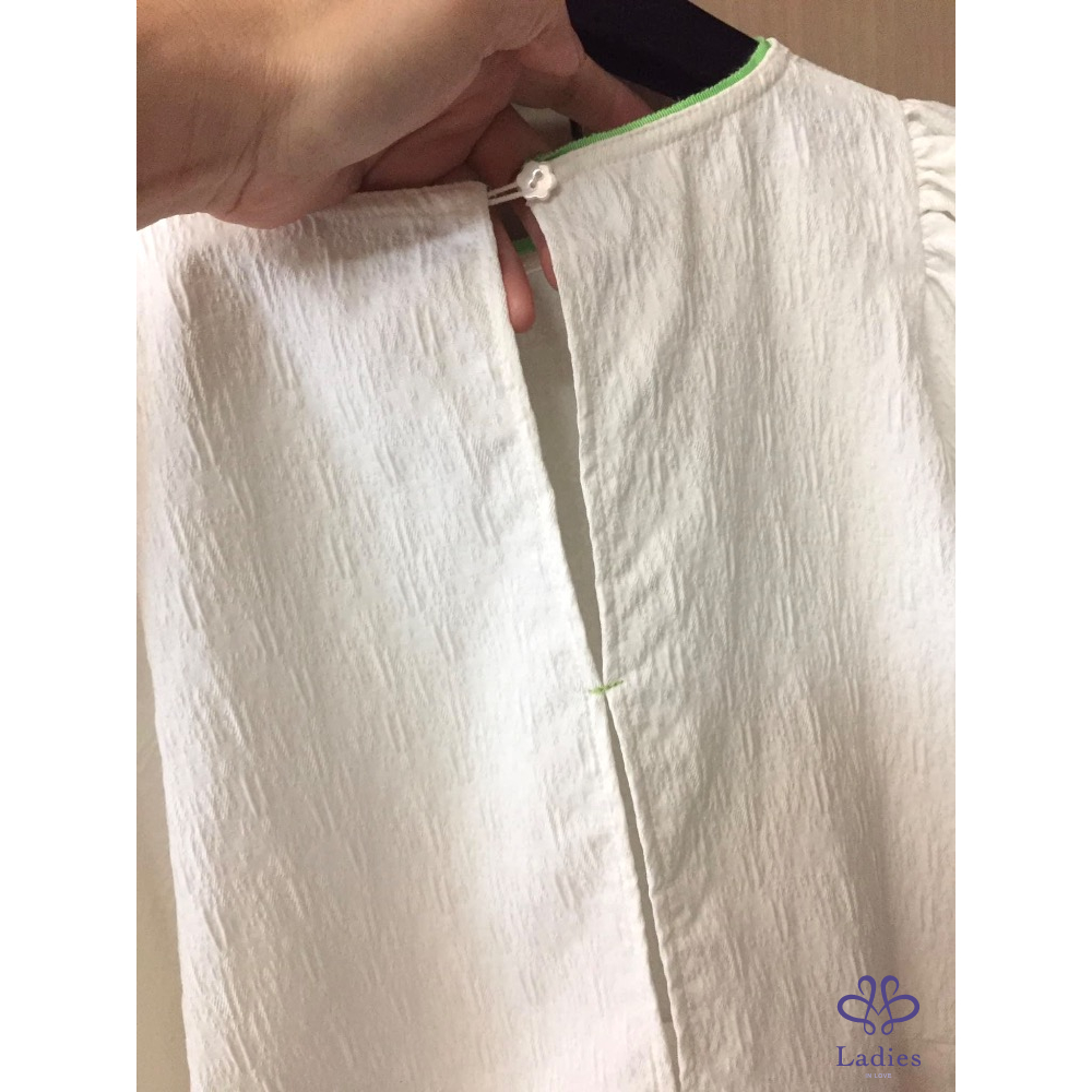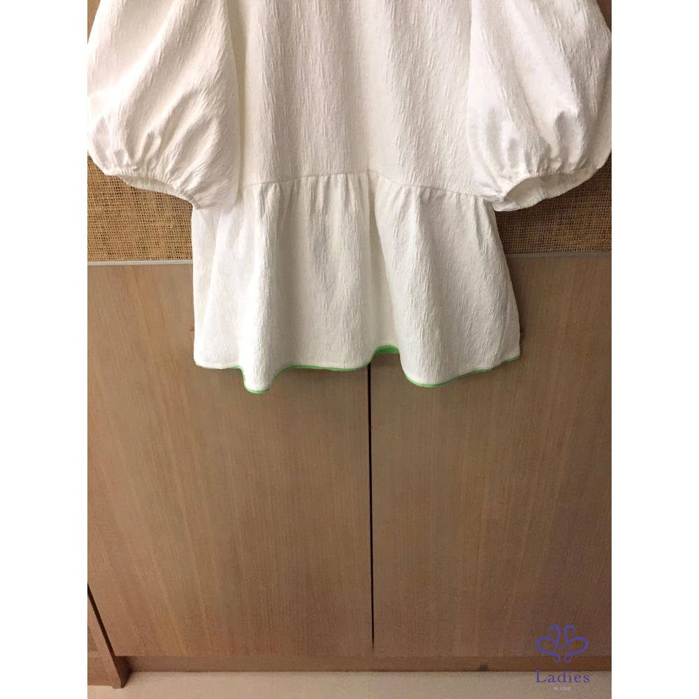 超可愛的公主袖上衣 緞面壓紋材質很立體的空氣感領口.下擺滾蘋果綠的花邊年輕俏皮下面可以搭配長裙短褲都很好看喔 出清價$2980含運售出不退感謝辛苦管理員謝謝美女們推喔她團