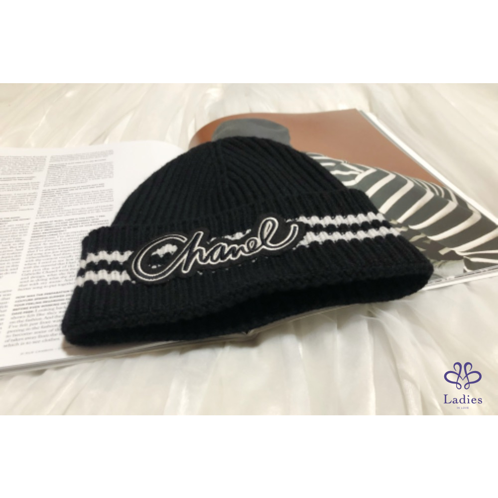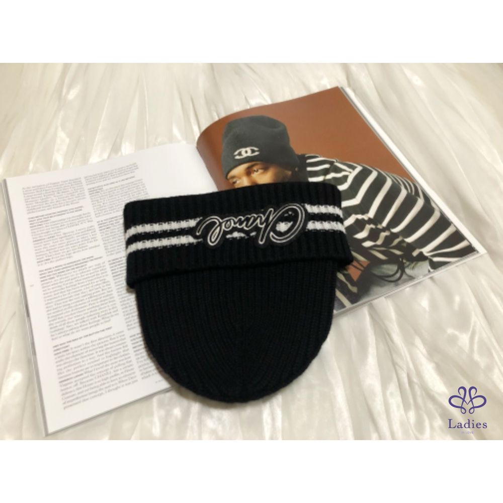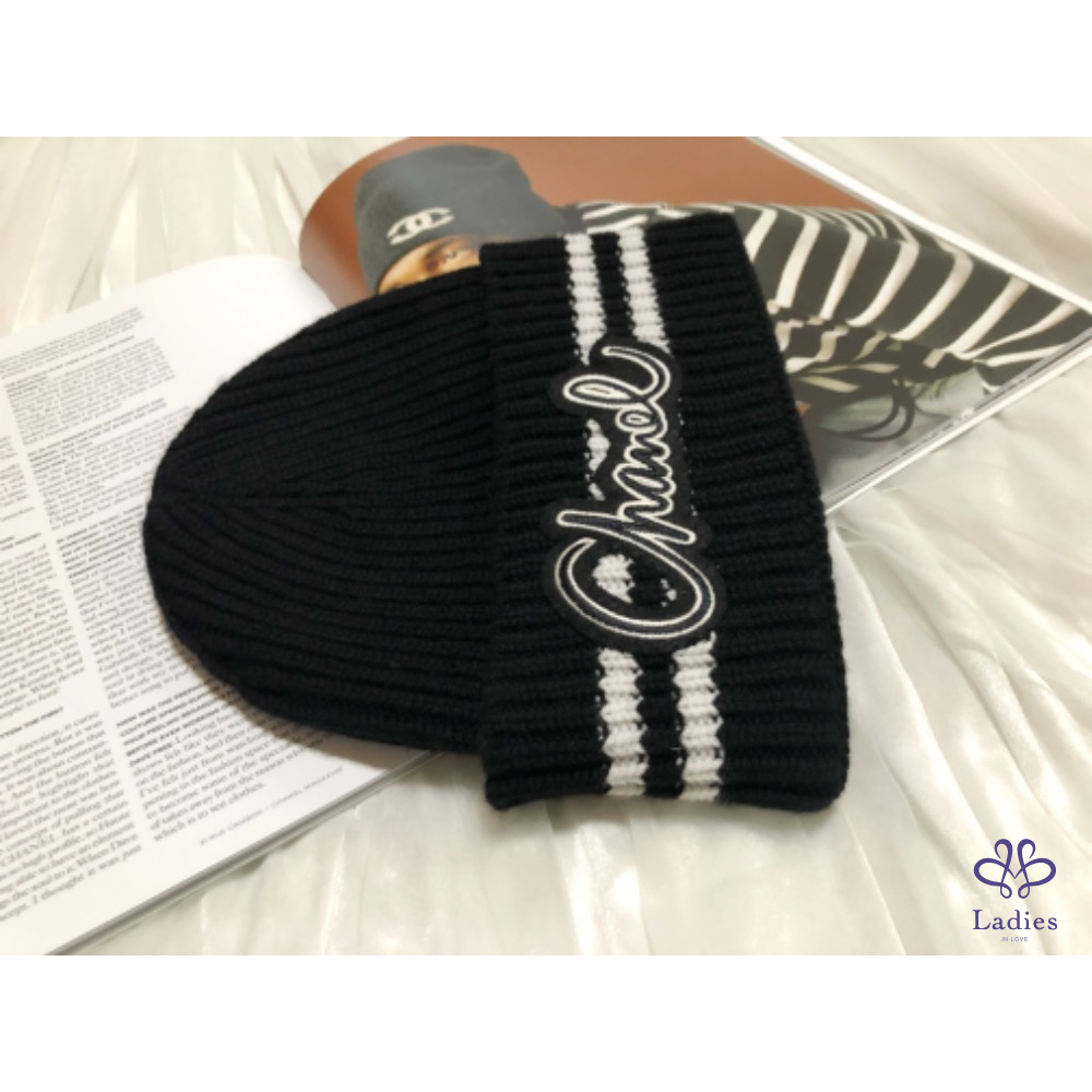 CHANEL 香奈兒 小香 24B 黑色 字母草寫 條紋 羊毛 毛帽 全新✨