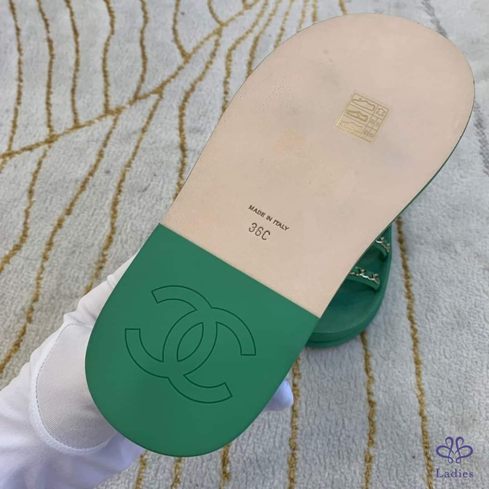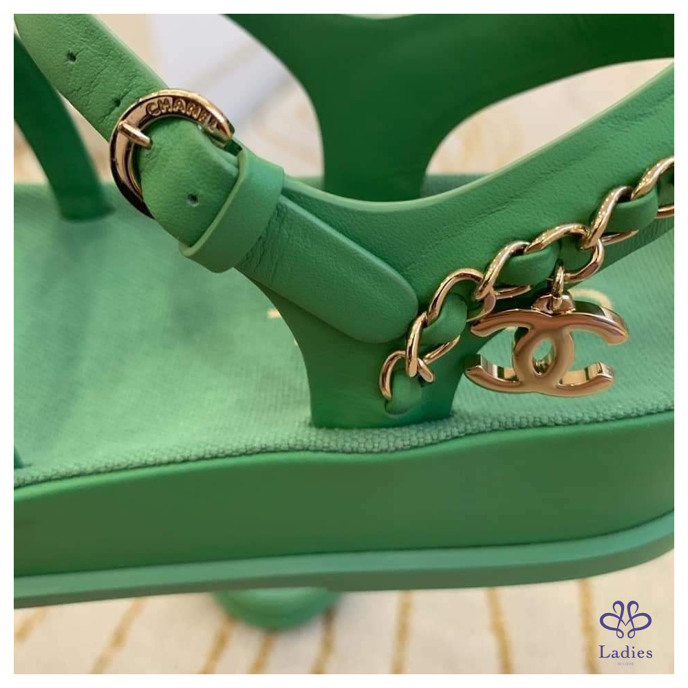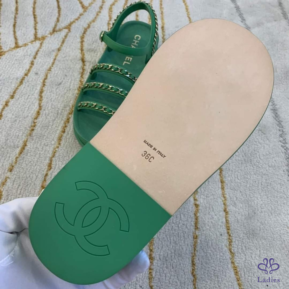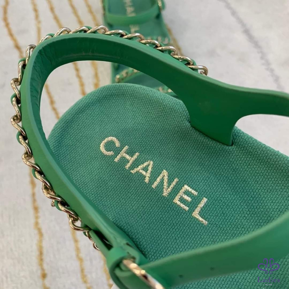 售 Chanel 香奈兒經典皮穿鍊綠金涼鞋/平底鞋/鞋子