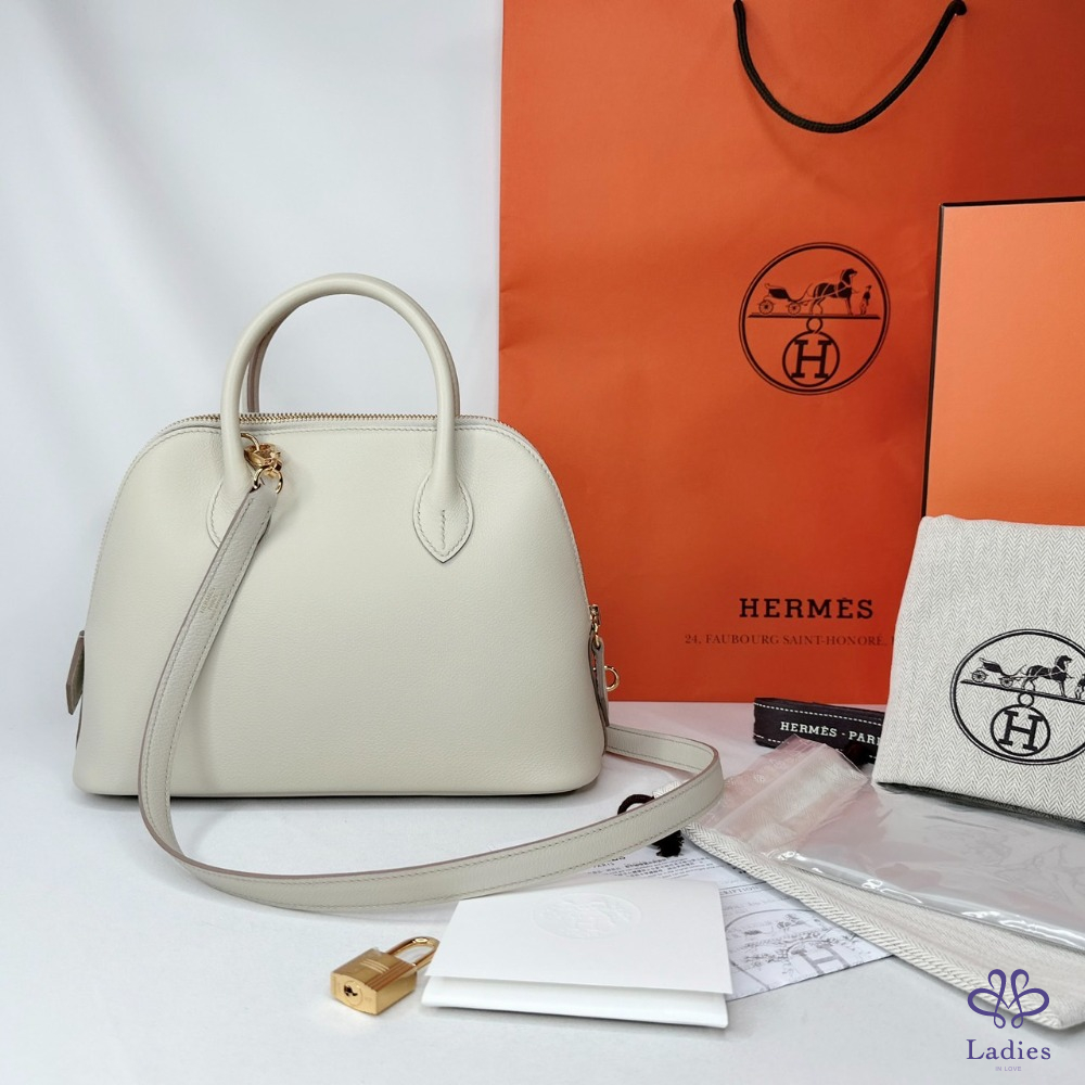 產品信息 【HERMES Bolide 25柏莉包】 #B刻金扣 #8L冰川白 #EVERCOLOR皮 經典Bolide 25爆款黃金尺寸神仙配色 俐落設計搭配冰川白金釦 直接美到暈~ 底釘膠膜全在,近全新閒置無使用的美包 整體包況約9成8新,二手商品均有正常存放痕跡 尺寸:25x20x10.5cm 附件:原廠盒、原廠紙袋、原廠背帶、原廠防塵袋x2、原廠雨衣套、台灣購證影本(去個資)、鎖匙組、說明書、緞帶 #B113070702