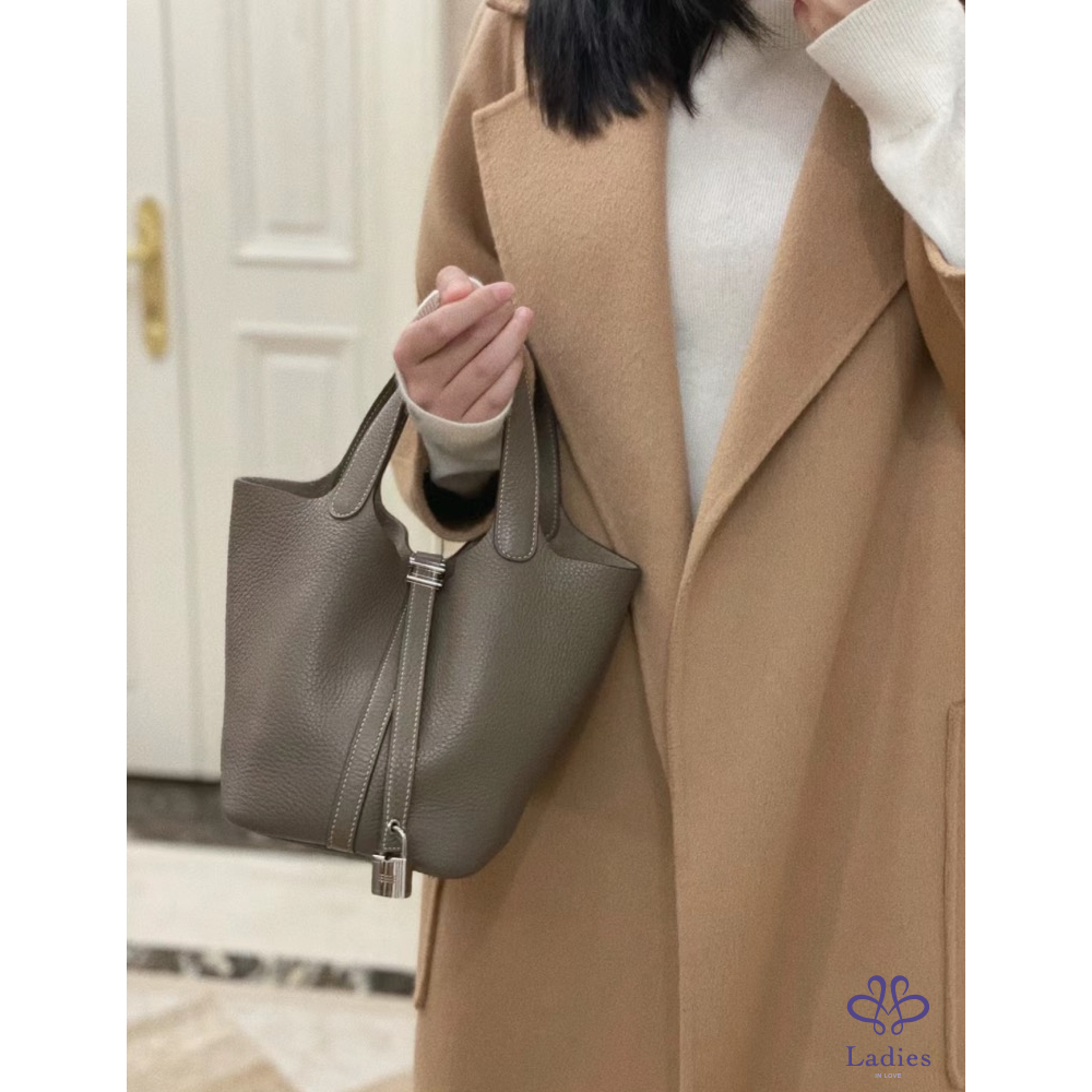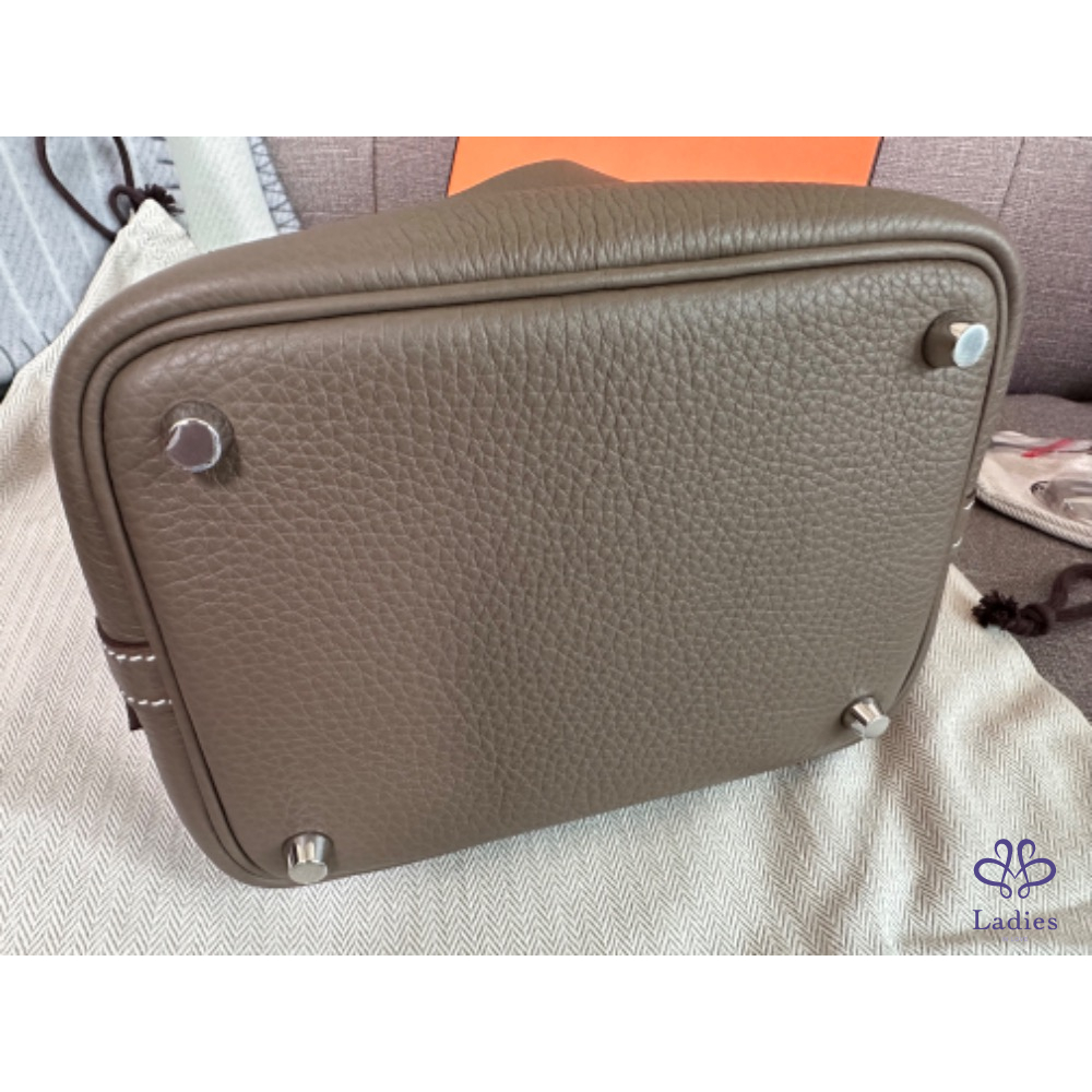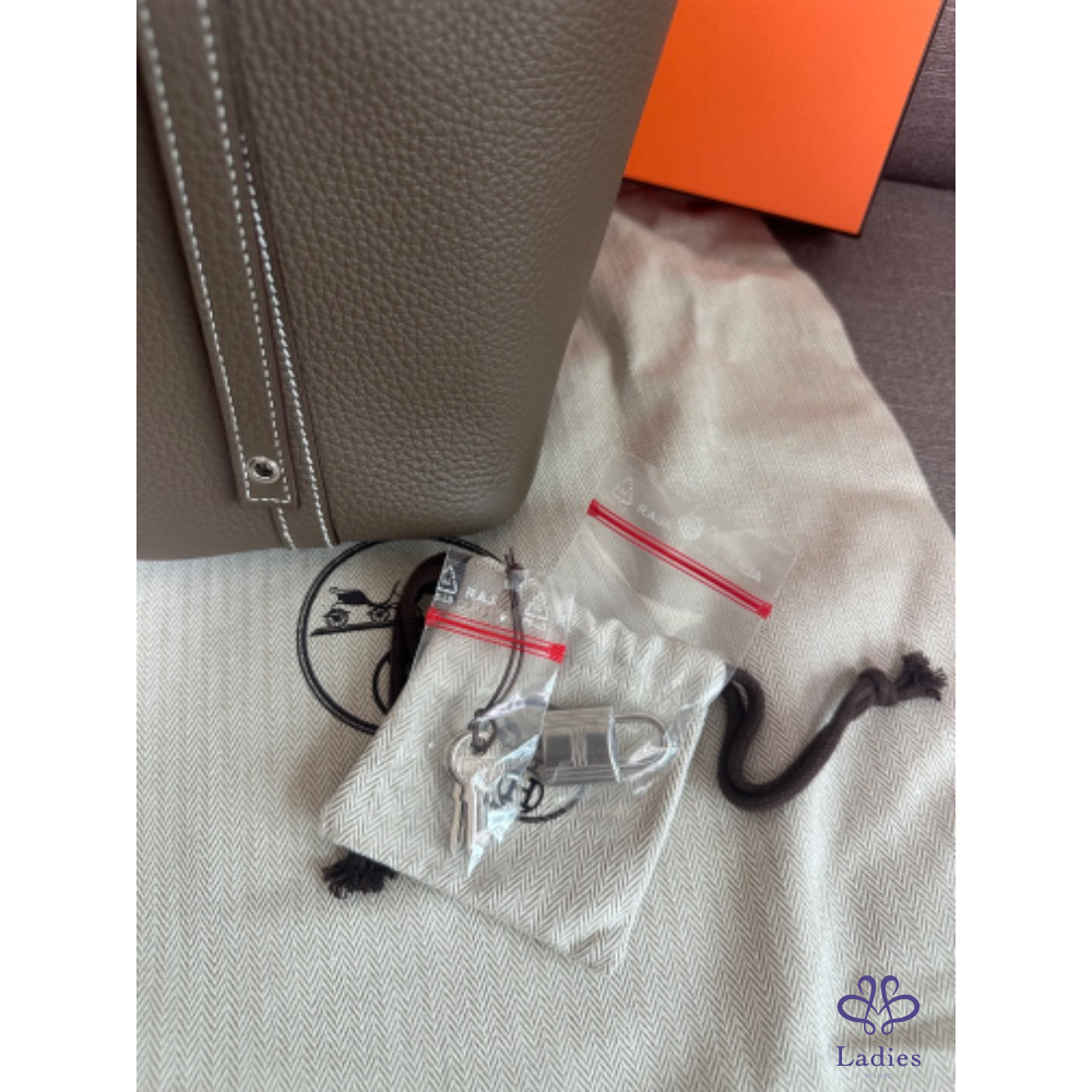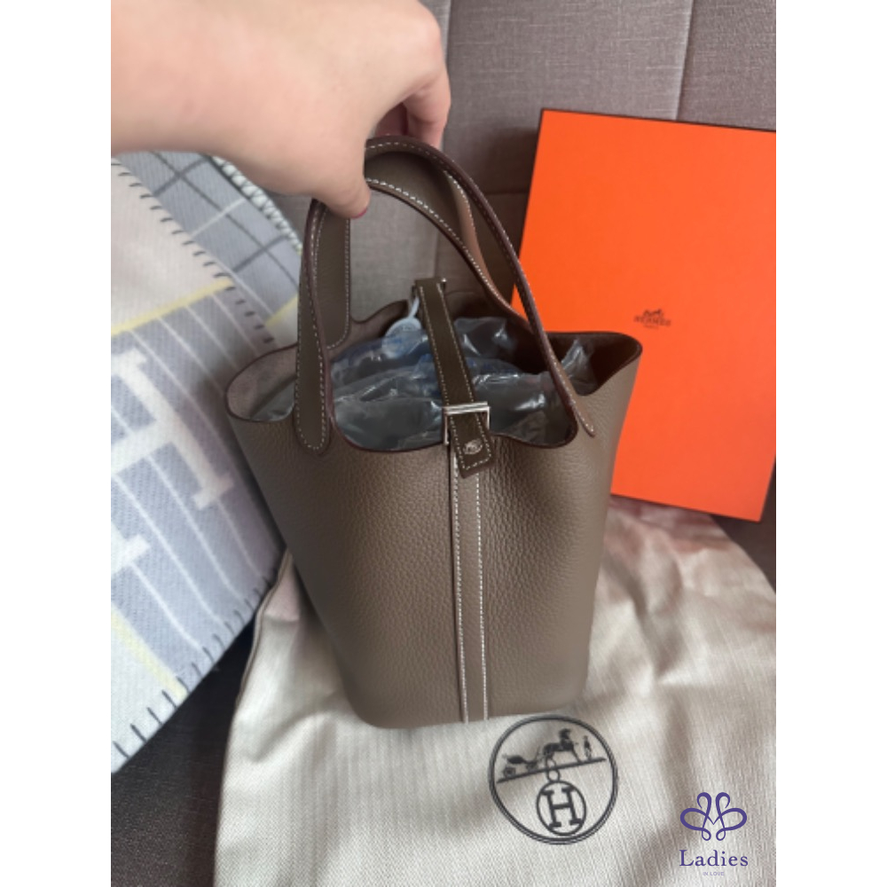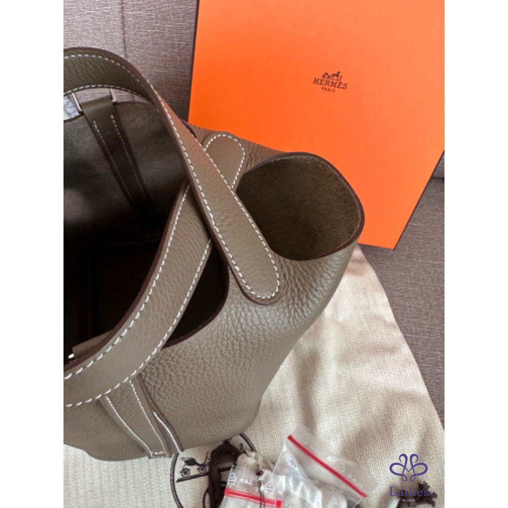 產品信息 Hermes Picotin 18 菜籃 大象灰銀釦 - TC皮/ W刻 - 全新全配 - 2024/9 台灣購證 (有絲巾、小馬可以便宜加購搭配) 照片實拍 鎖扣沒有使用過 商品僅拍照 穿搭照為網路圖 灰銀很瀟灑 附:橘盒、橘袋、購證正本、防塵袋 台北新竹台中面交 宅配、順豐