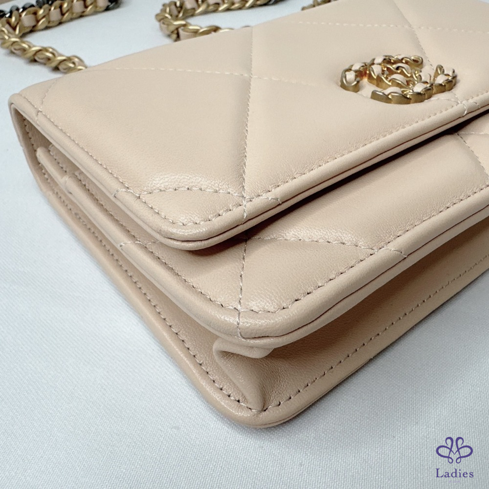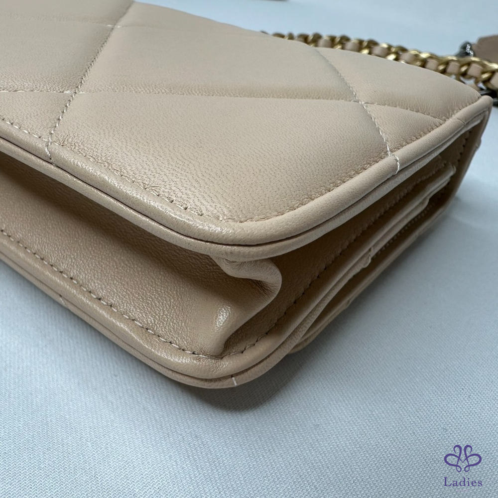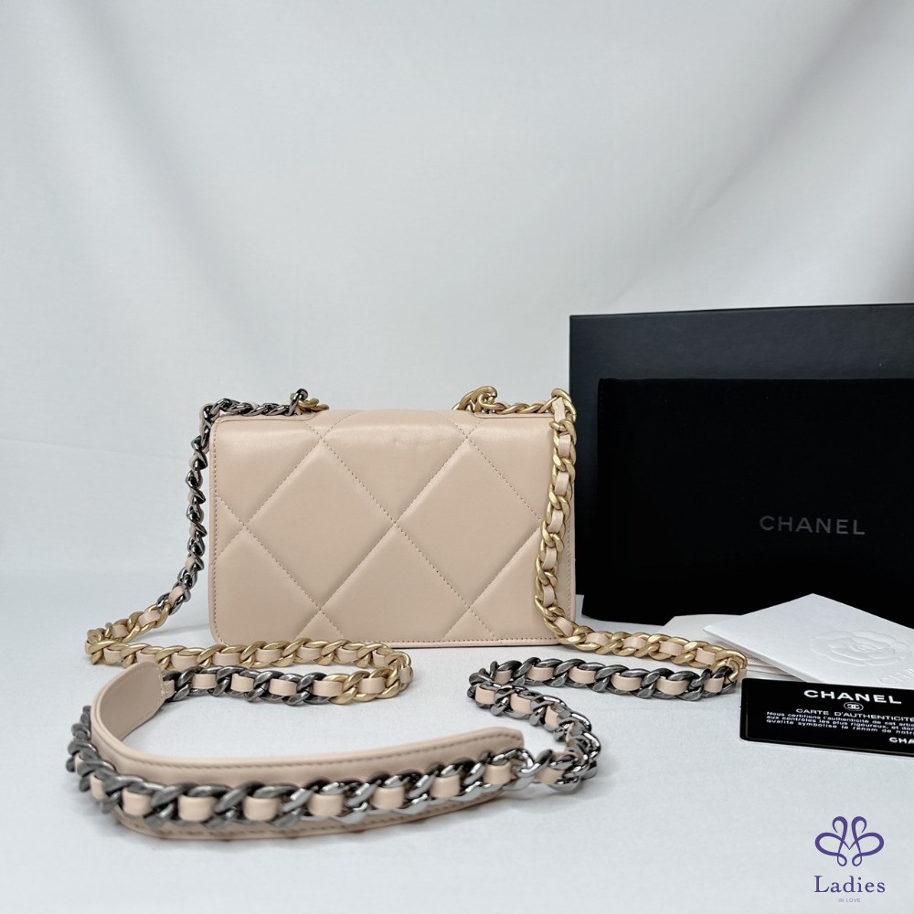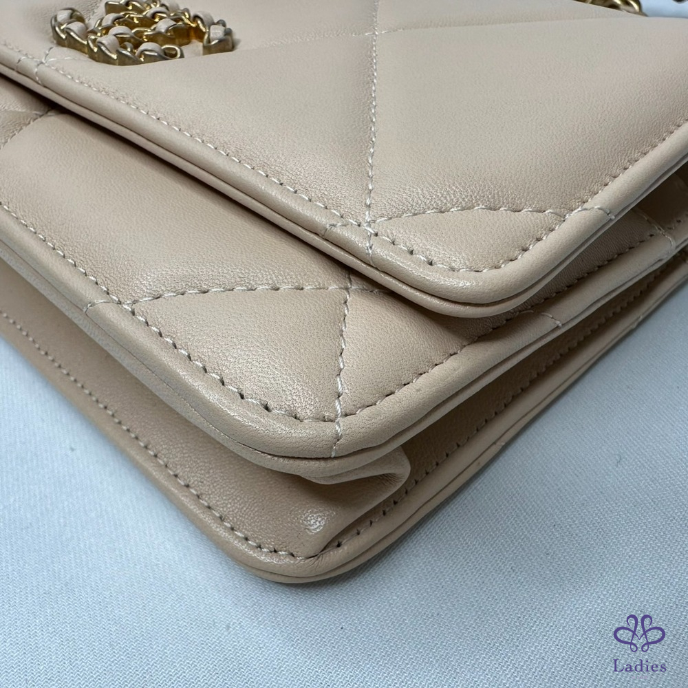 產品信息 【CHANEL 19 淺奶茶色woc鏈帶包】 #31開卡標齊全. #市場超熱門woc款 採用亮面小羊皮製作,翻蓋飾有皮鍊雙C logo 配有復古金色、亮面銀色和釕色飾面金屬的附墊肩拼色鏈帶 ⚜️整體包況約9成新,二手商品均有正常使用/存放痕跡 ⚜️型號:AP0957 ⚜️尺寸:19x12x3cm ⚜️附件:原廠盒、原廠防塵袋、保卡、說明書 #B113082901