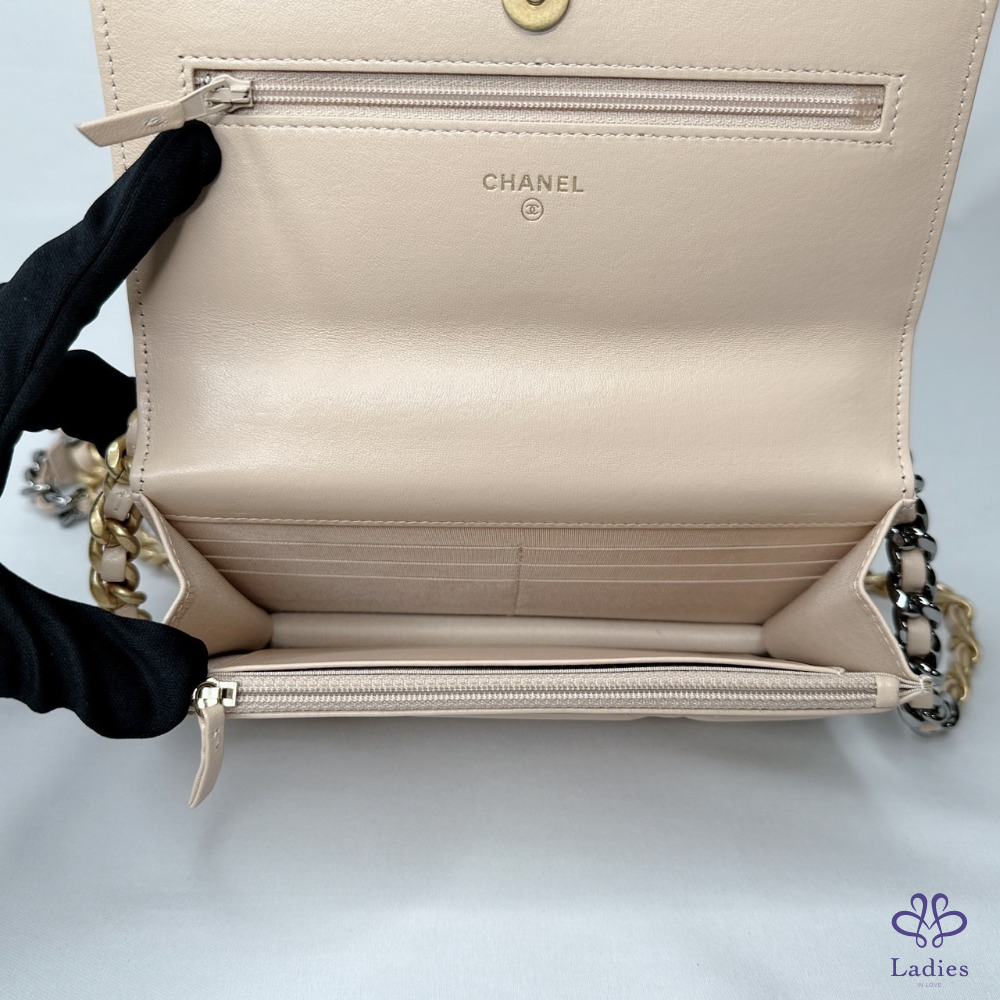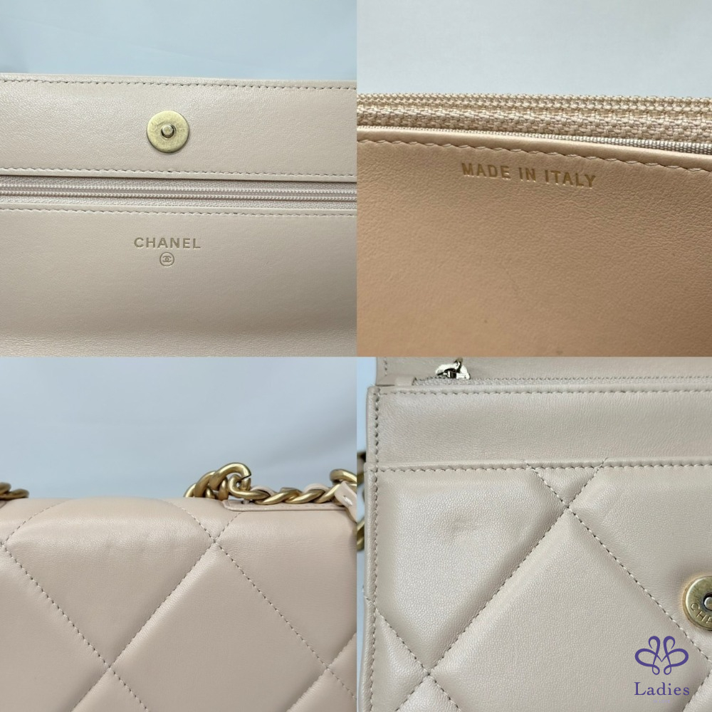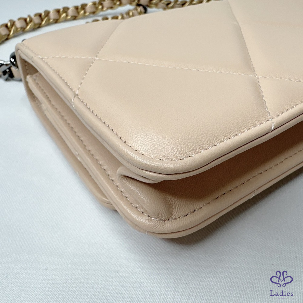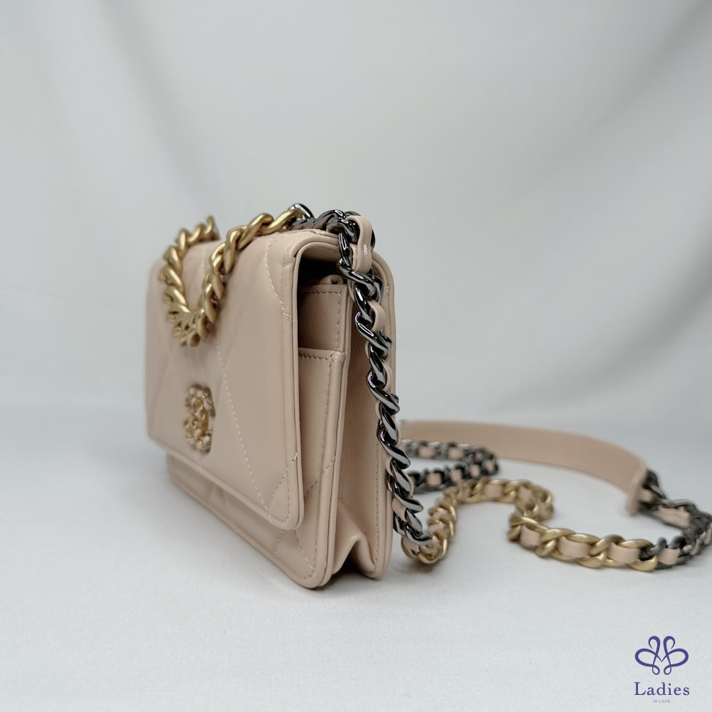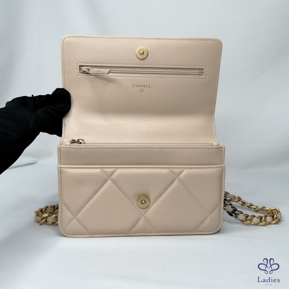 產品信息 【CHANEL 19 淺奶茶色woc鏈帶包】 #31開卡標齊全. #市場超熱門woc款 採用亮面小羊皮製作,翻蓋飾有皮鍊雙C logo 配有復古金色、亮面銀色和釕色飾面金屬的附墊肩拼色鏈帶 ⚜️整體包況約9成新,二手商品均有正常使用/存放痕跡 ⚜️型號:AP0957 ⚜️尺寸:19x12x3cm ⚜️附件:原廠盒、原廠防塵袋、保卡、說明書 #B113082901
