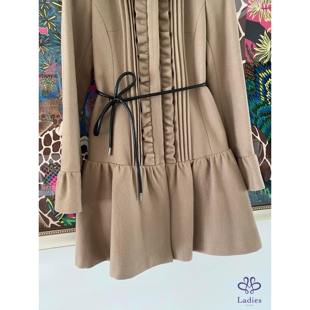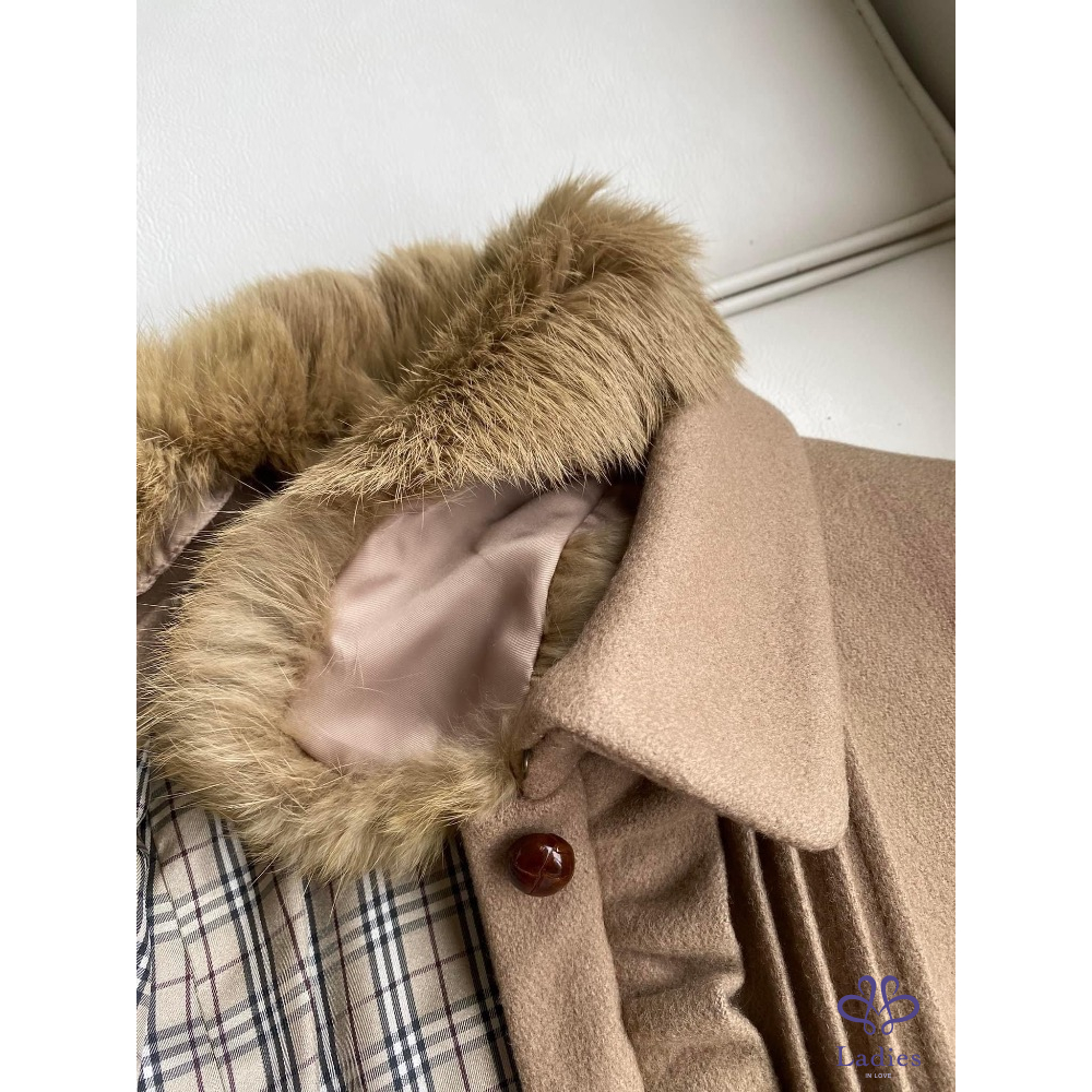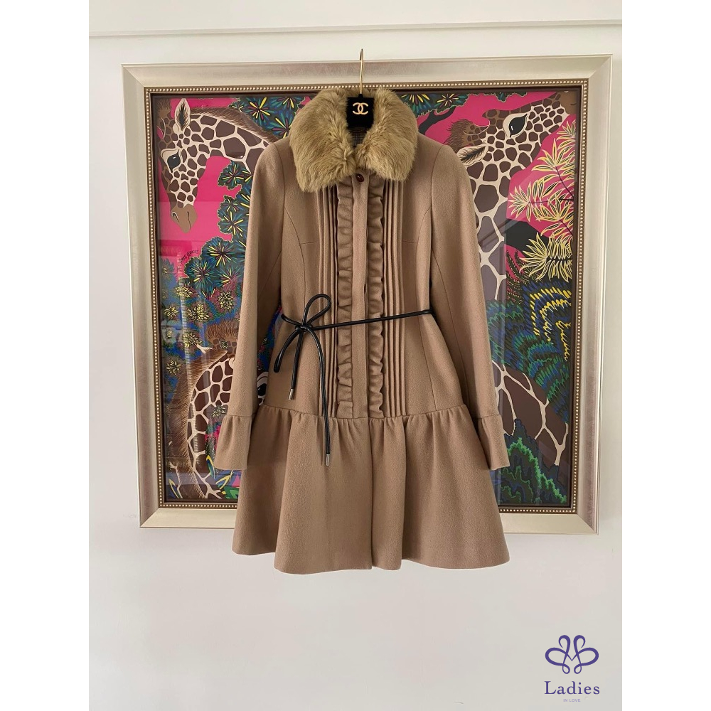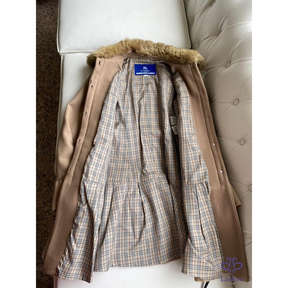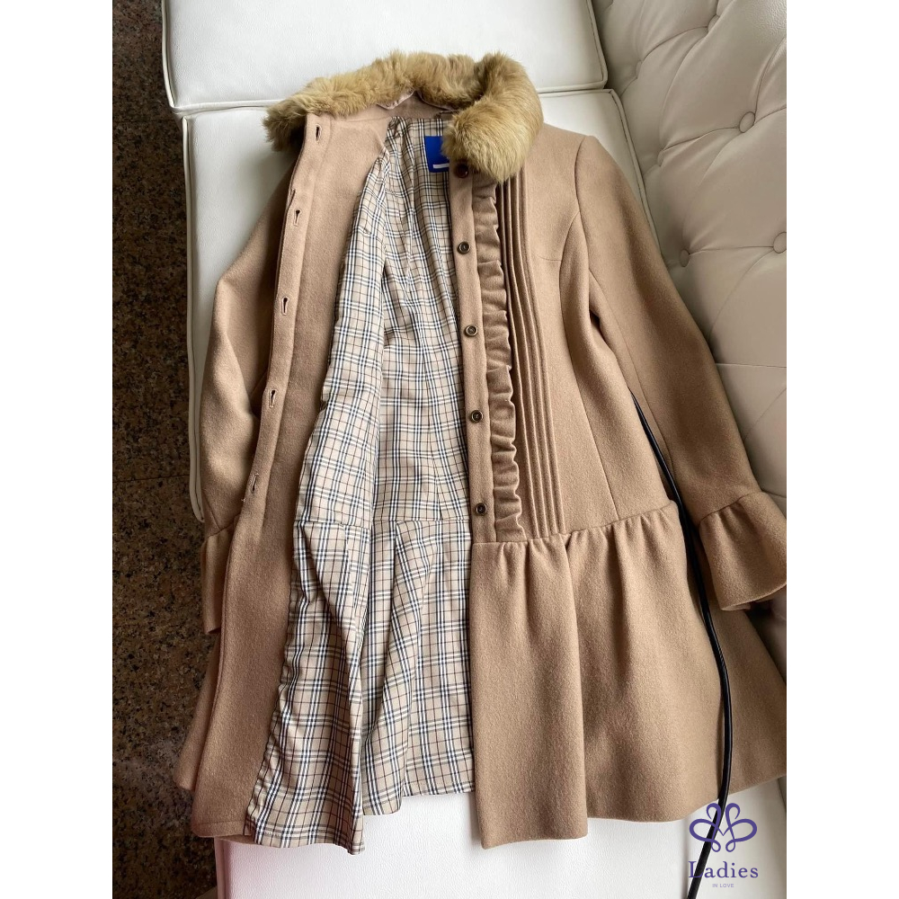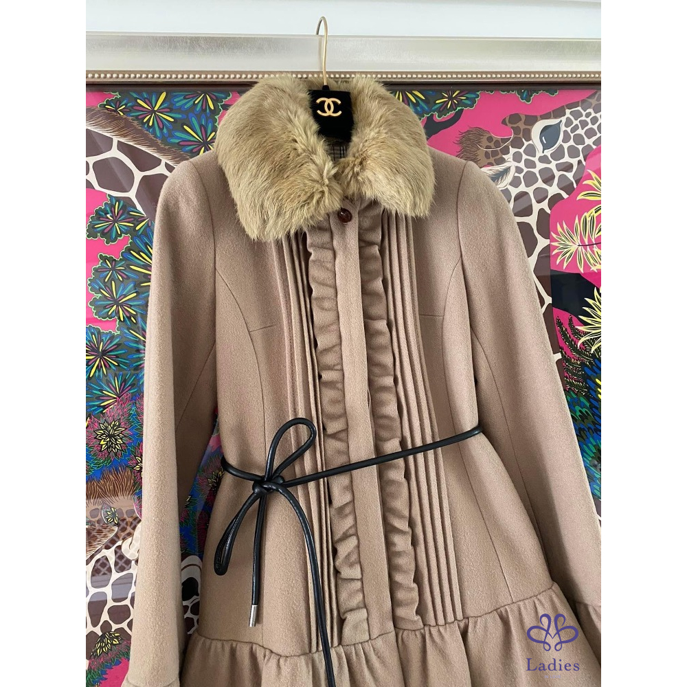 超級美????名媛千金款????BURBERRY???? 高質感 駝色 荷葉邊 皮草領 洋裝式外套