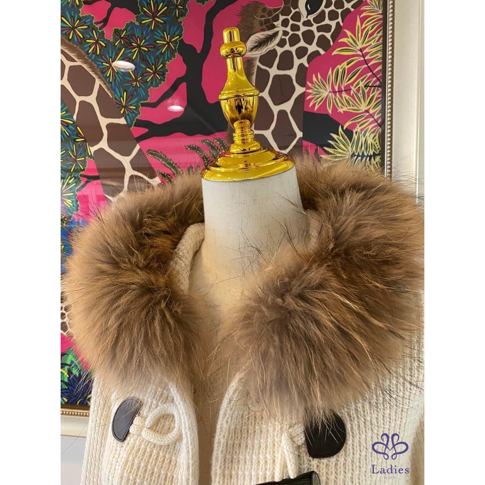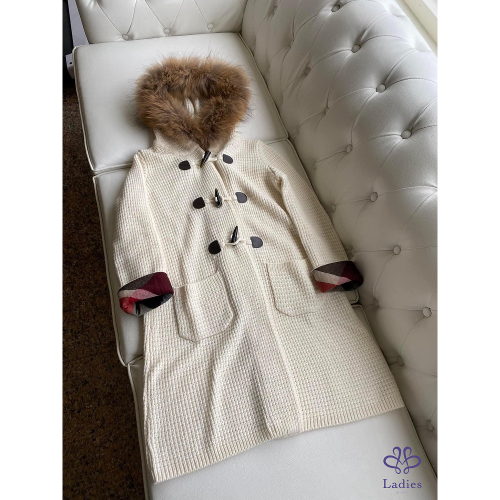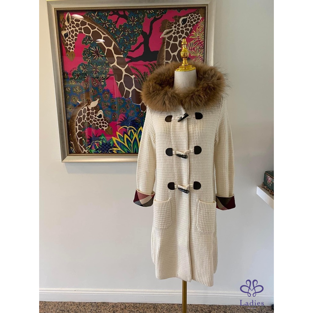 千金公主款????BLUE LABEL CRESTBRIDGE藍標Burberry 白色 浣熊皮草領 輕柔羊毛 牛角扣外套(毛毛領可拆)