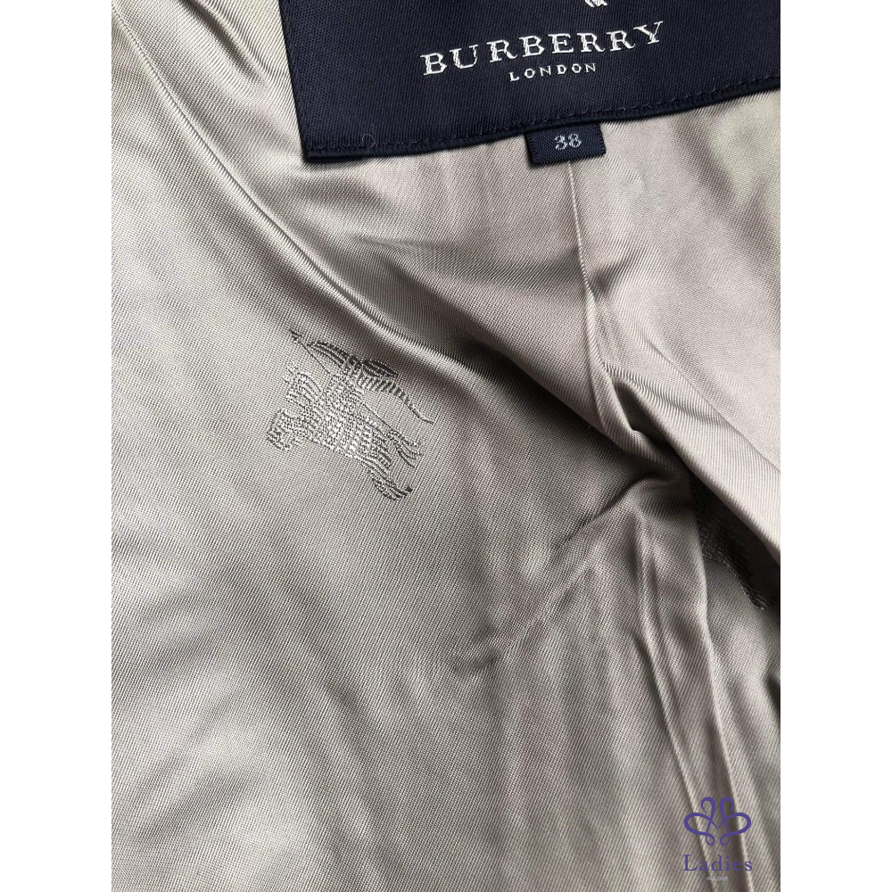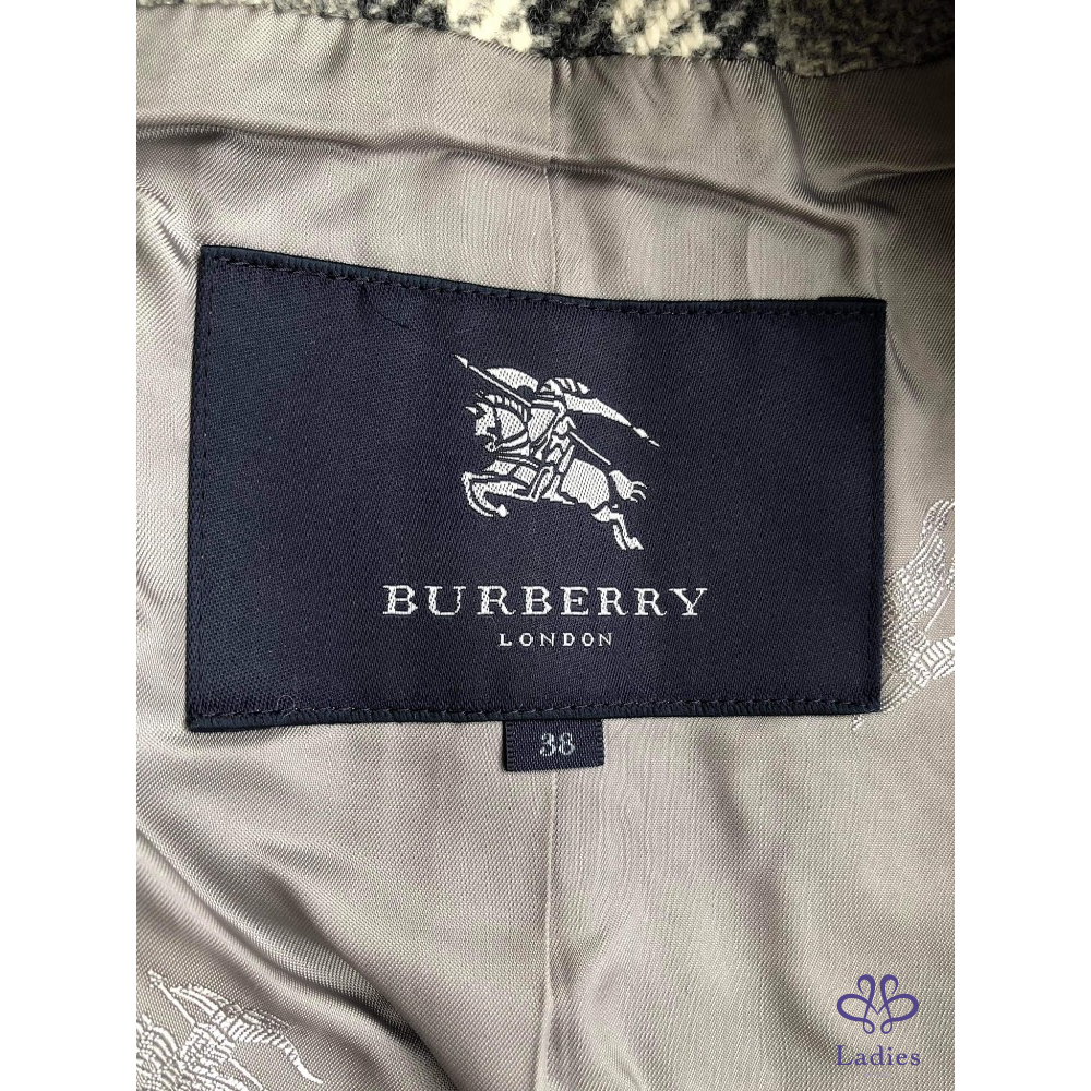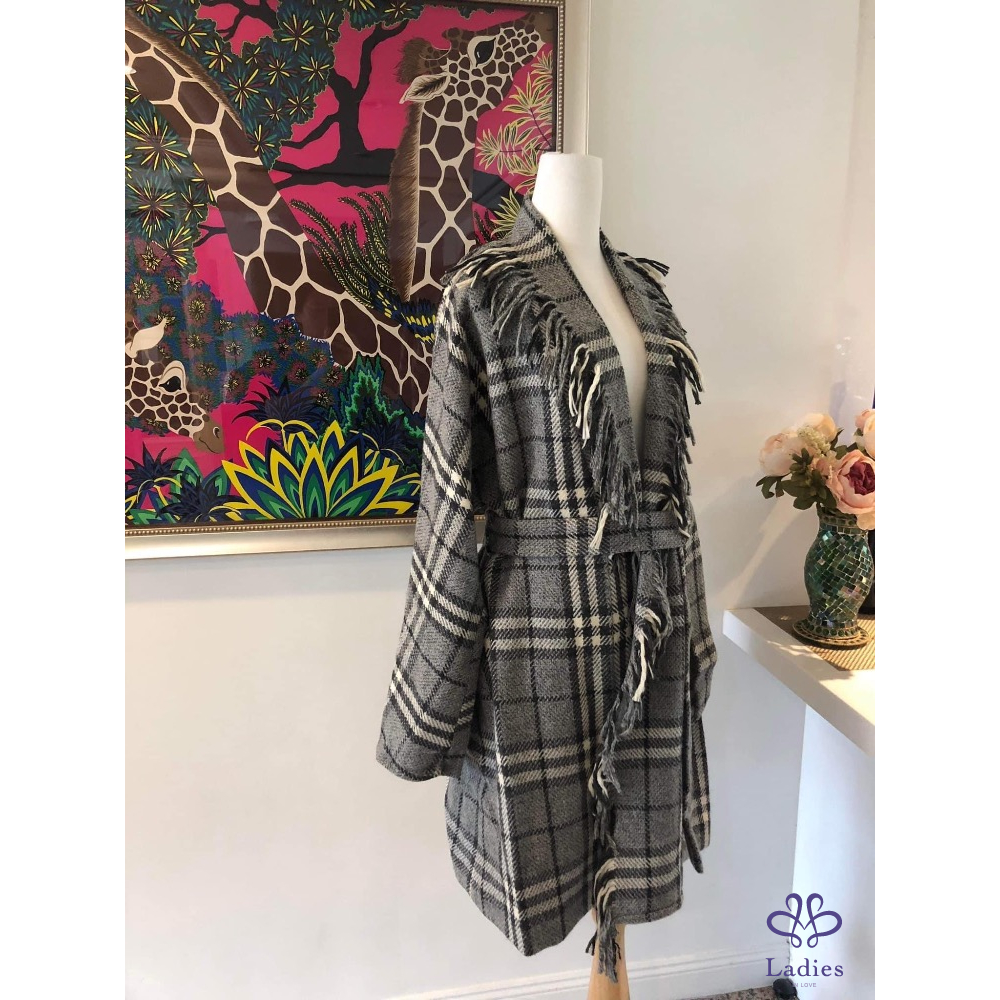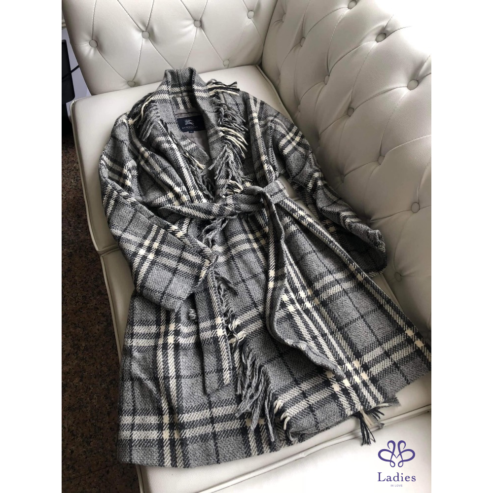 極美特殊款????BURBERRY LONDON 倫敦標灰色經典格紋 流蘇領飾羊毛長大衣