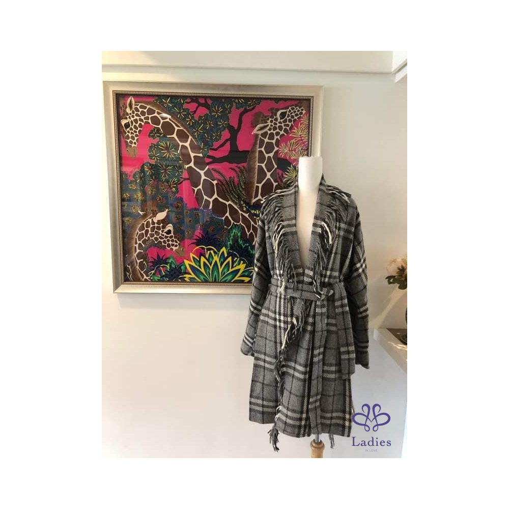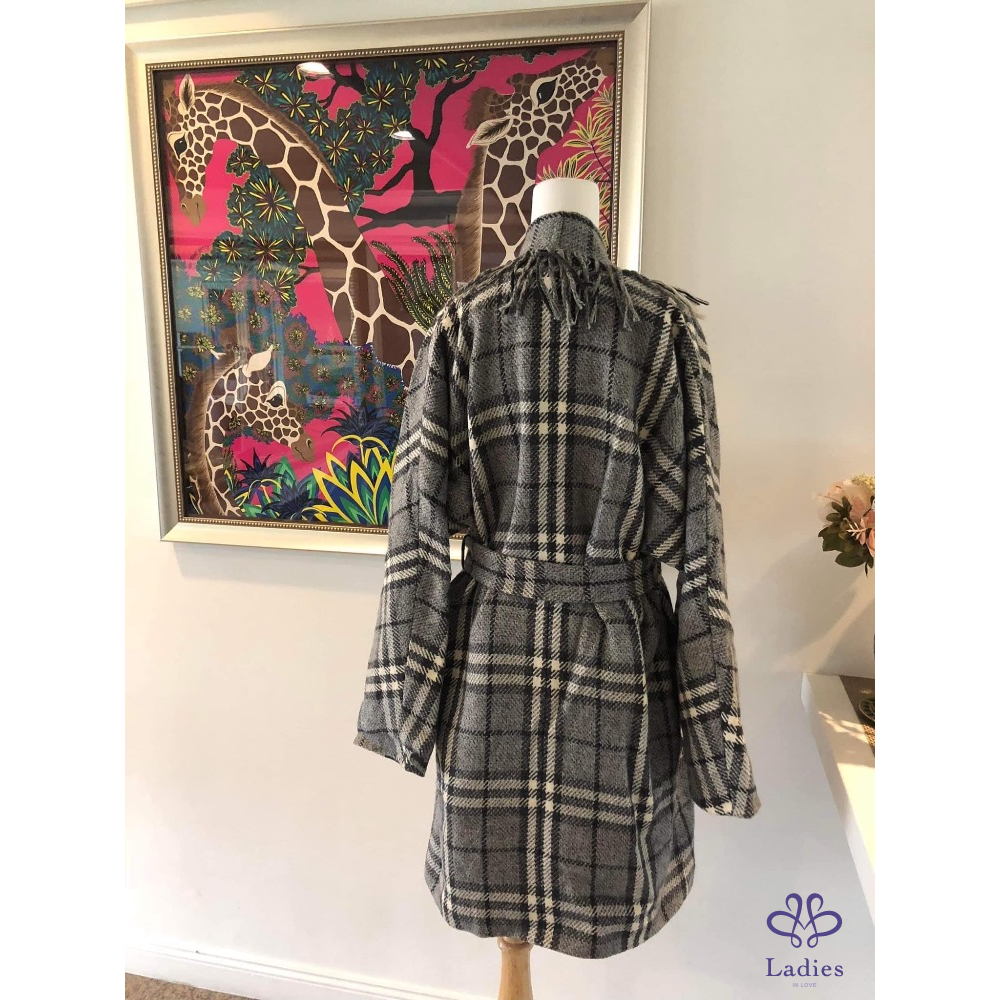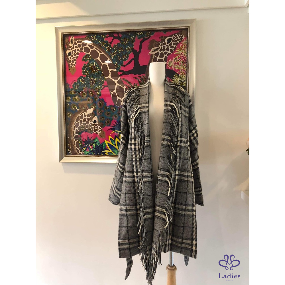 ????經典款格紋羊毛大衣,最特別在於流蘇領設計,就像是多披上一條圍巾的感覺。保暖羊毛衣身,精緻戰馬絲質內裡,必入手外套。