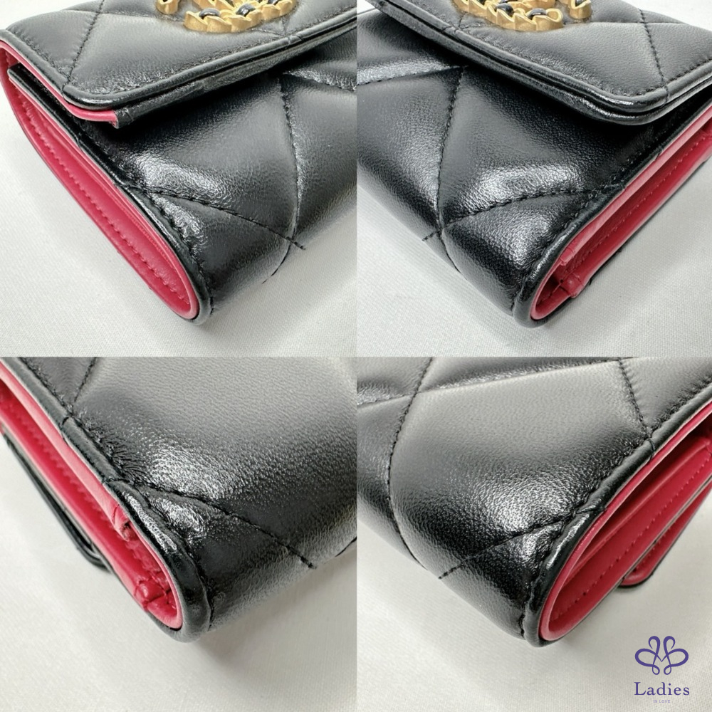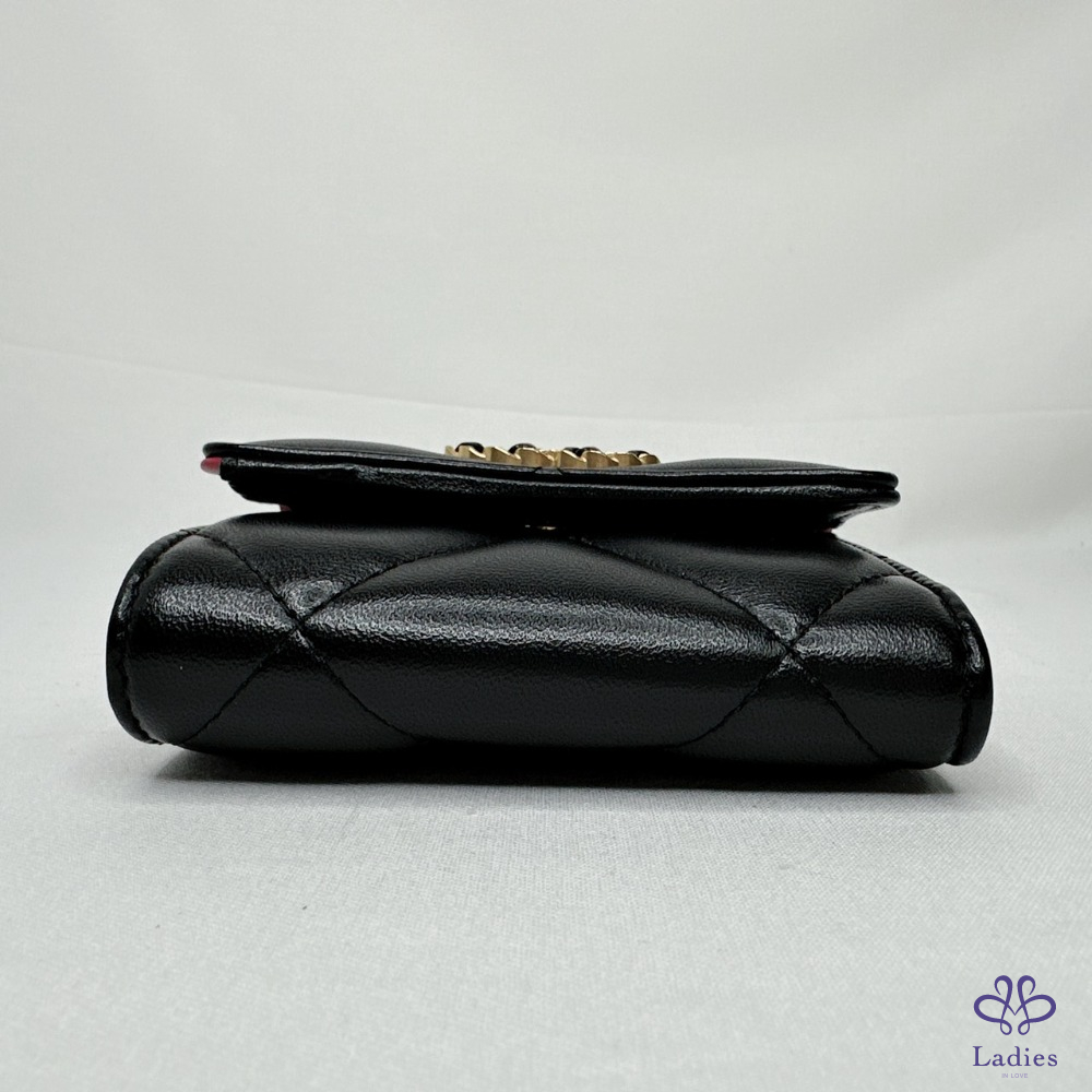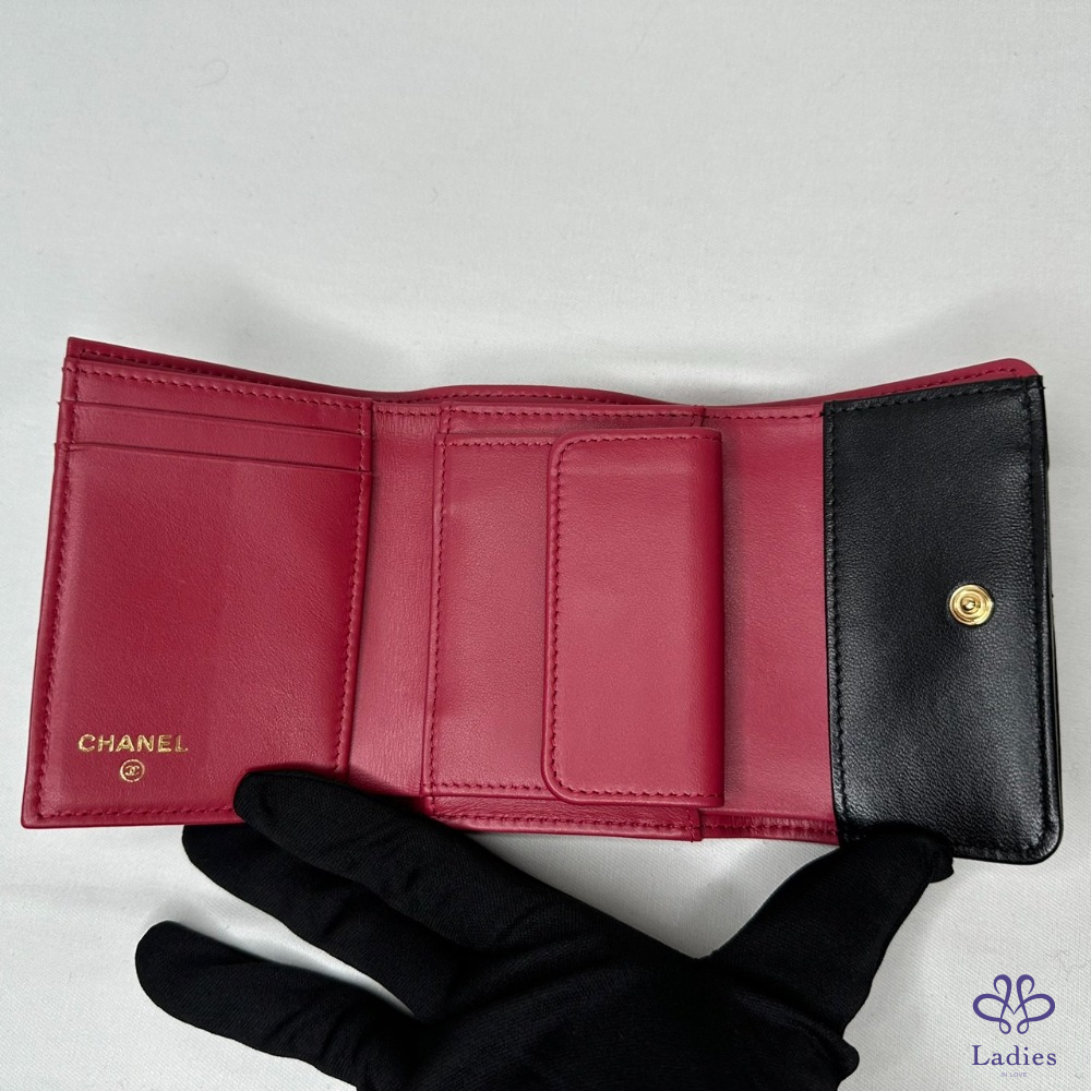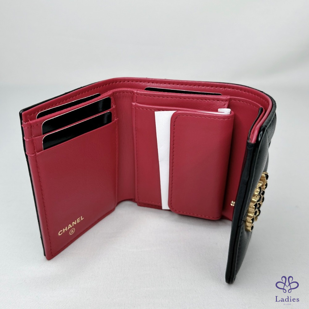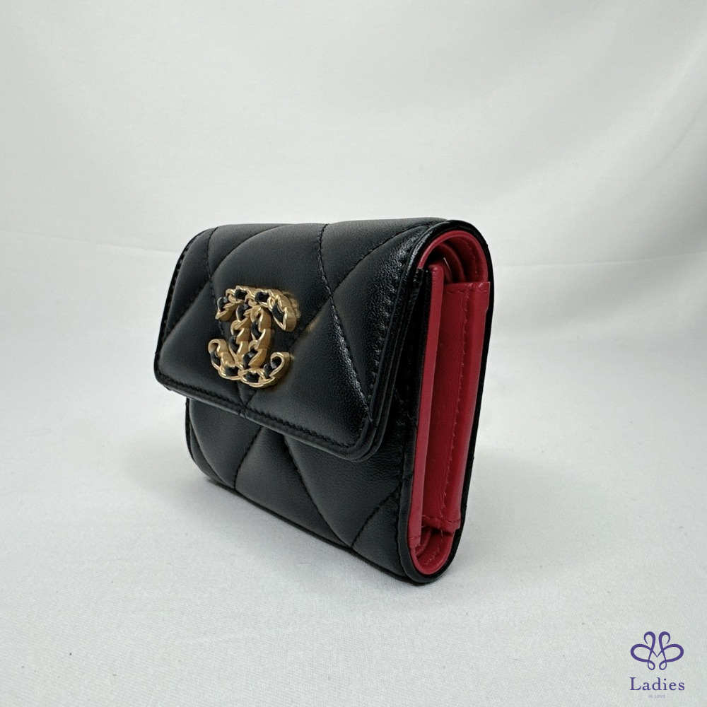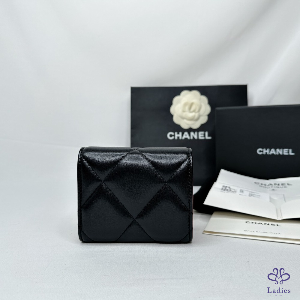 產品信息 【CHANEL 19黑金羊三折短夾】 四個卡夾層・兩個側貼袋可放車票、單據 一個鈔票隔層・一個按扣口袋 整體包況約9成5新,二手商品均有正常使用/存放痕跡 型號:AP1788 尺寸:10.5x8.7x4cm 附件:原廠盒、原廠紙袋、原廠防塵袋、台灣購證(去個資)、說明書 #B113101601