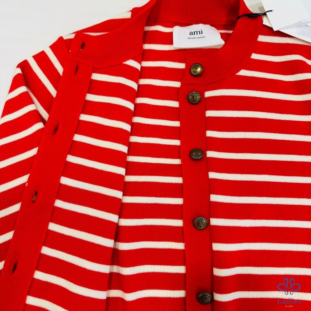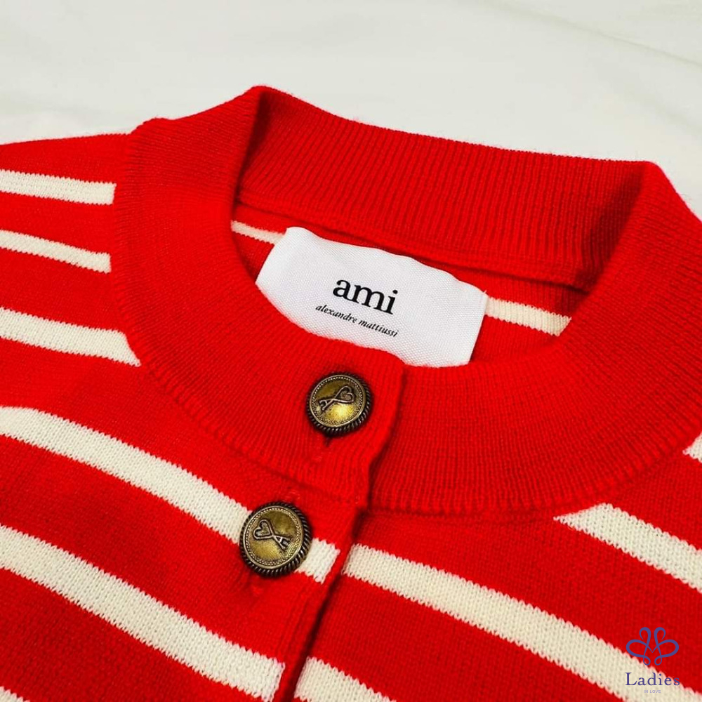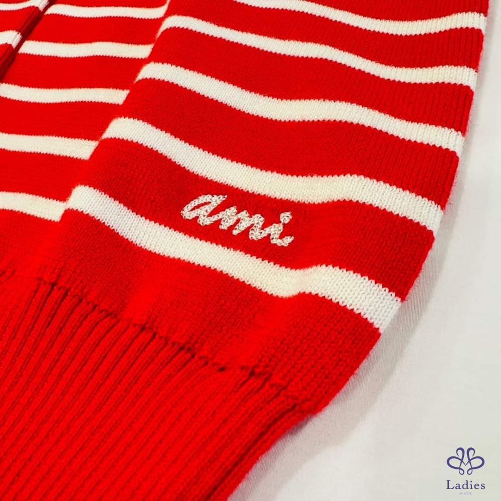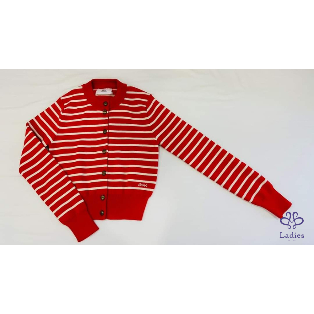 售 Alexandre Mattiussi AMI Paris Cardigan 草寫字母紅白條紋撞色顯瘦針織開襟外套/開衫/上衣/毛衣/衣服