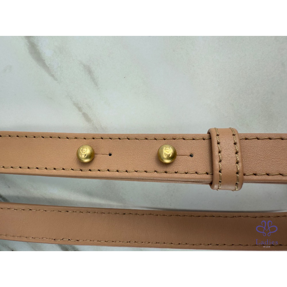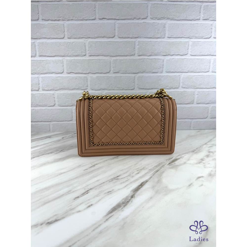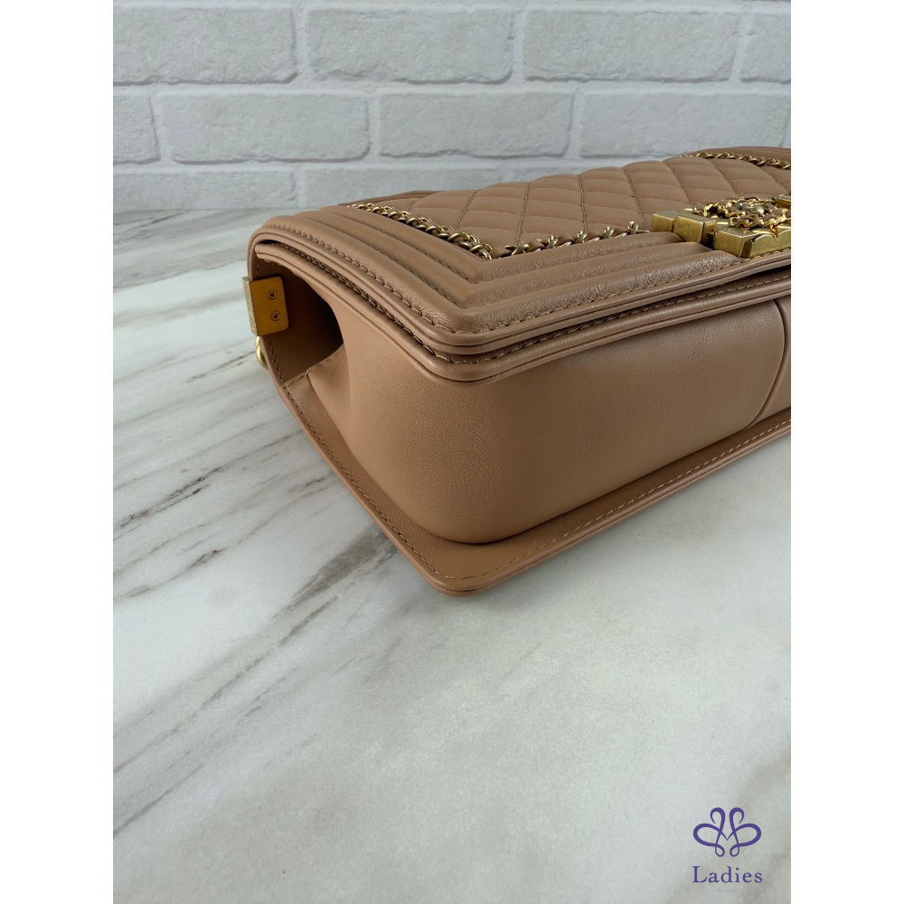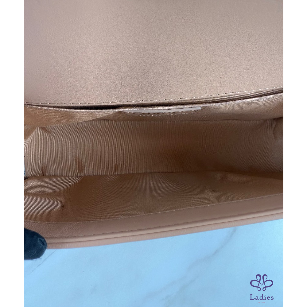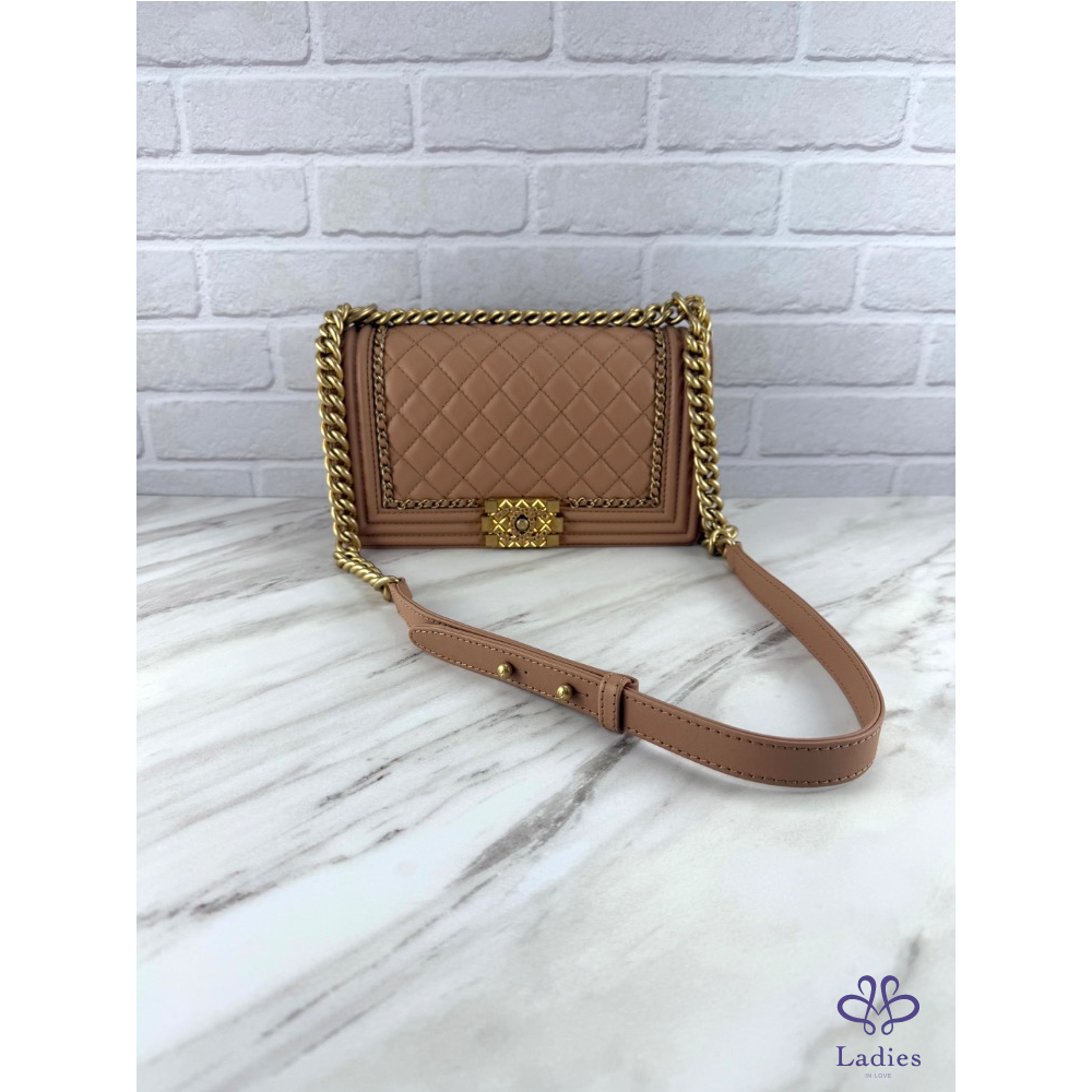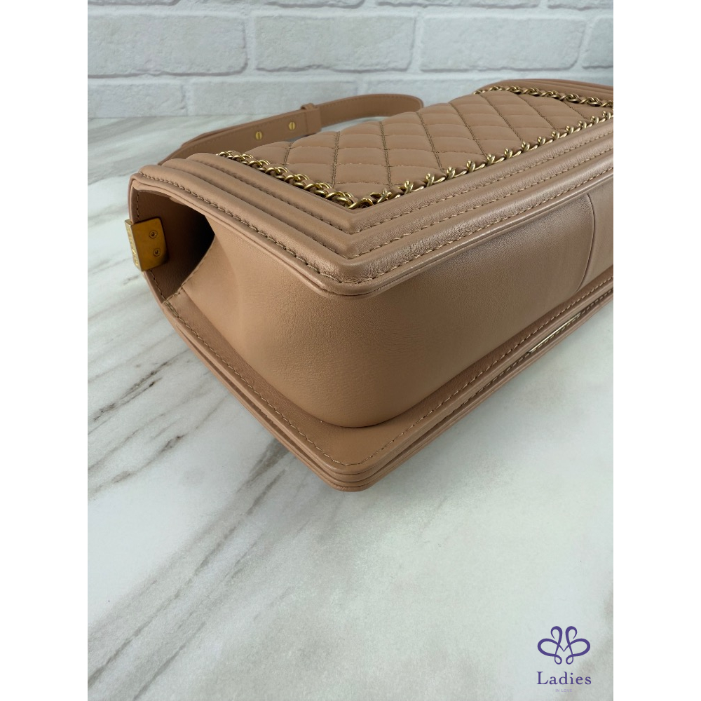 香奈兒Chanel 限量款 Boy 25 公分 奶茶色/ 奶棕色 牛皮 皮穿鍊鑲邊 霧金釦