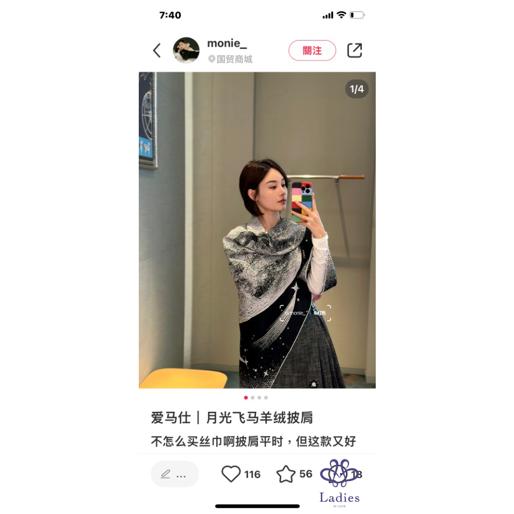 產品信息 Hermes愛馬仕羊絨圍巾-月光飛馬-140*140 羊絨圍巾(方巾)的天花板 愛馬仕獨有的精緻美麗的圖案 圍起來美麗大方又低調 櫃上一條難求 尺寸大可當圍巾也可以當披肩 材質Cashmere輕薄柔軟舒適 四季皆可用,且方便攜帶 售價:39800(原價41400,現在又漲過兩次價了) 全新全配