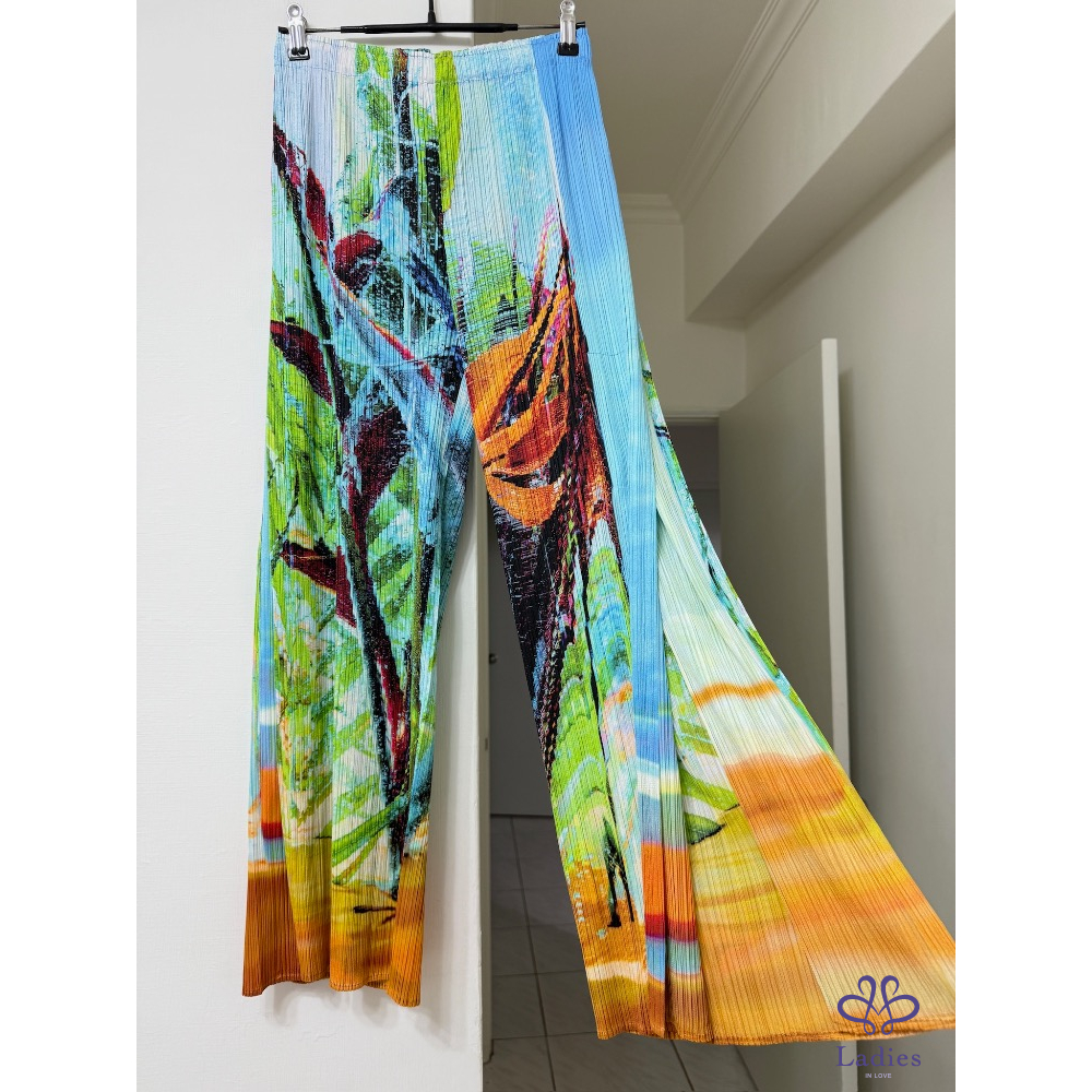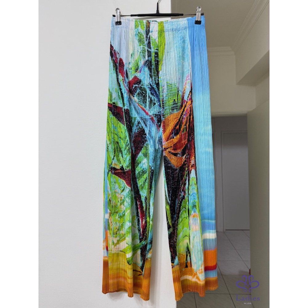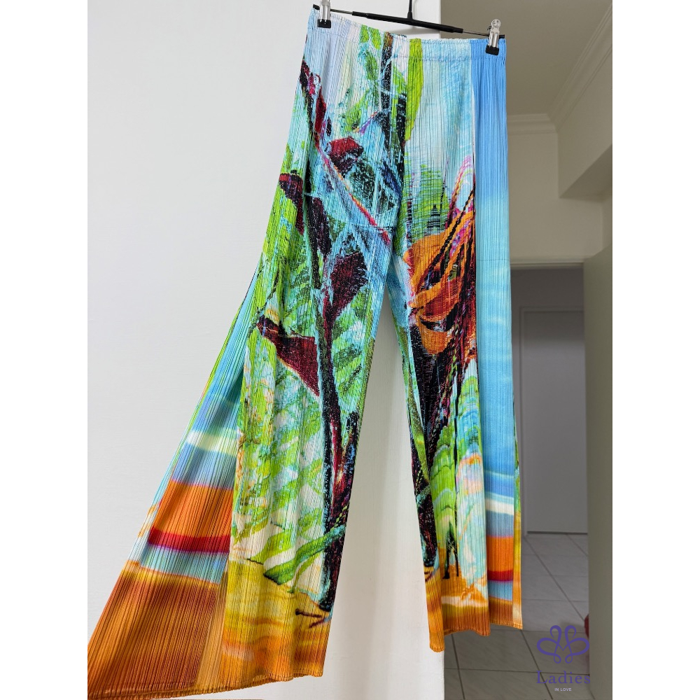 售三宅一生Pleats Please 南國冰晶花霧皺褶寬褲,23年7月經典款, 融入空氣中飄揚的印花靈感,帶有優雅質感,與同色系單品或是相近色搭配,顯現白皙好氣色,營造出眾高級感;