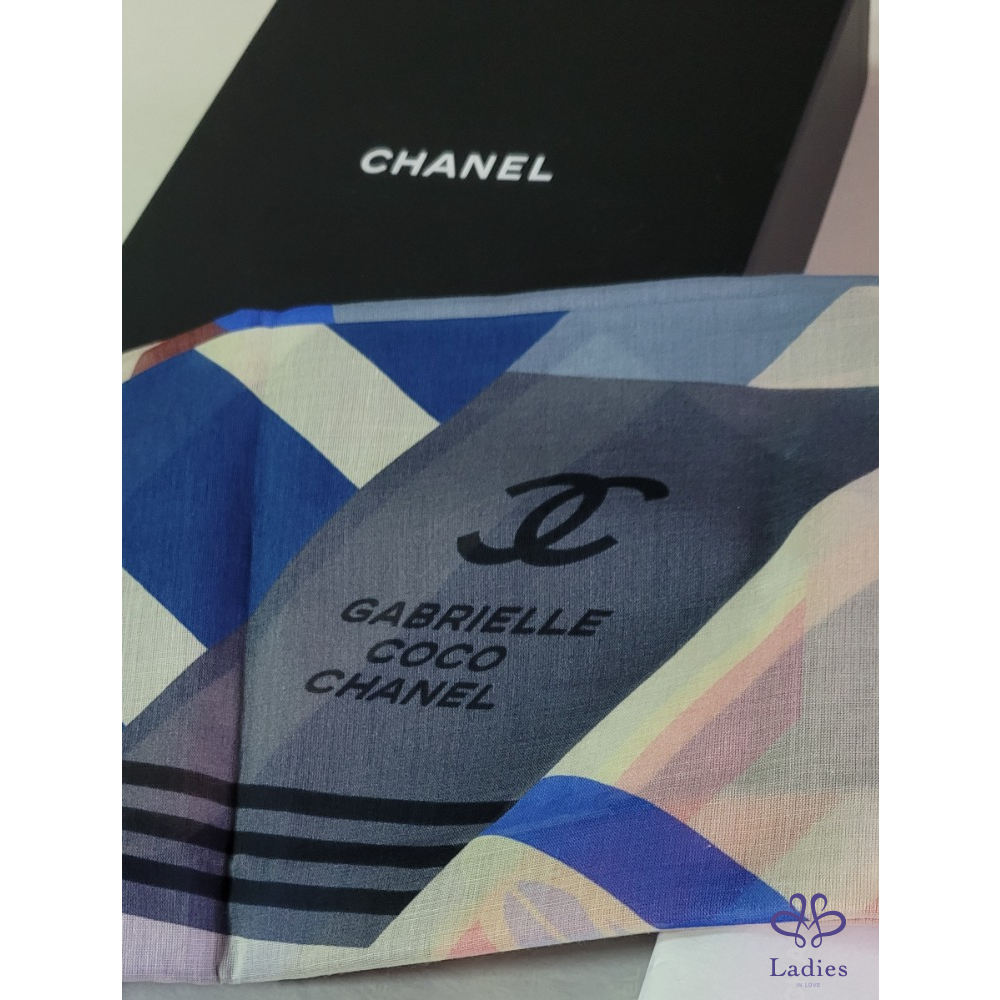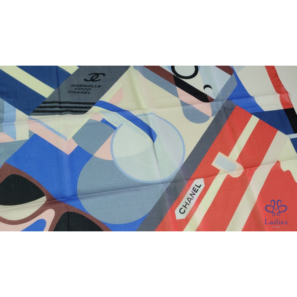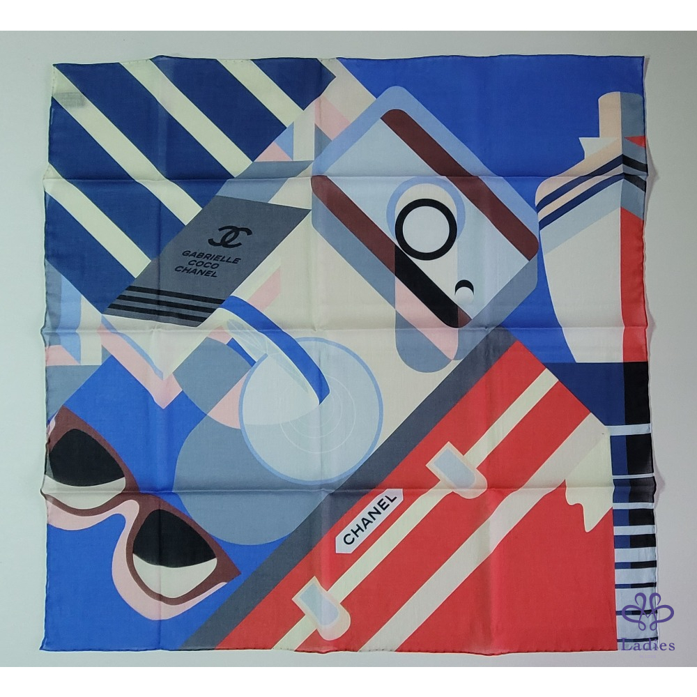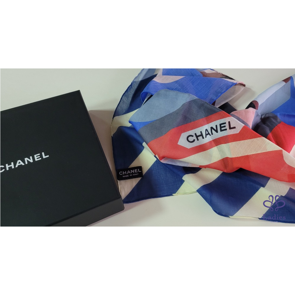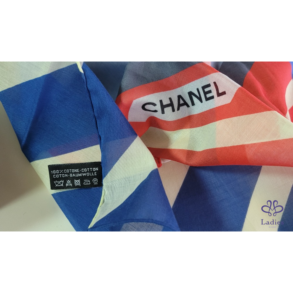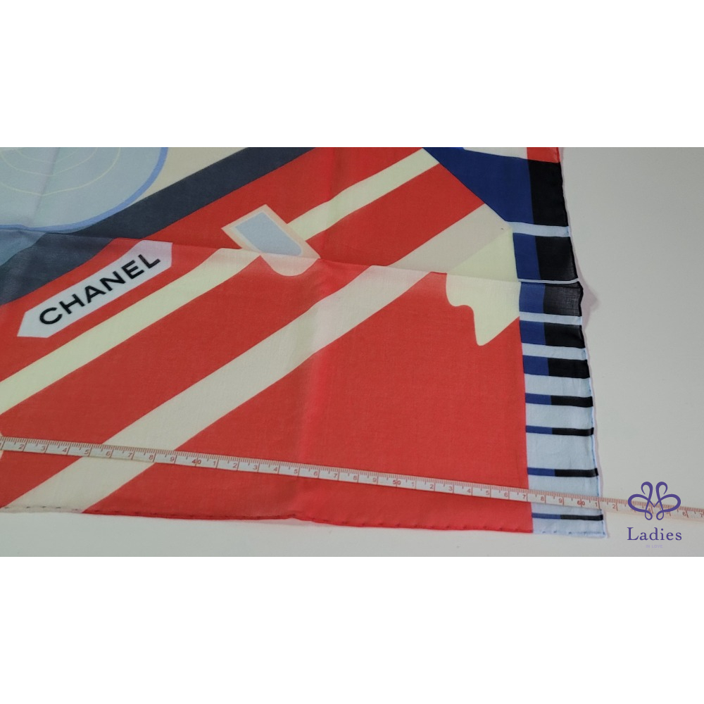 ~CHANEL 未使用品 紅藍白條紋圖案62cm絲巾