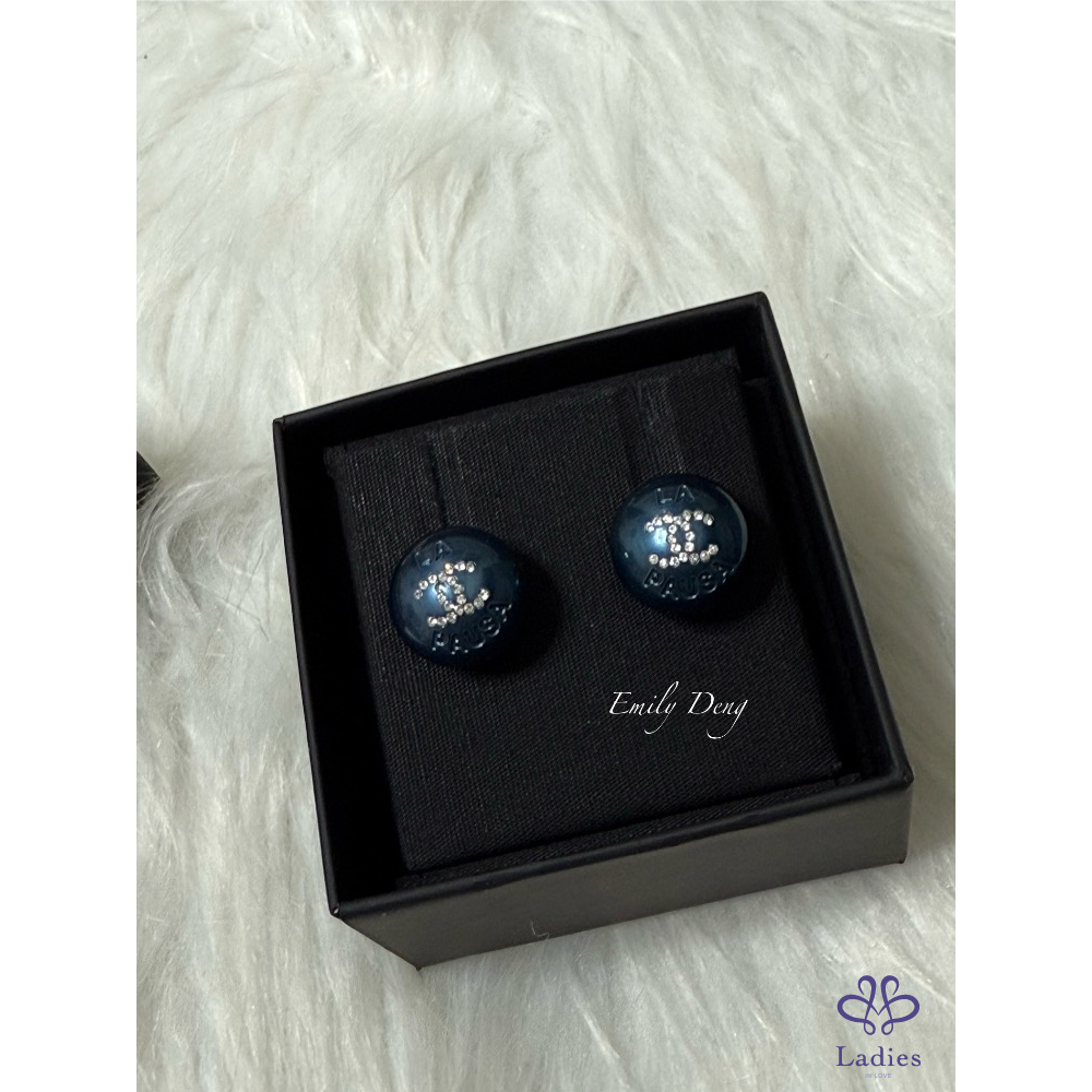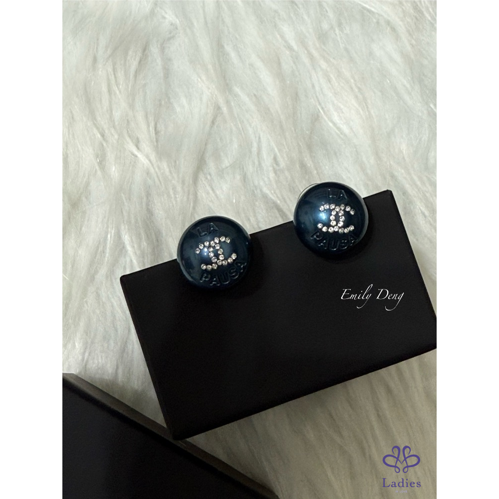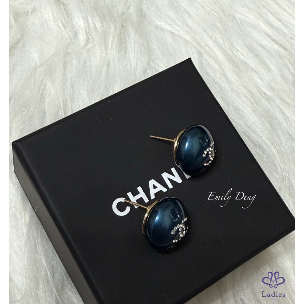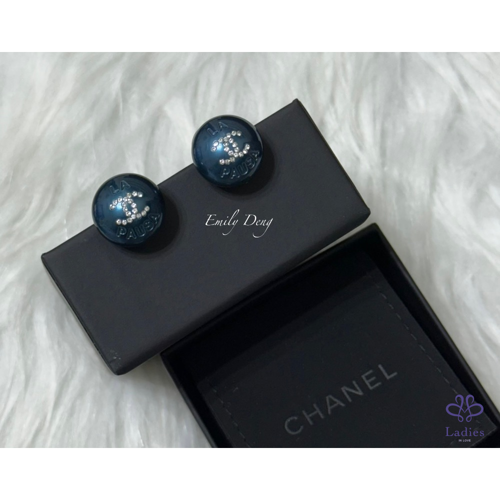 售# Chanel 藍色珍珠鑲嵌雙C水鑽耳環