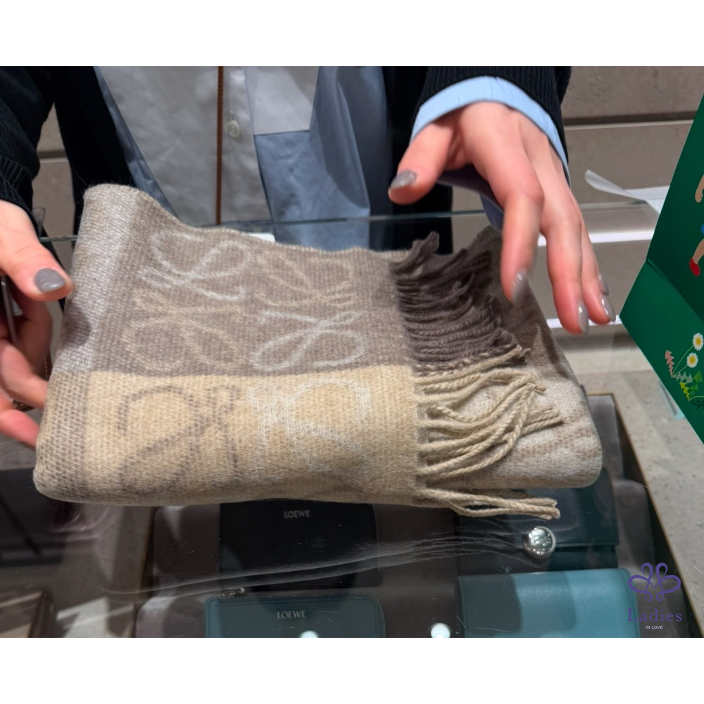 產品信息 Loewe 經典款圍巾 全新 - 燕麥 奶茶 米色 - 羊毛/cashmere - 全新全配 - 180x38cm 全配附專櫃包裝紙(稍破了一個小洞如圖)、紙袋、購證去個資 台北新竹 面交 順豐、郵寄