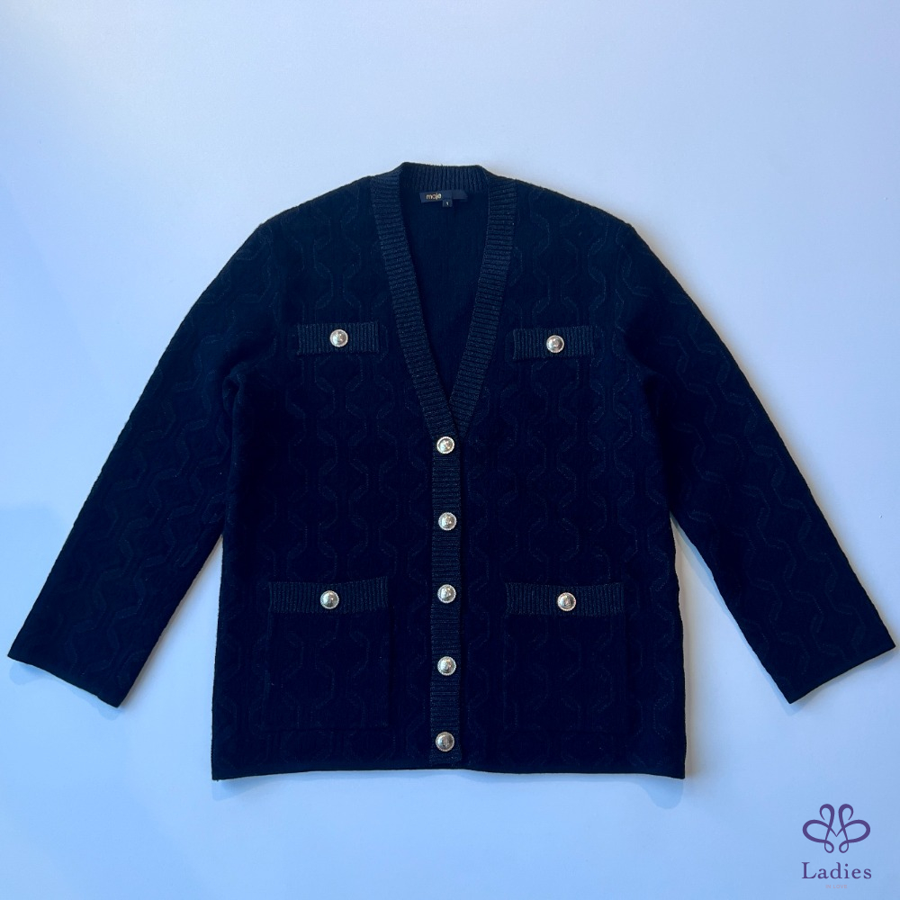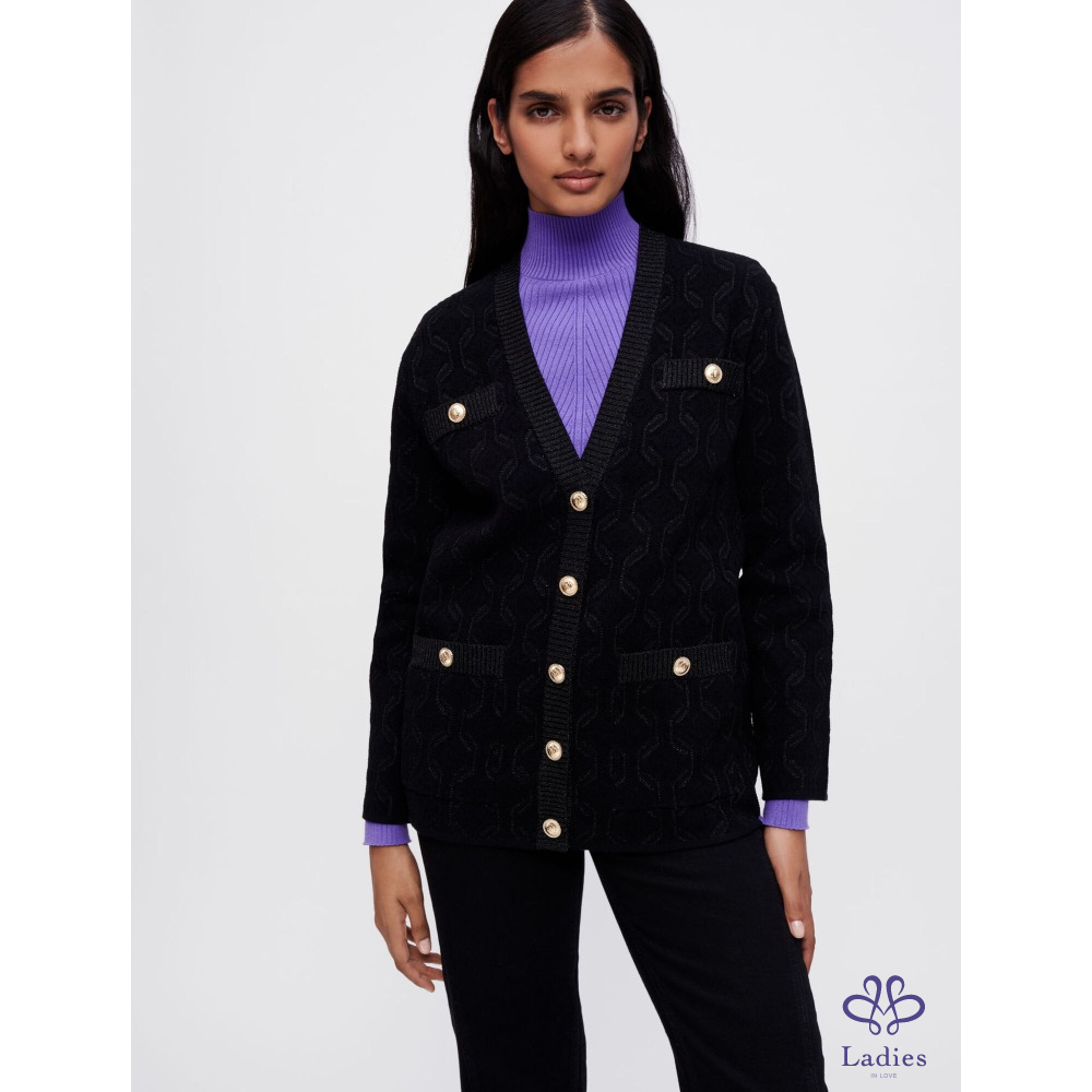 產品信息 這件黑色針織外套充滿小香風的高級感,幾何立體提花圖案低調又有質感,細節超加分!金色鈕扣設計更是畫龍點睛,帶出一點小奢華的氛圍,穿上就自帶氣場。前面的四個口袋設計不只增加層次感,也多了幾分時髦感,秋冬搭配洋裝或是牛仔褲都很OK,隨便穿都很有品味!