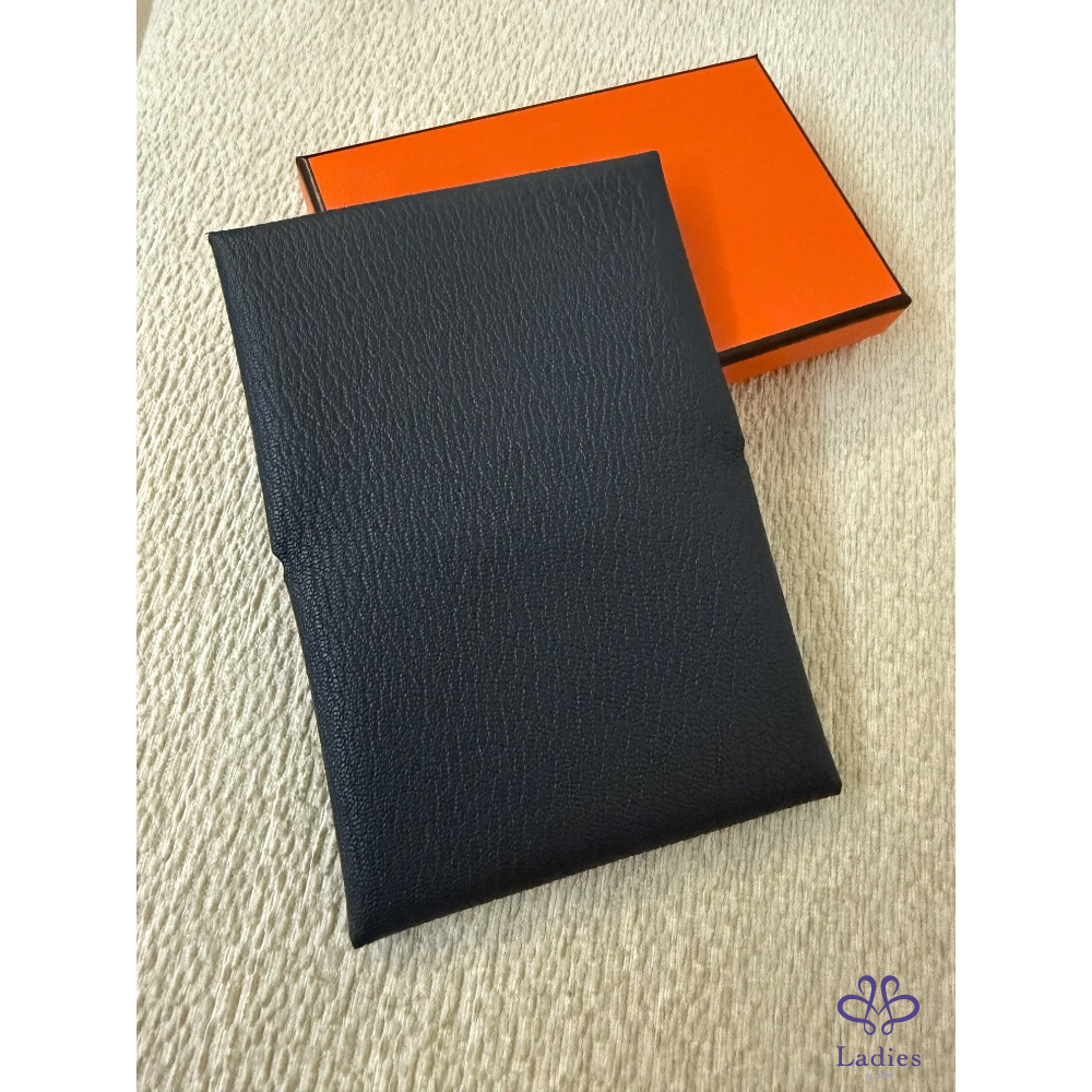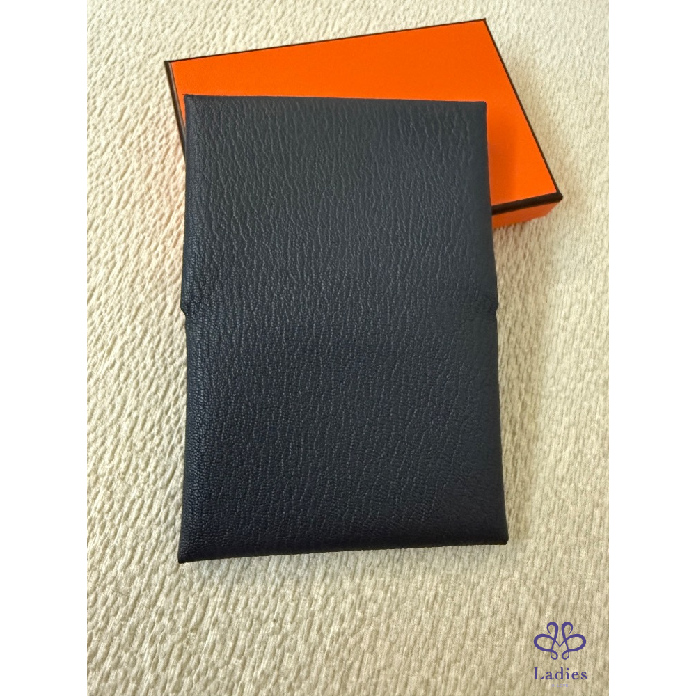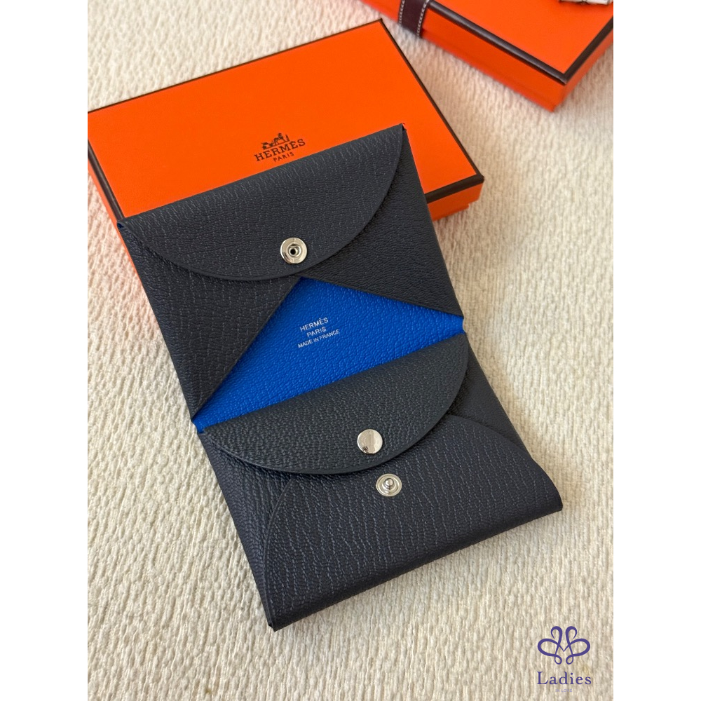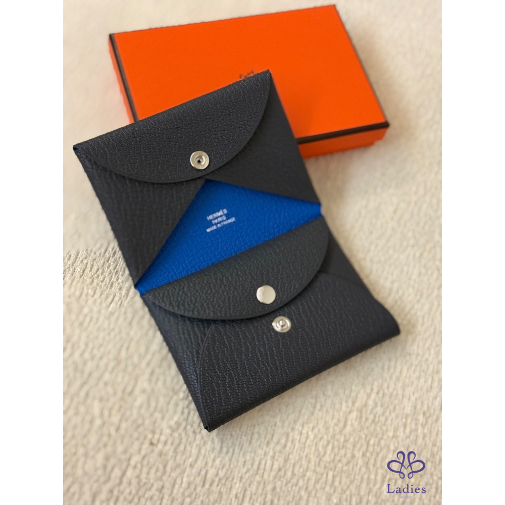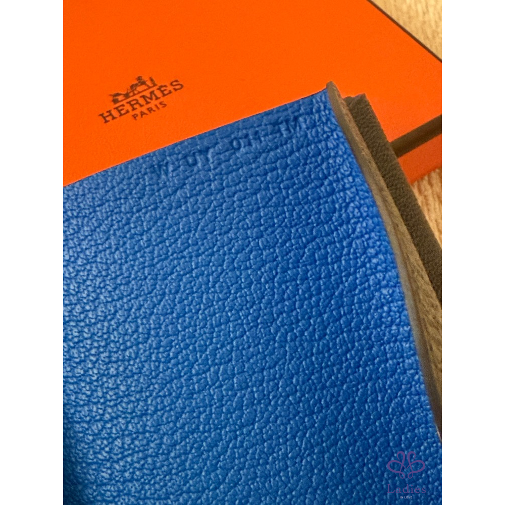 全新全配 2025 W Hermes Calvi Duo 山羊皮卡夾 石板灰內拼藍