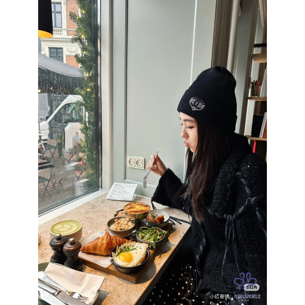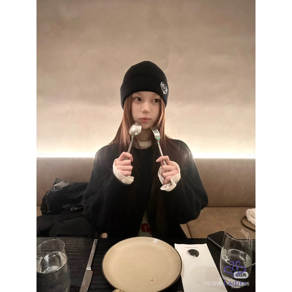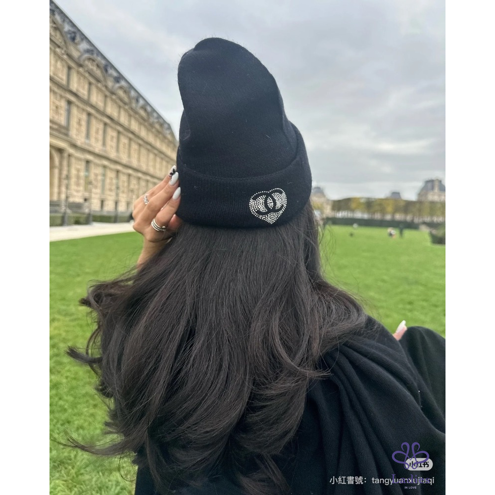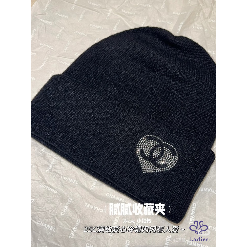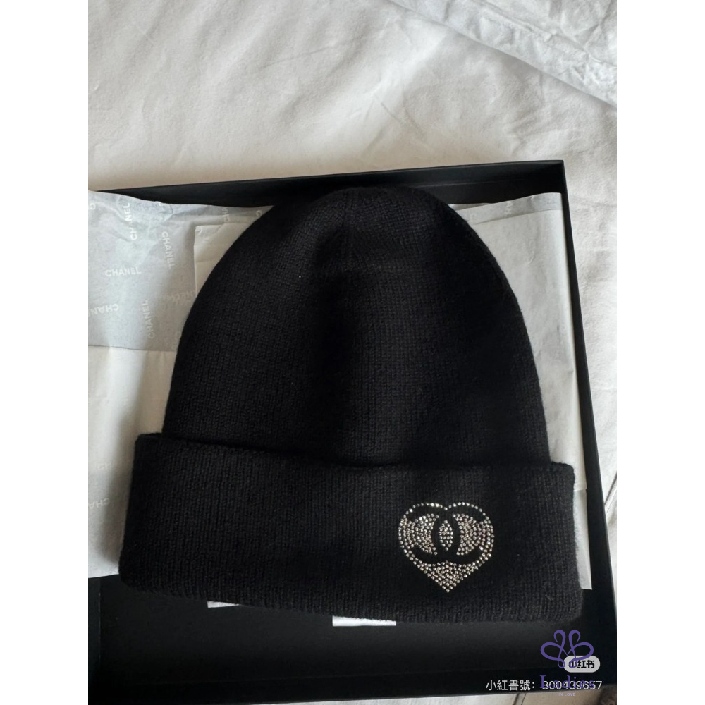 首頁 精品配件 全新 Chanel 水鑽愛心外雙C logo 黑色喀什米爾毛帽