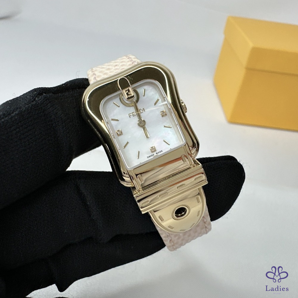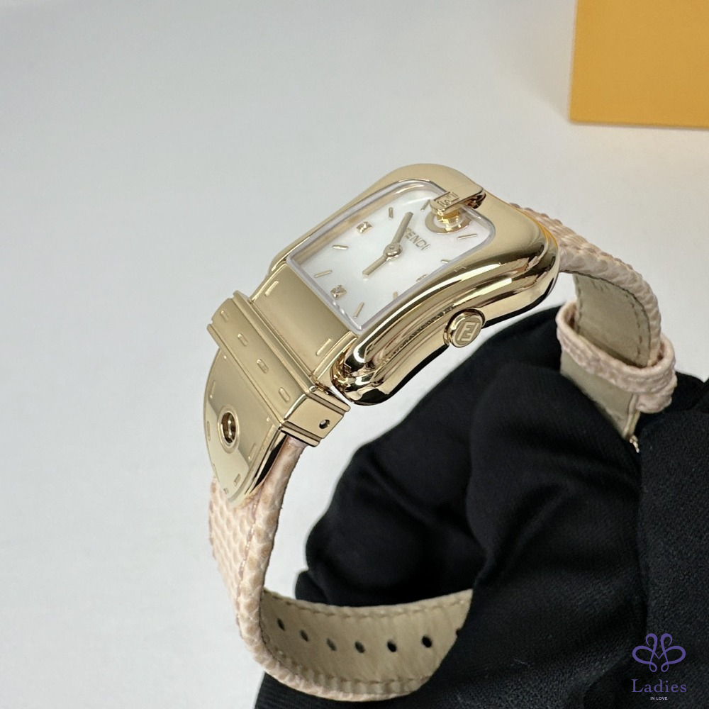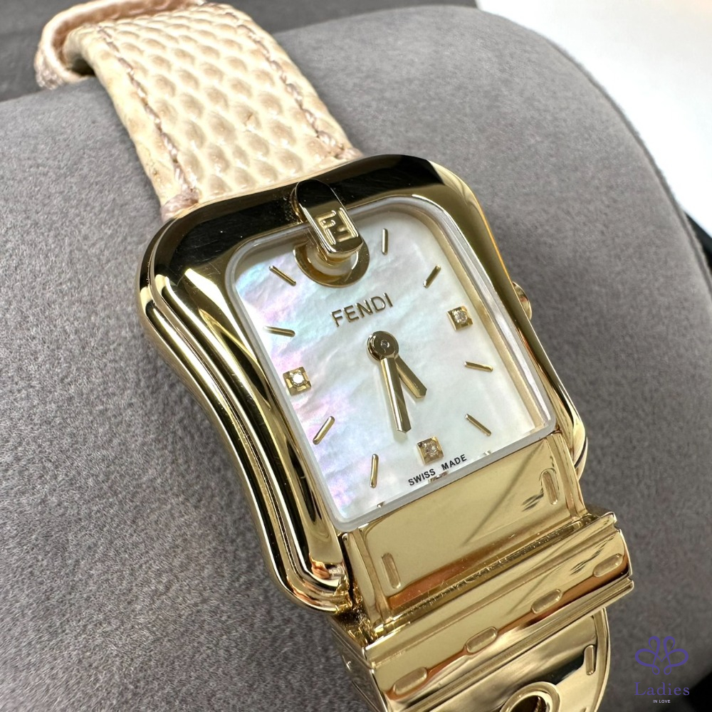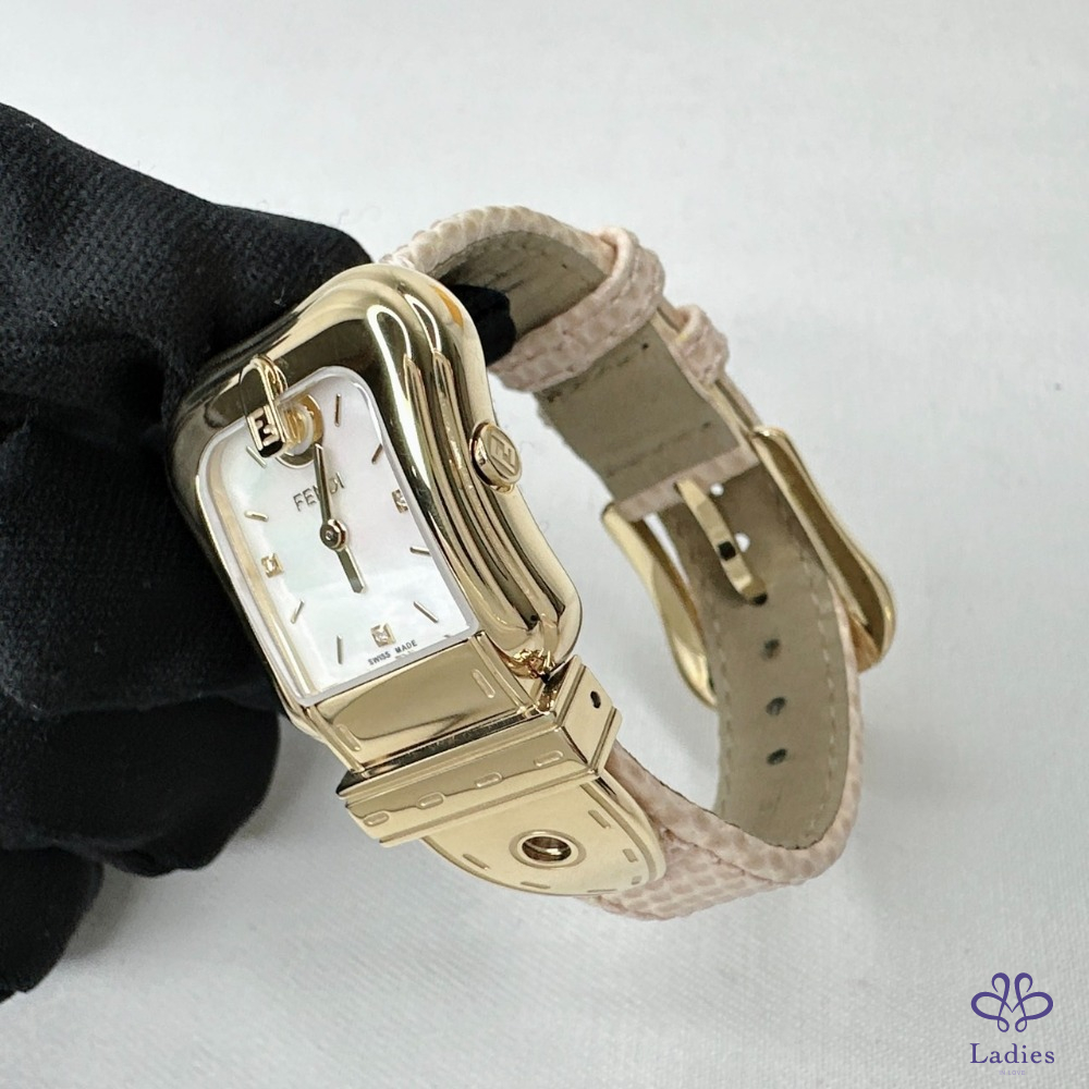 產品信息 【FENDI B.Fendi珍珠母貝石英女錶】 #專櫃價約4萬5 以馬蹄造型設計的錶殼,採金色拋光不鏽鋼製成 錶冠飾有浮雕FF標誌/珍珠母貝錶盤/金色指針和3顆鑽石時標 米色壓紋真皮錶帶/石英機芯/藍寶石水晶鏡面 整體品項約9成新,二手商品均有正常使用/存放痕跡 尺寸:錶徑約22x27mm 附件:原廠內外盒 #B114011405
