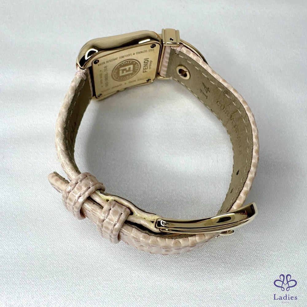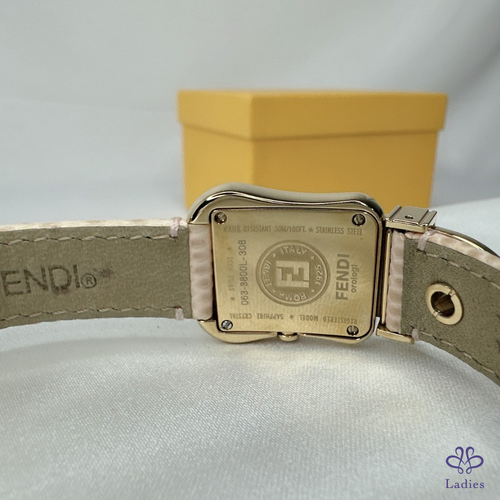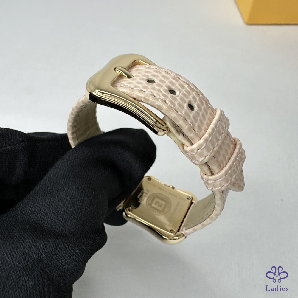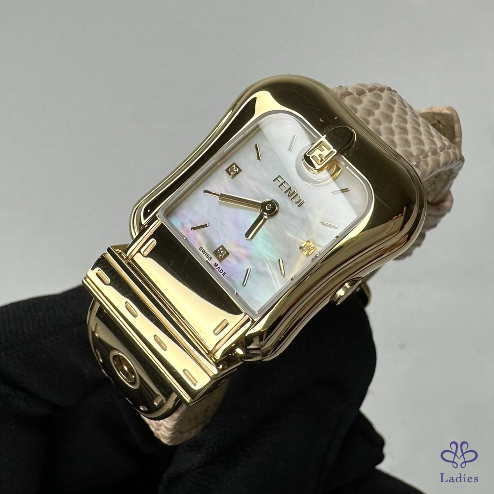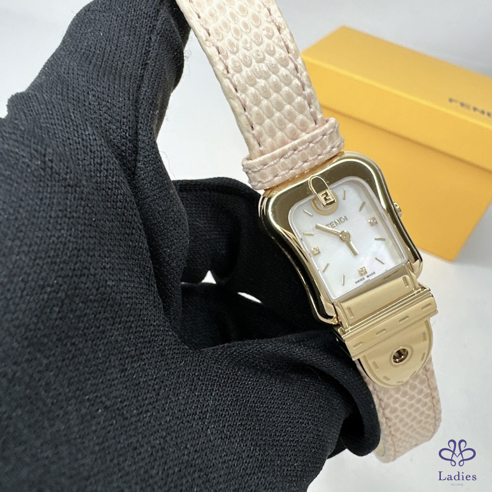產品信息 【FENDI B.Fendi珍珠母貝石英女錶】 #專櫃價約4萬5 以馬蹄造型設計的錶殼,採金色拋光不鏽鋼製成 錶冠飾有浮雕FF標誌/珍珠母貝錶盤/金色指針和3顆鑽石時標 米色壓紋真皮錶帶/石英機芯/藍寶石水晶鏡面 整體品項約9成新,二手商品均有正常使用/存放痕跡 尺寸:錶徑約22x27mm 附件:原廠內外盒 #B114011405