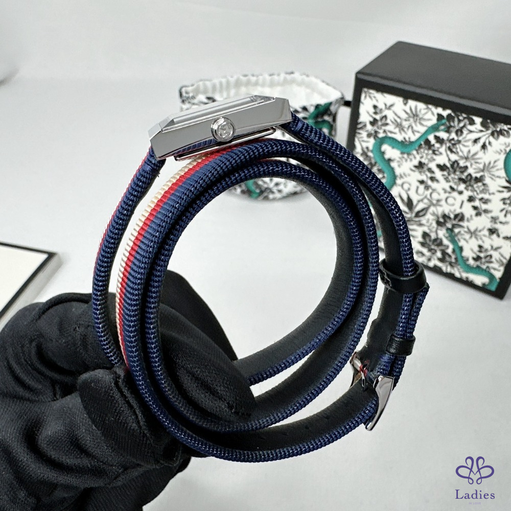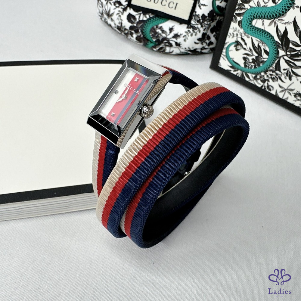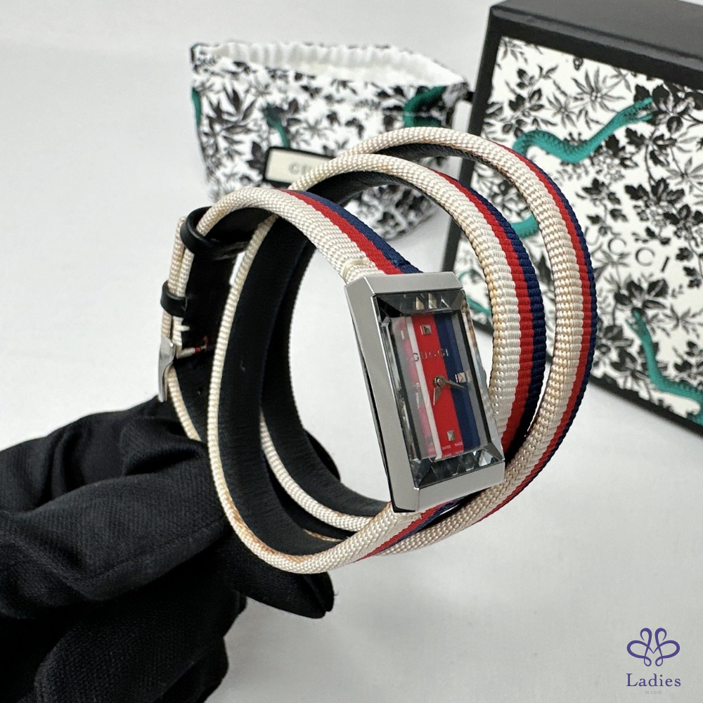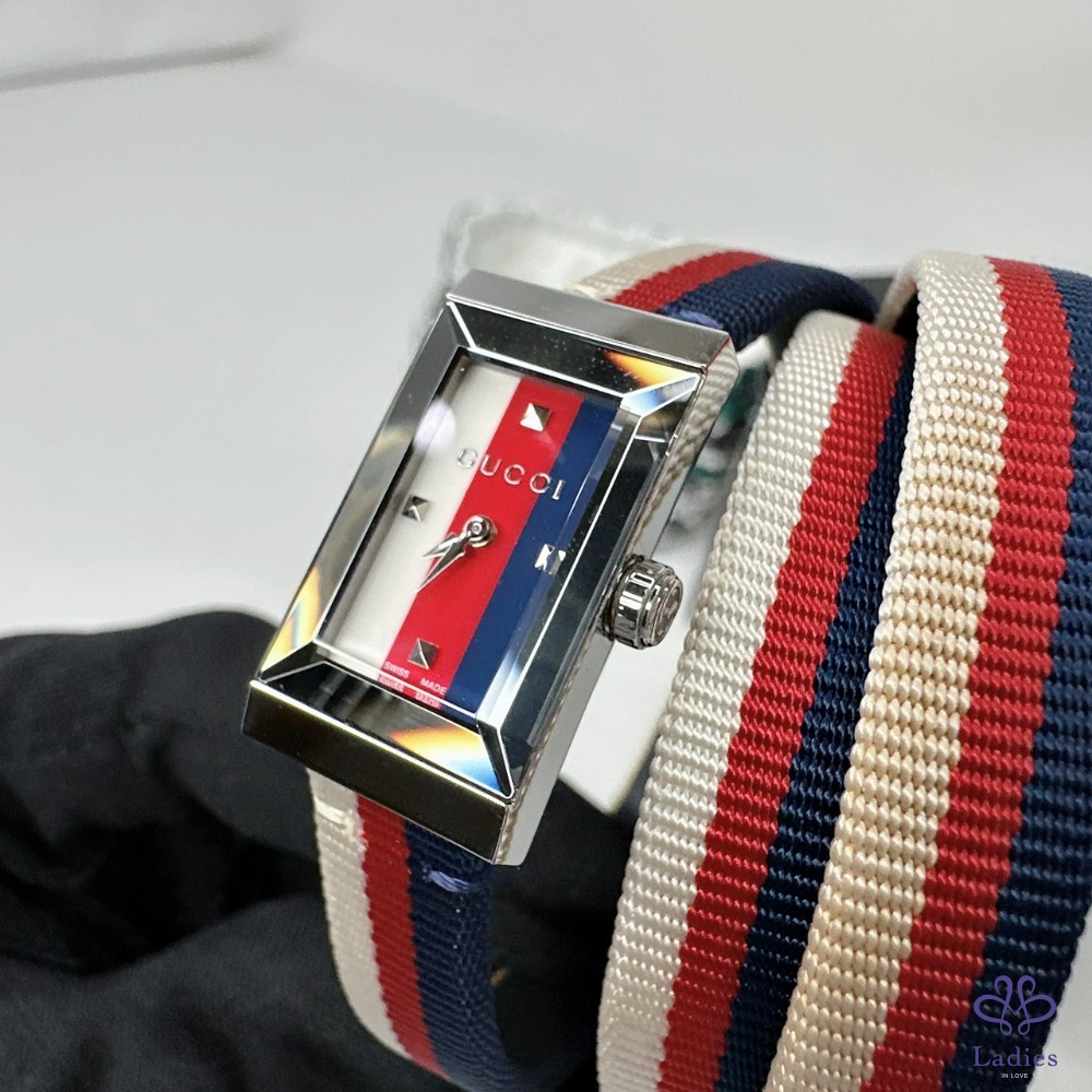 產品信息 【GUCCI G-Frame繞式三色錶盤腕錶】 長方形錶殼小巧精緻,散發優雅與柔美氣質 三色織帶錶盤/石英機芯/藍寶石水晶鏡面/不銹鋼錶殼 耐用的環繞式三色尼龍錶帶,背面採用黑色牛皮製成 整體品項約9成新,二手商品均有正常使用/存放痕跡 型號:YA147502 尺寸:錶徑14x25x7mm 附件:原廠盒、原廠防塵袋、說明書 #A113100902