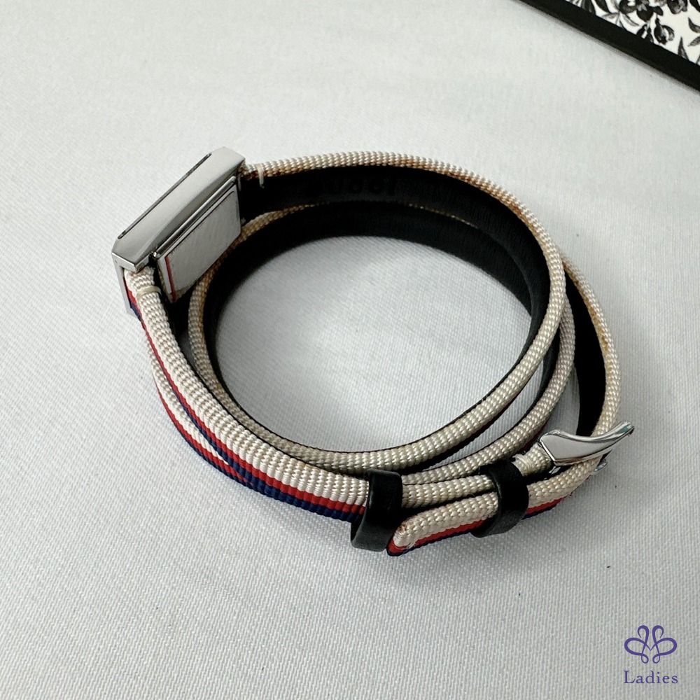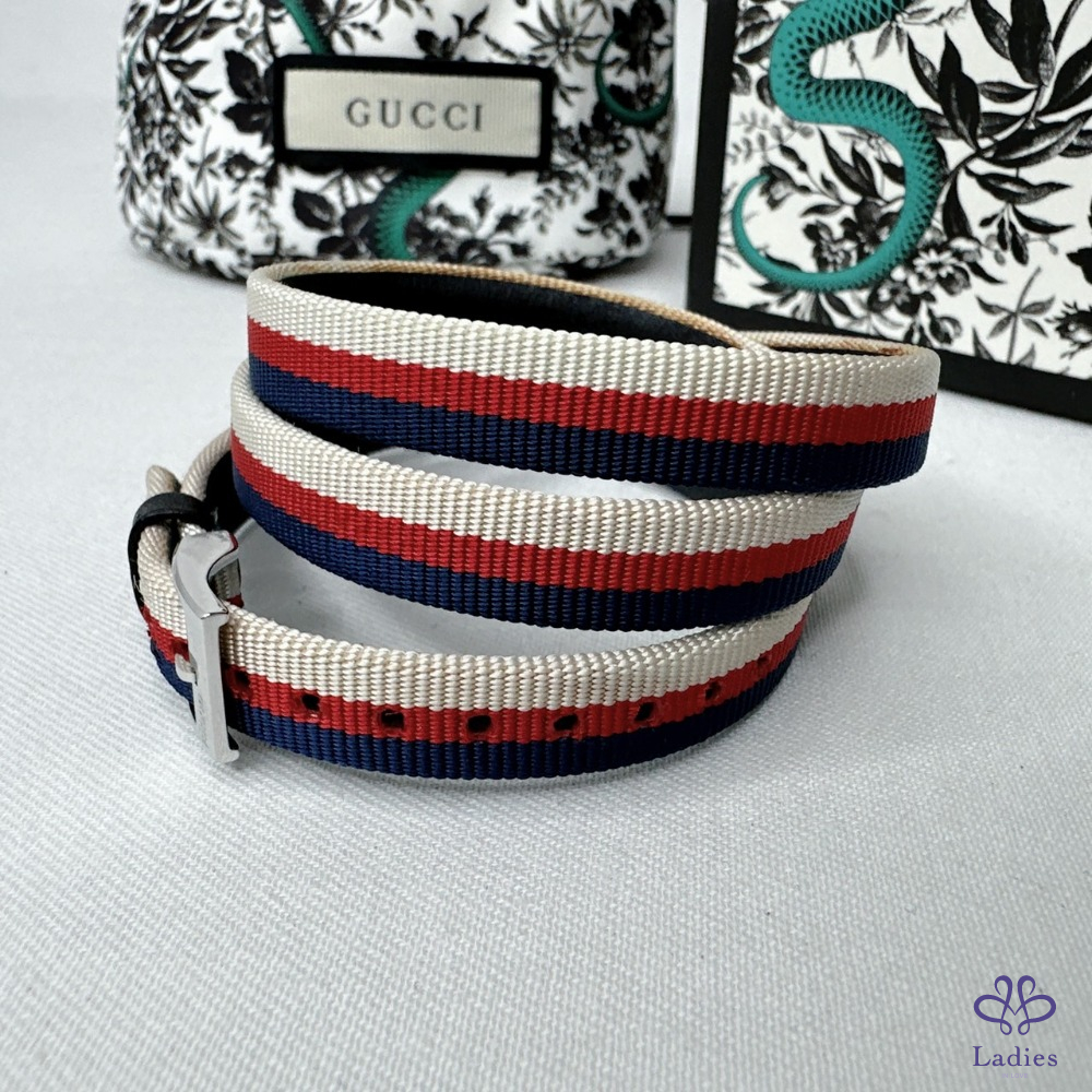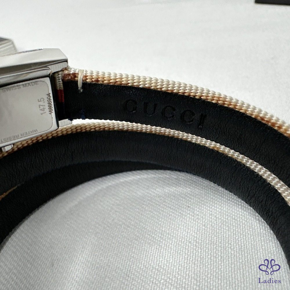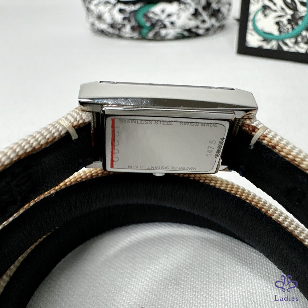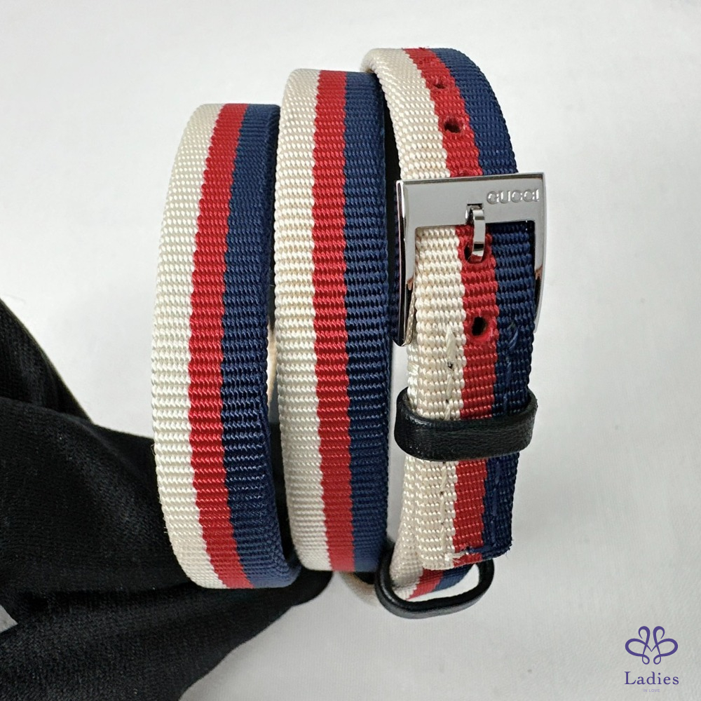 產品信息 【GUCCI G-Frame繞式三色錶盤腕錶】 長方形錶殼小巧精緻,散發優雅與柔美氣質 三色織帶錶盤/石英機芯/藍寶石水晶鏡面/不銹鋼錶殼 耐用的環繞式三色尼龍錶帶,背面採用黑色牛皮製成 整體品項約9成新,二手商品均有正常使用/存放痕跡 型號:YA147502 尺寸:錶徑14x25x7mm 附件:原廠盒、原廠防塵袋、說明書 #A113100902