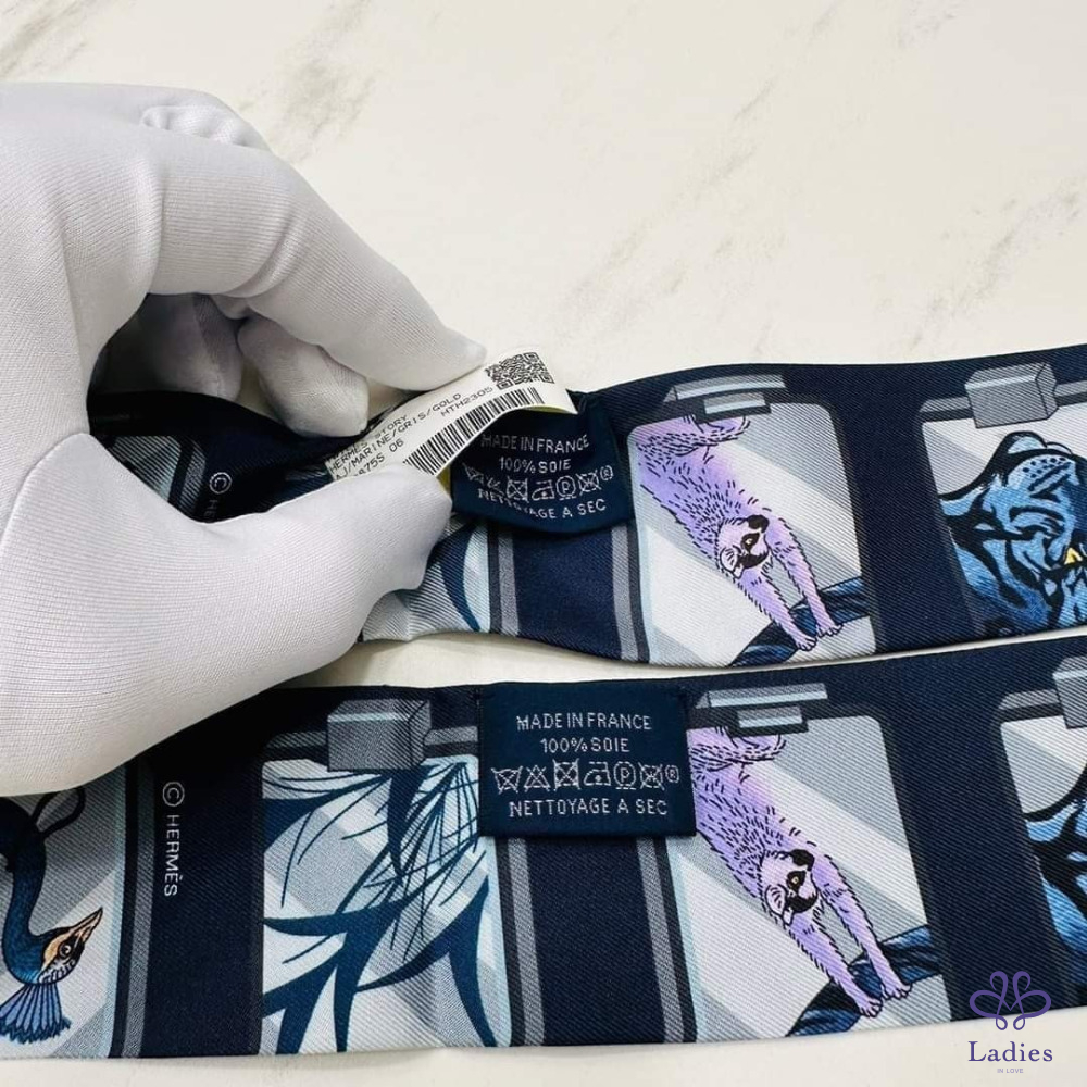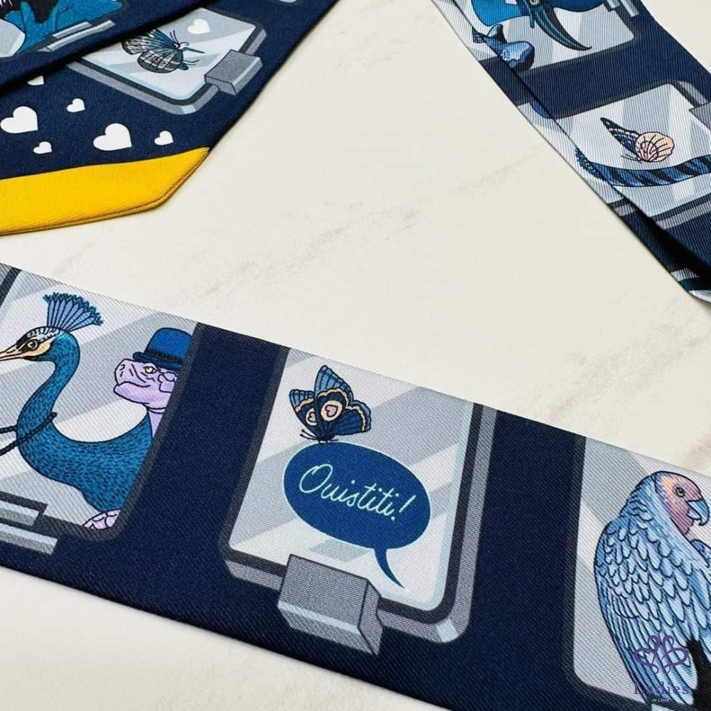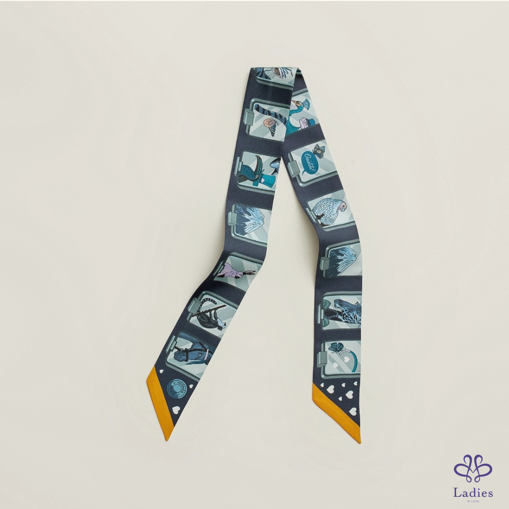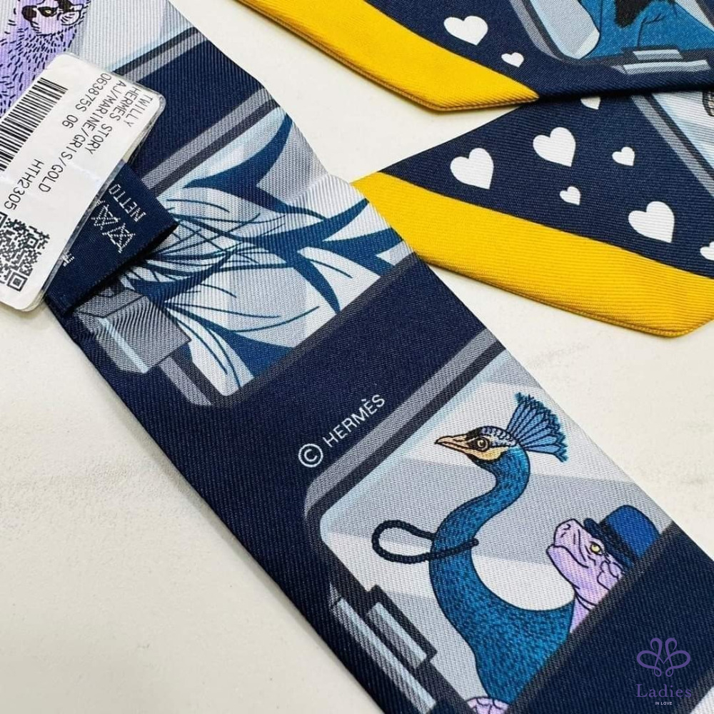 售 Hermes Hermès Story Twilly x marine/gris/gold 愛馬仕的動態分享 海軍藍/灰/金 綁帶長絲巾