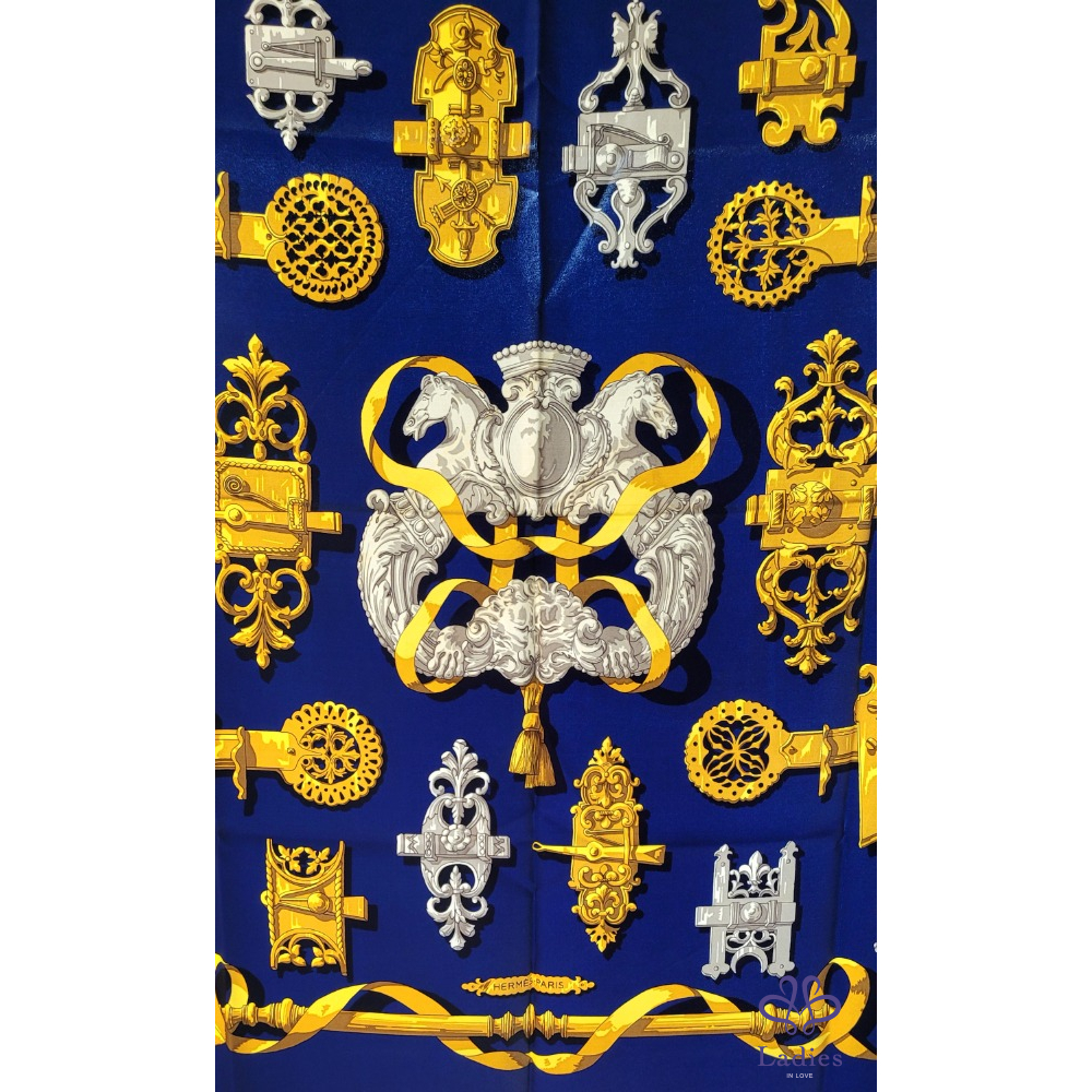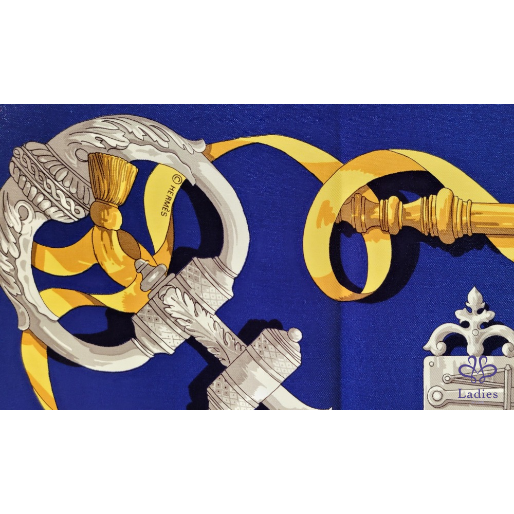 ~HERMES 寶籃色金屬皇家家徽飾品圖案90x90cm絲巾