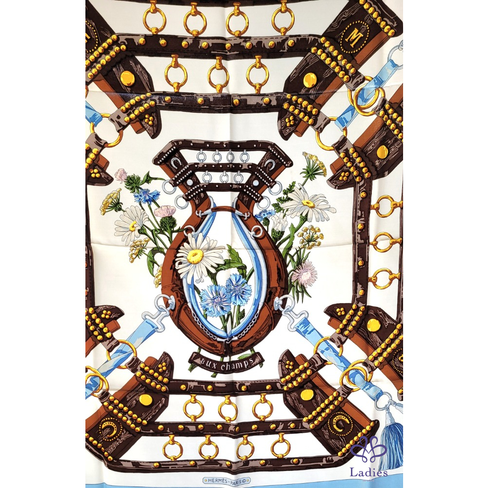 ~HERMES 天藍色邊花搭配流蘇馬具圖案絲巾