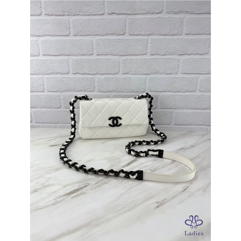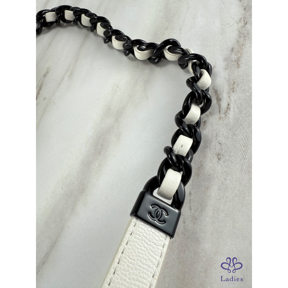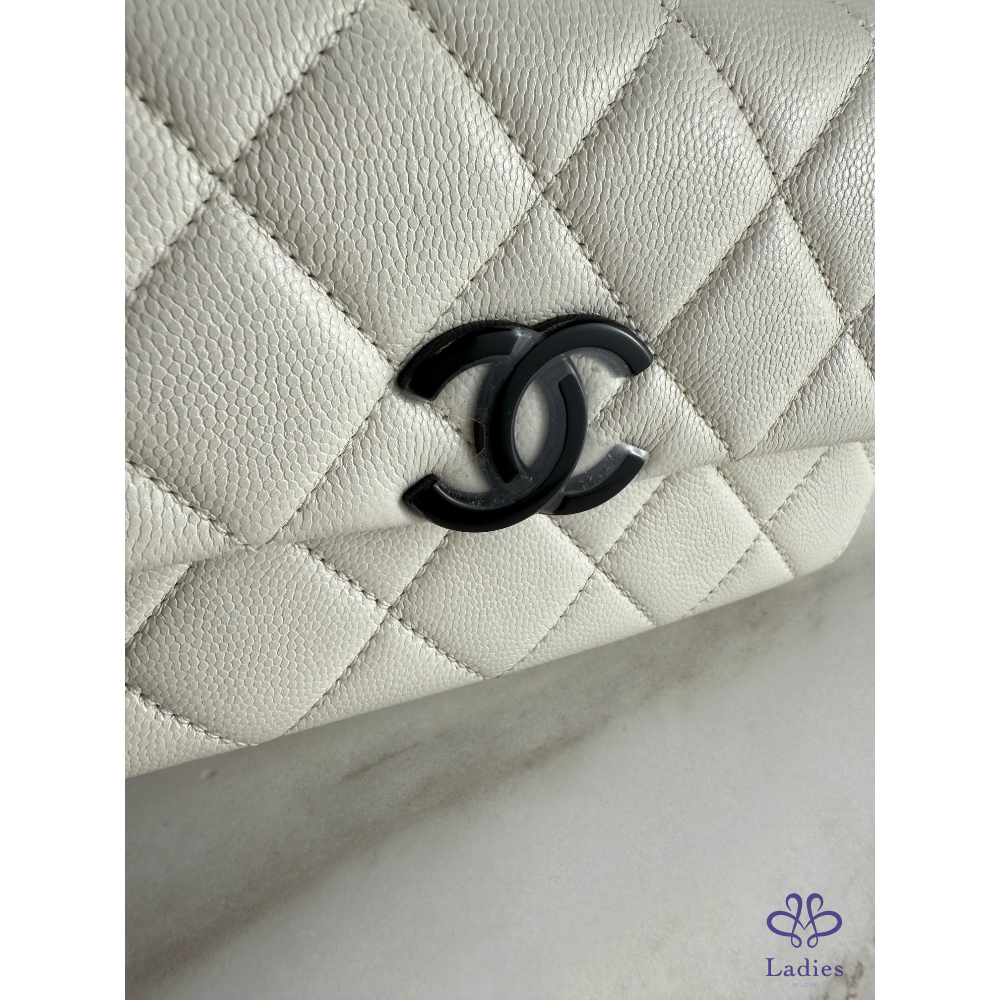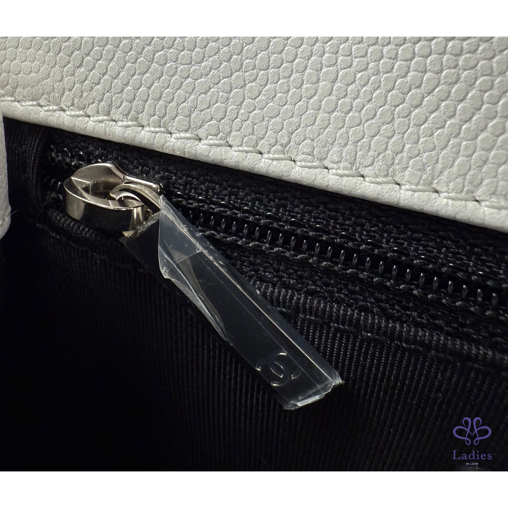 白色荔枝牛皮搭配高級黑色漆面金屬釦的設計,經典又富新意,全黑的雙C Logo格外亮眼,上身時尚,適合各種不同風格穿搭