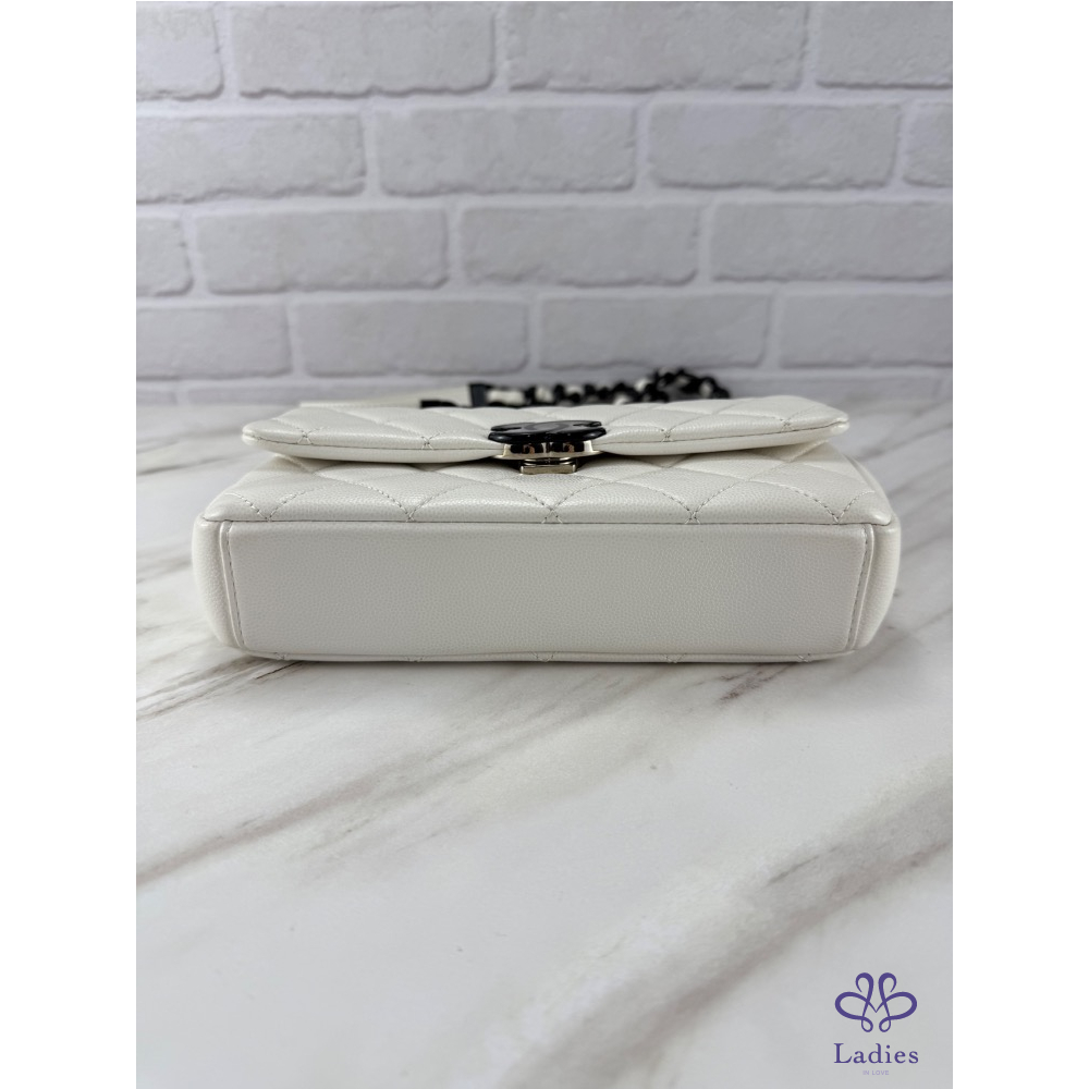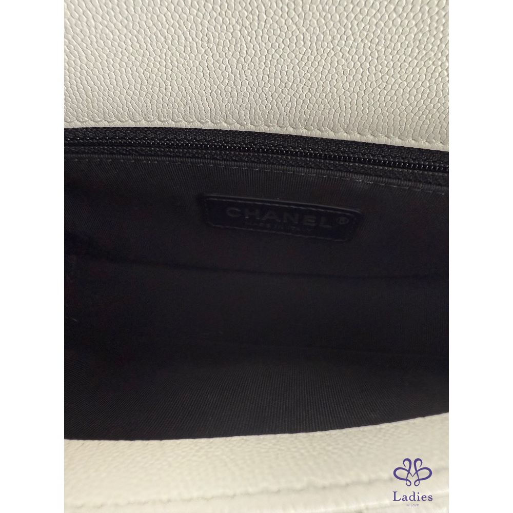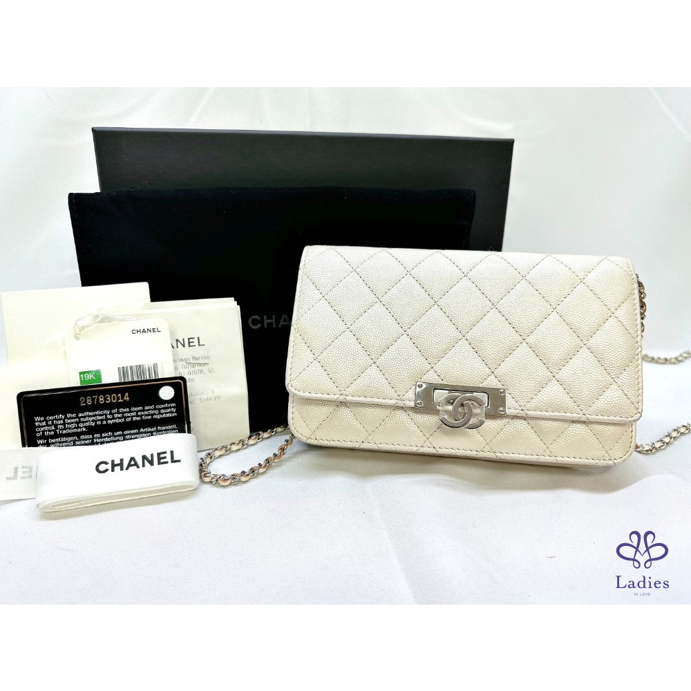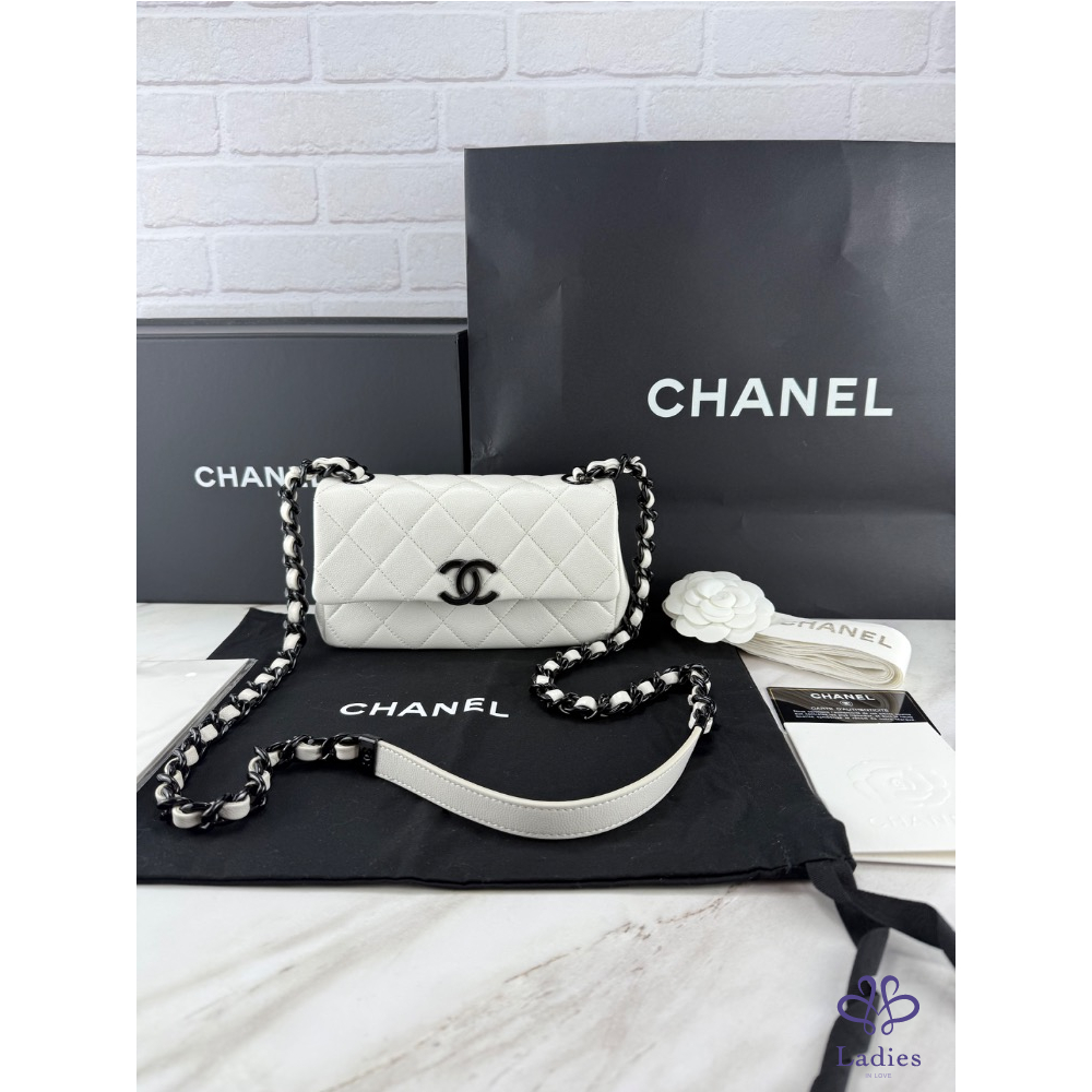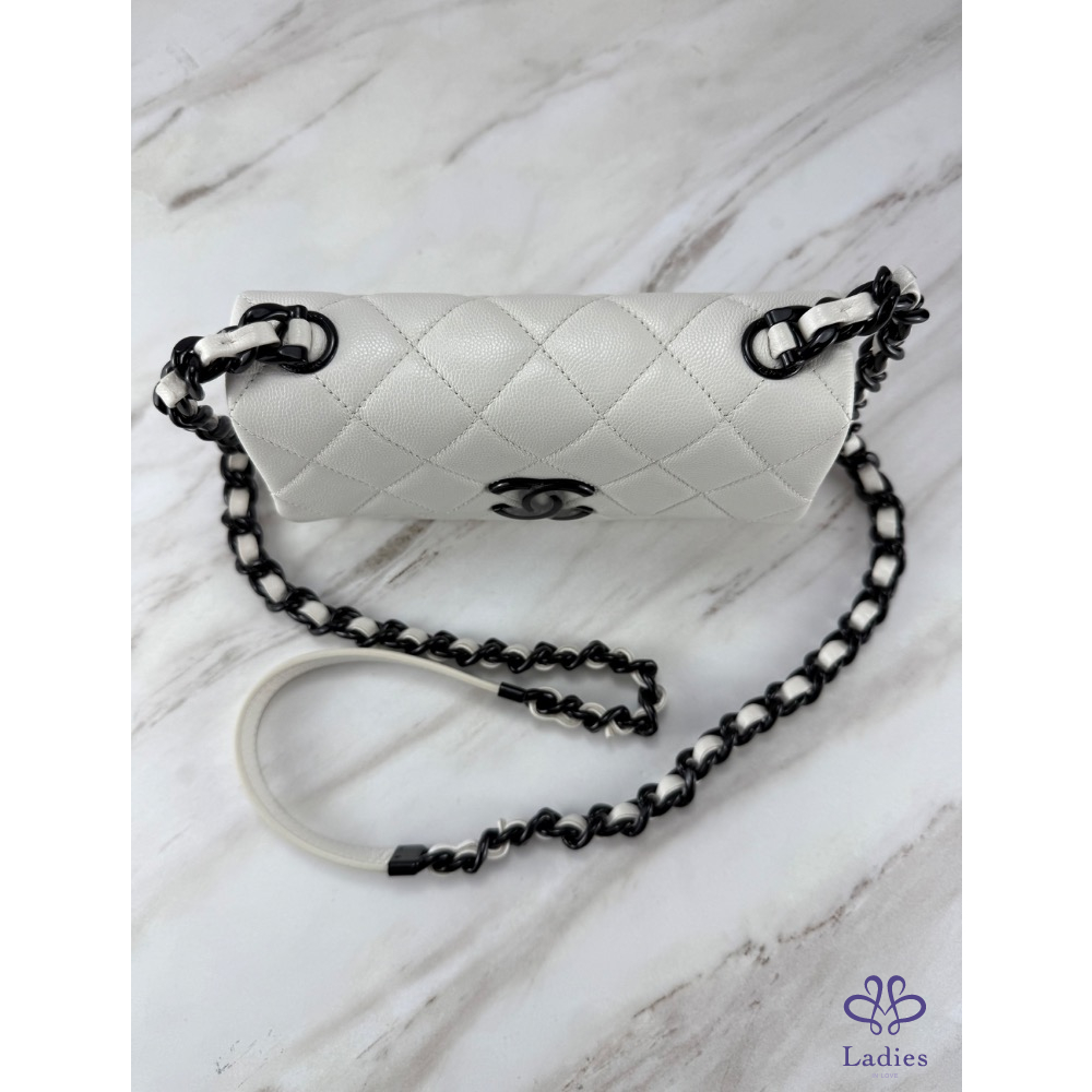 白色荔枝牛皮搭配高級黑色漆面金屬釦的設計,經典又富新意,全黑的雙C Logo格外亮眼,上身時尚,適合各種不同風格穿搭
