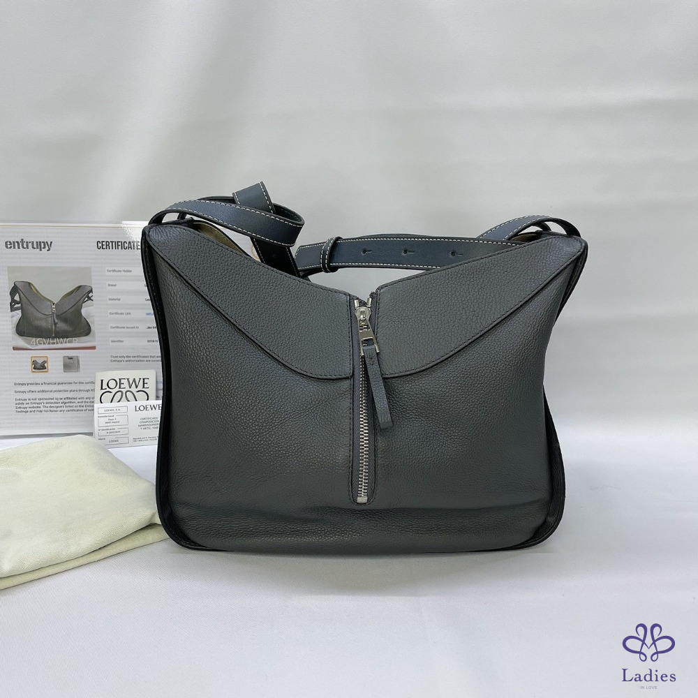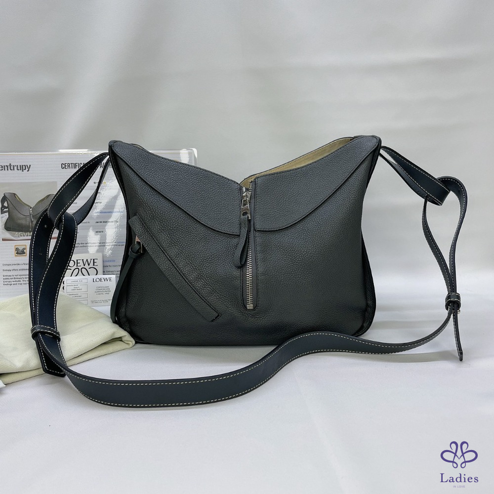 產品信息 【LOEWE Hammock手提斜背包】 #近新閒置品 #專櫃價約11萬 線條流暢,形狀獨特且做工精緻 風格簡約,易於搭配不同風格 手持式甚至是斜挎包,保證了現代的舒適感和不同的態度 整體包況9成7新,二手商品均有正常使用/存放痕跡 尺寸:24x14x29cm 附件:原廠防塵袋、小卡、entrupy 證書 #A113052809