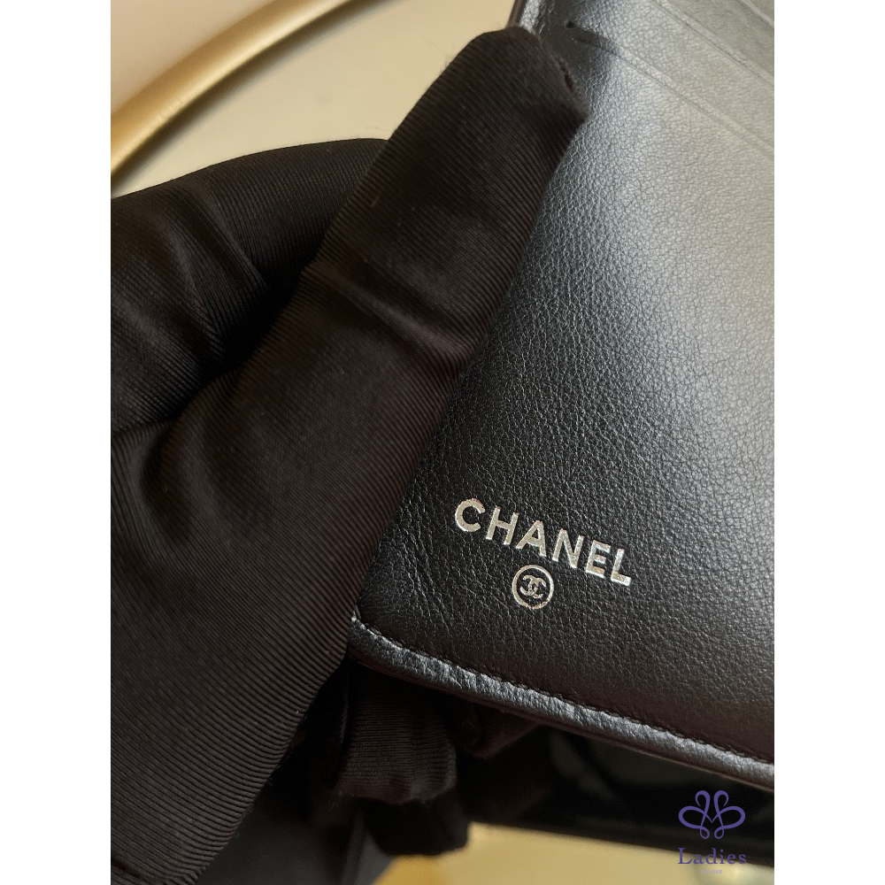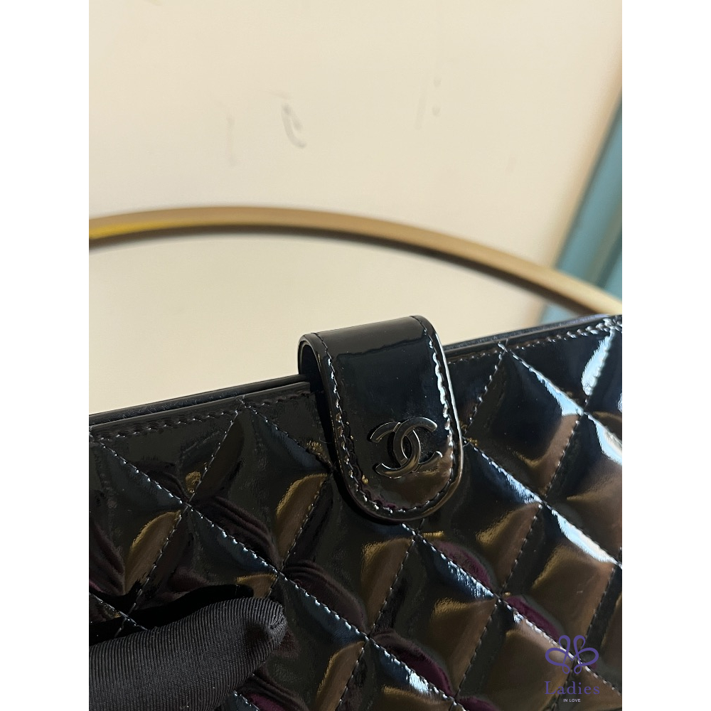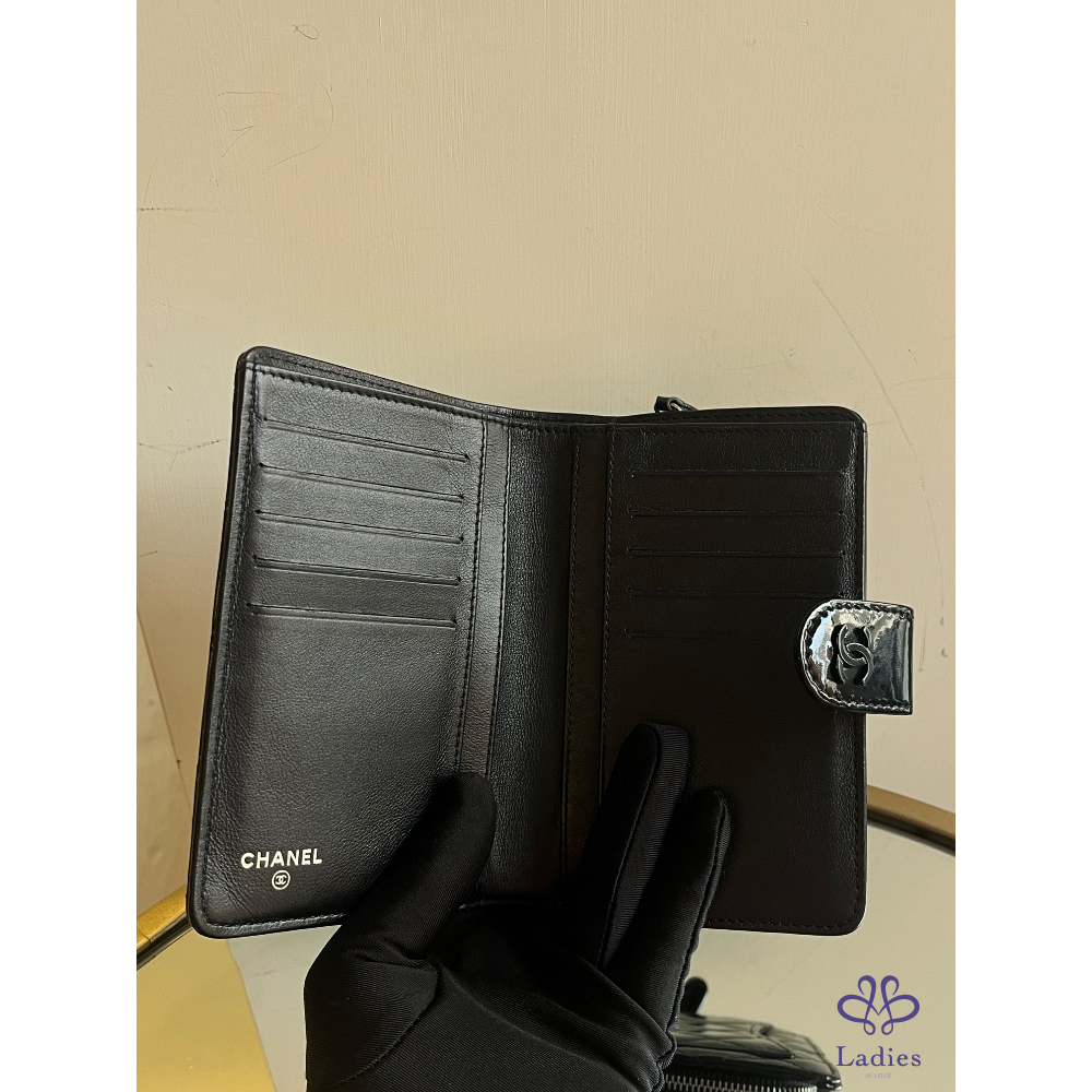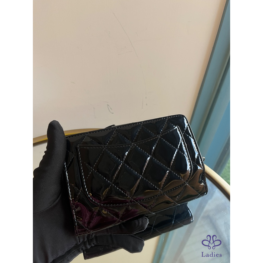 產品信息 超稀有款式漆皮中夾~ 漆皮成新度極高 無黏皮 黑色雙C Logo更顯質感個性 內裡牛皮維持還很乾淨漂亮✨ 整體有九新以上,logo正常使用痕跡可細看圖 配件:盒裝、查碼圖(私訊給 尺寸:10*15*3.7cm 圖片已盡力拍攝高標請繞道謝謝