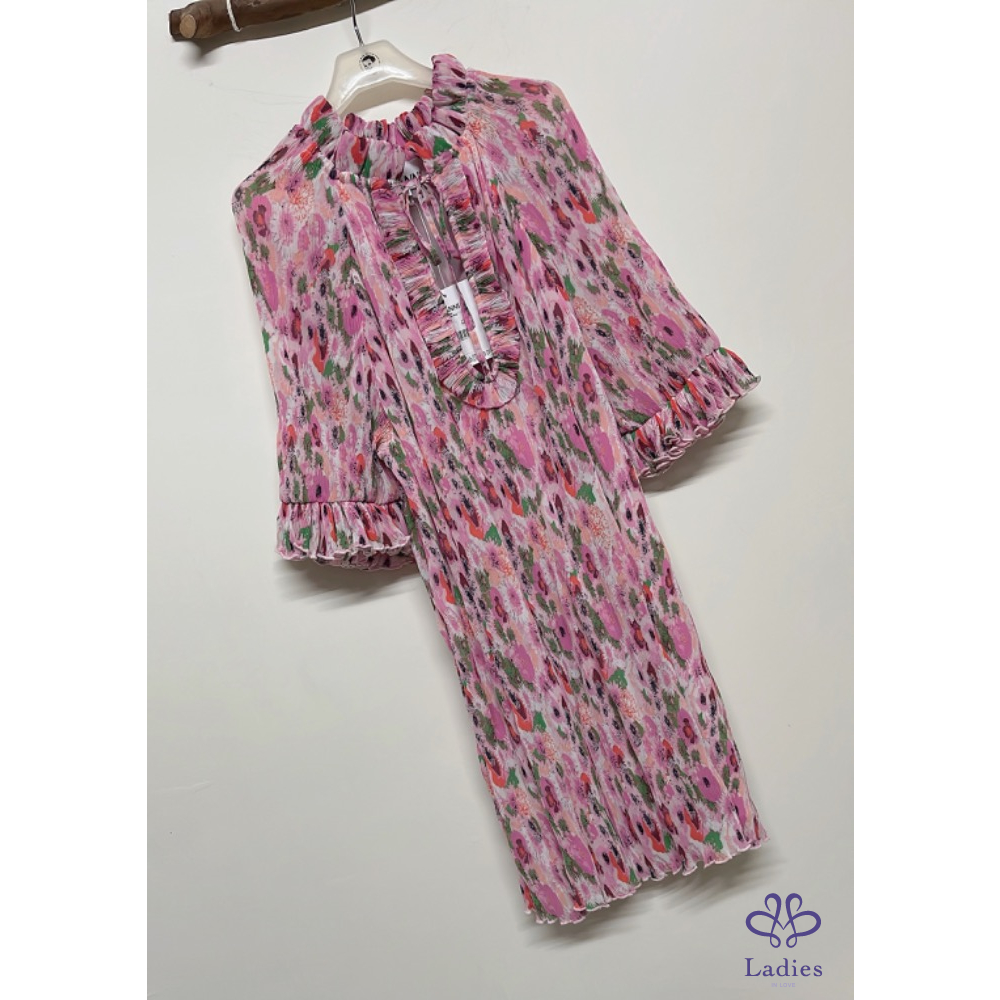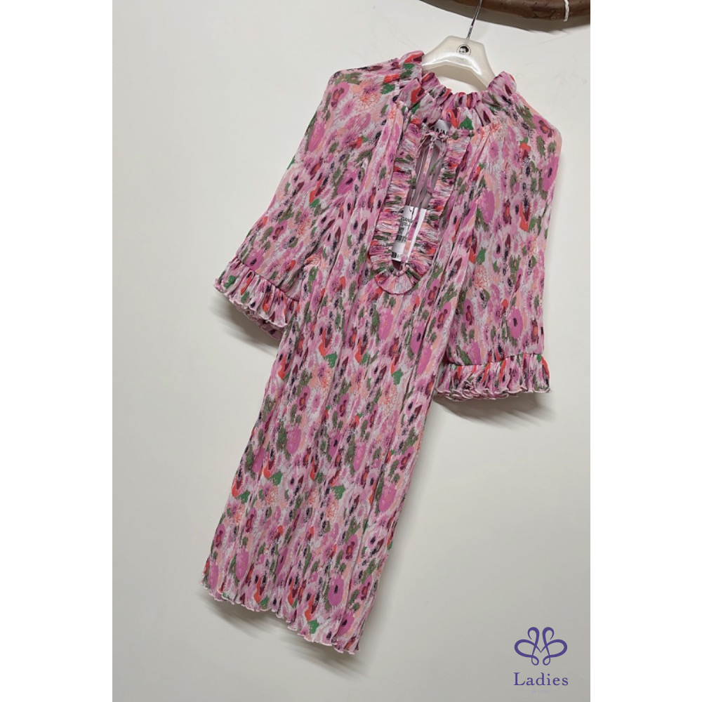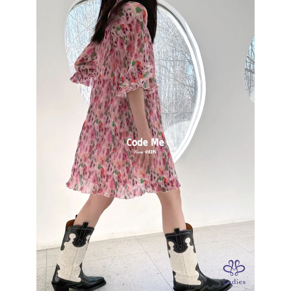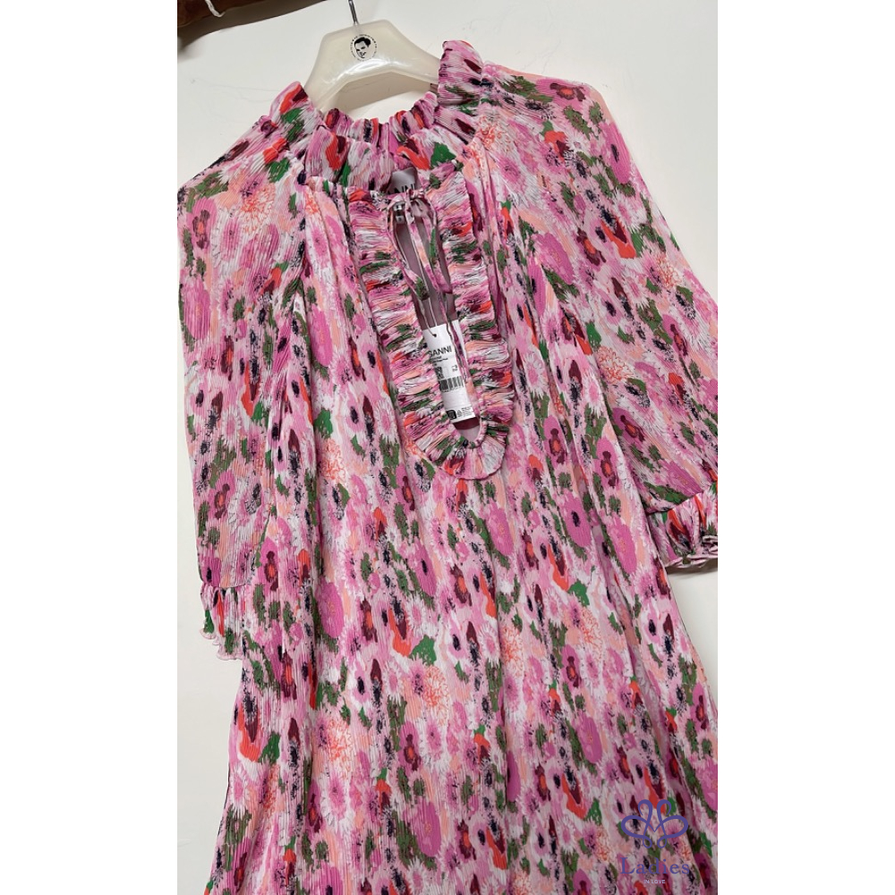 全新GANNI絕美細摺碎花粉色雪紡洋裝