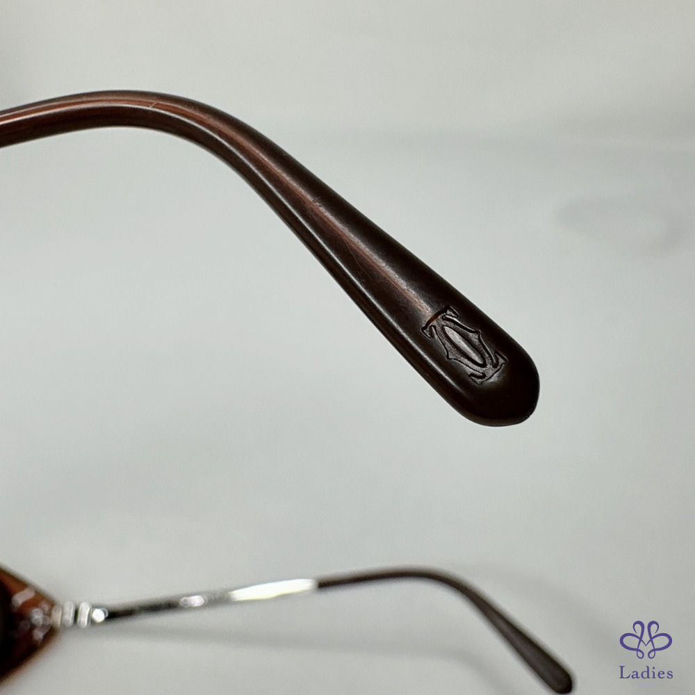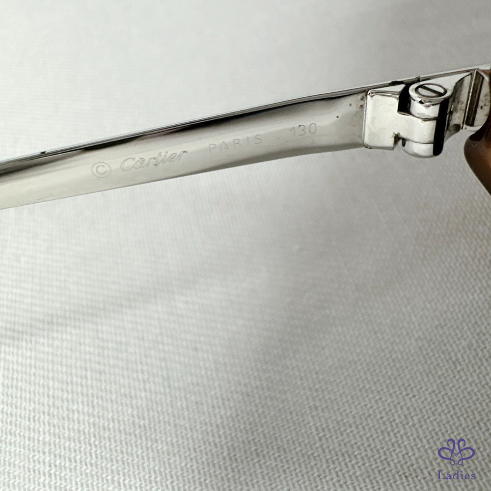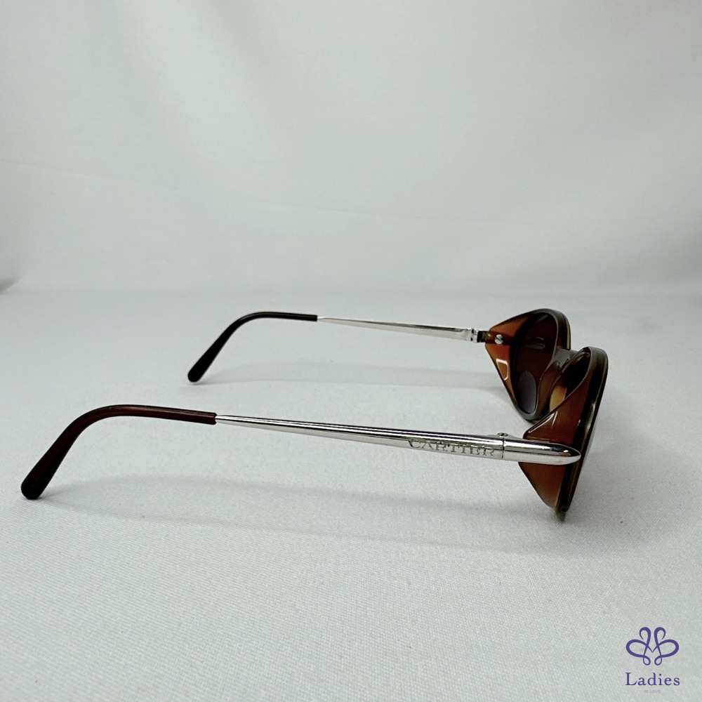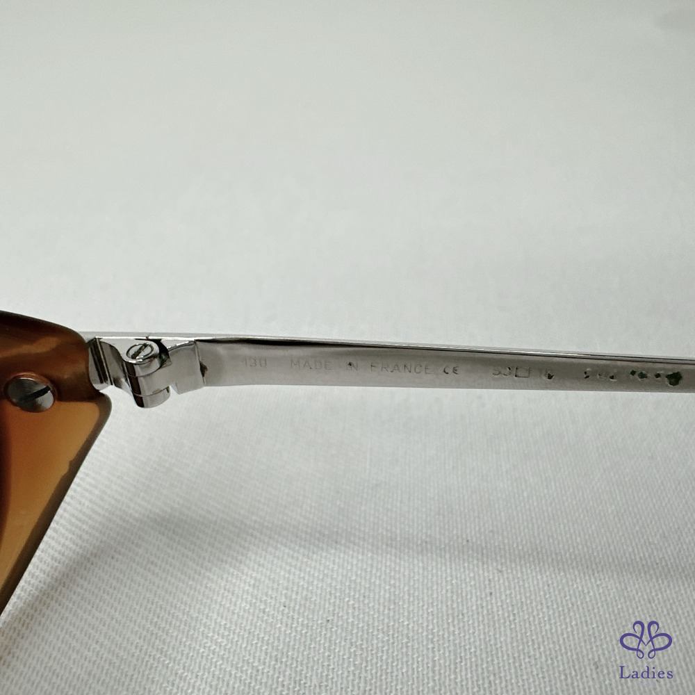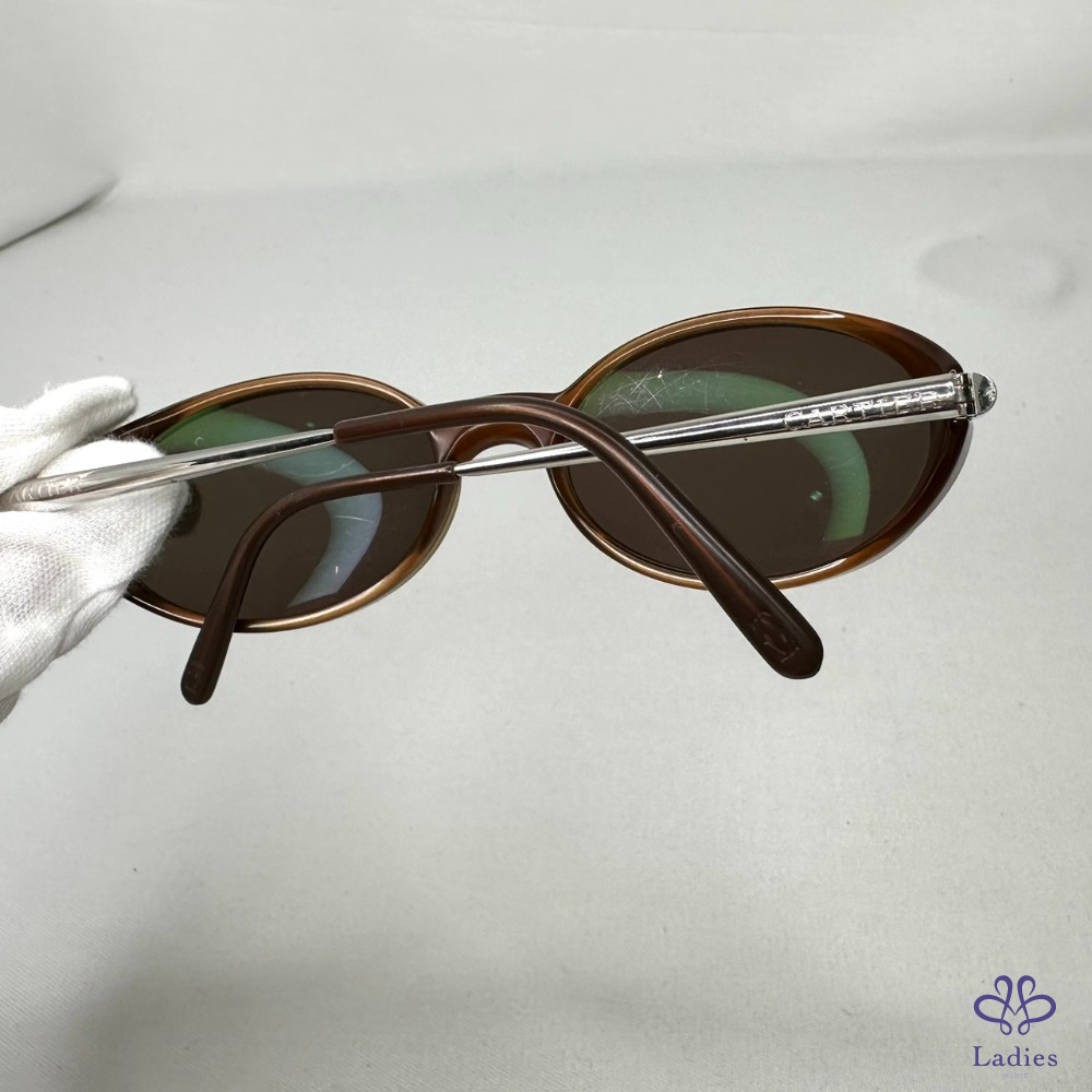 產品信息 【Cartier 卡地亞橢圓形太陽眼鏡】 #復古時尚單品 1996年法國原創復古奢華款式,炫酷橢圓形造型 棕色x透明棕色,光滑鉑金飾面鏡腳,鏡面效果棕色鏡片 整體品項新舊如圖,二手商品均有正常使用/存放痕跡 附件:原廠鏡盒 #B114011103