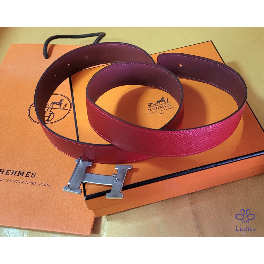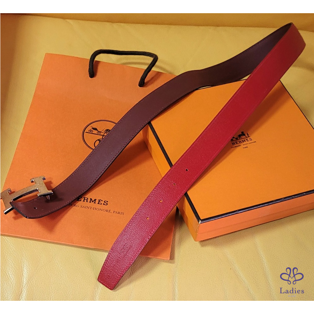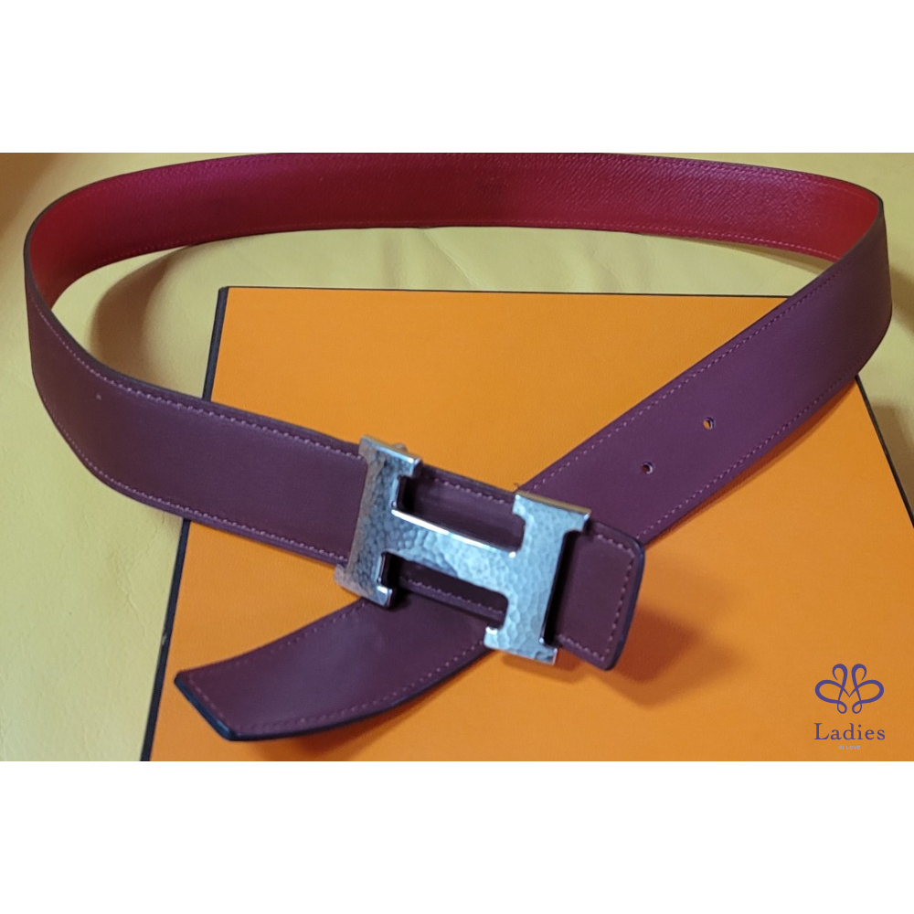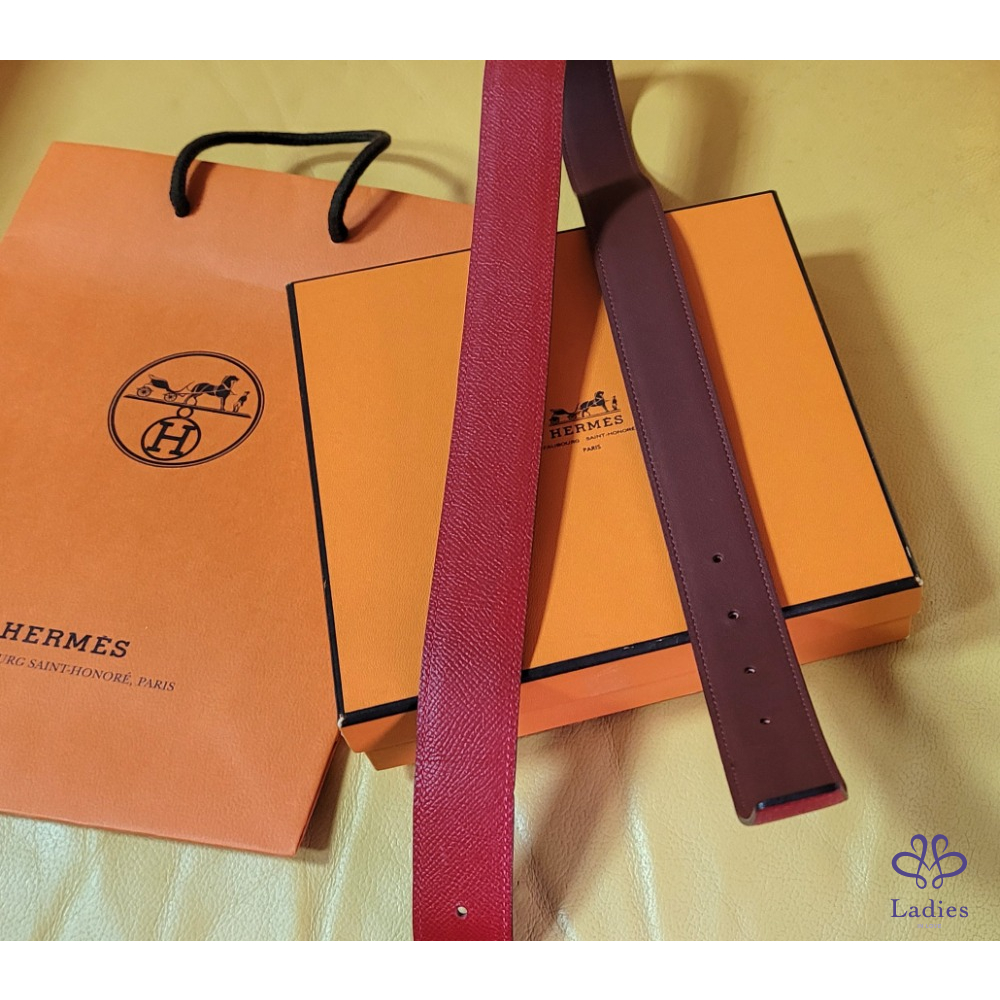 ~HERMES 銀圓弧H扣頭 紅+霧面勃根地紅色雙面腰帶85刻印