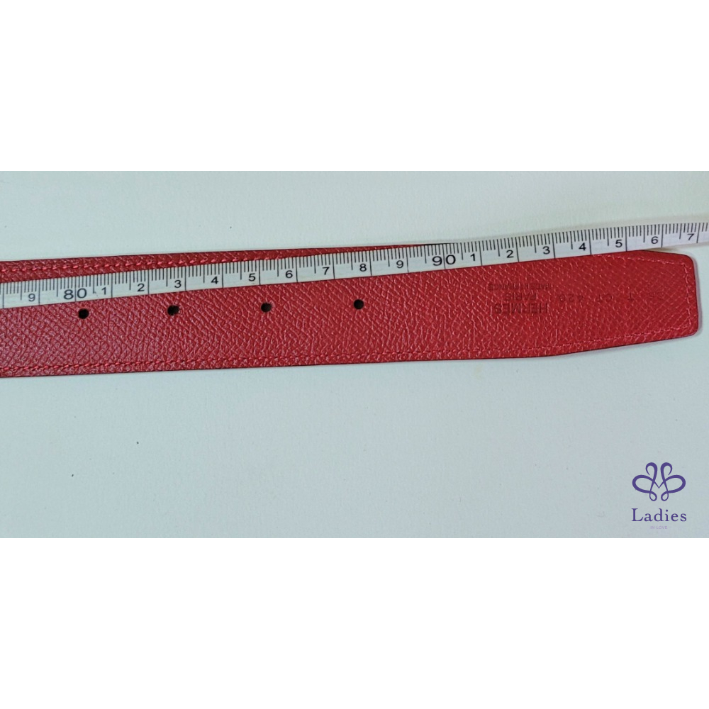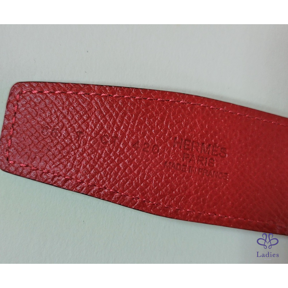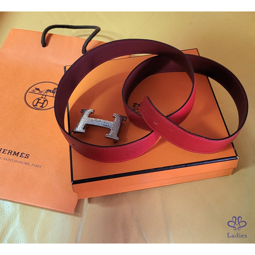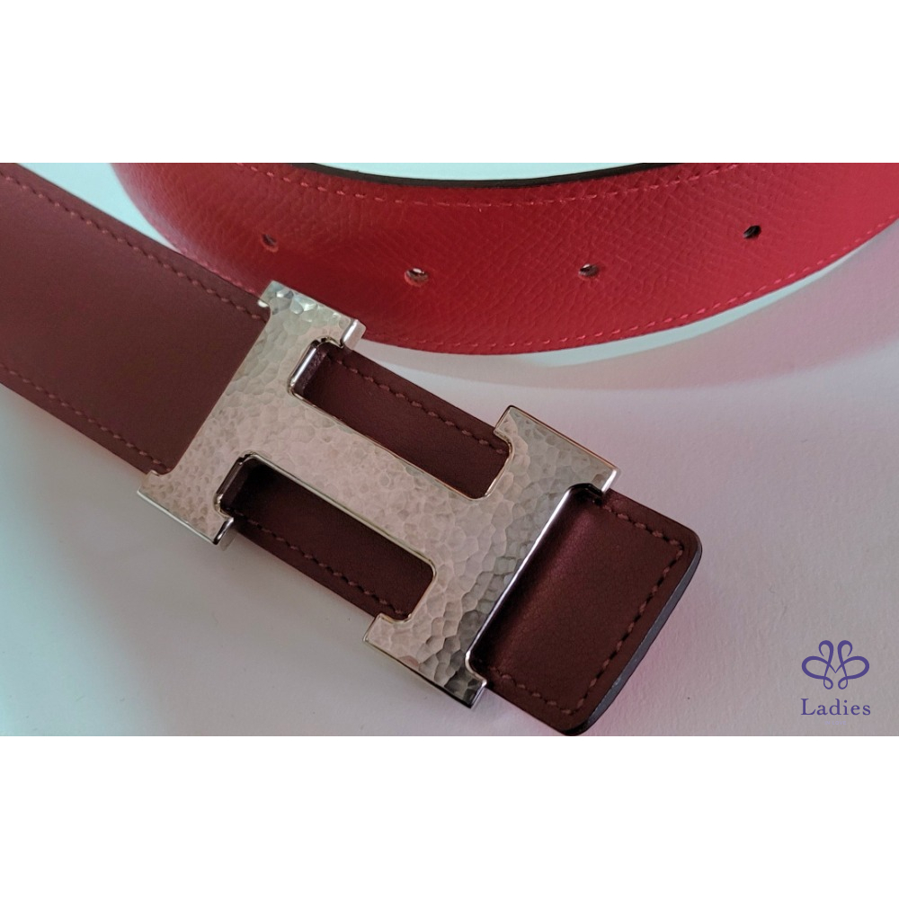 ~HERMES 銀圓弧H扣頭 紅+霧面勃根地紅色雙面腰帶85刻印