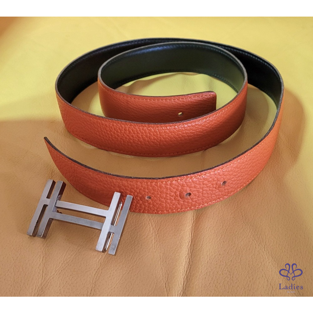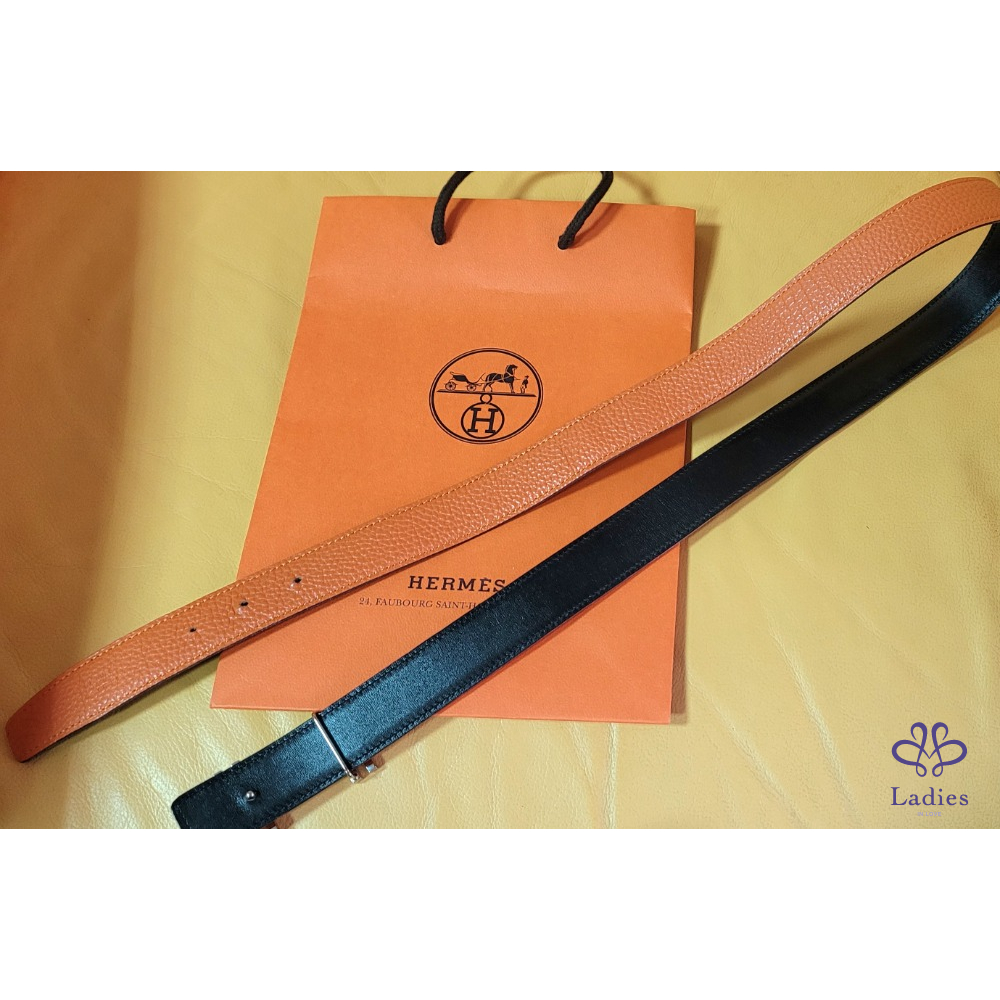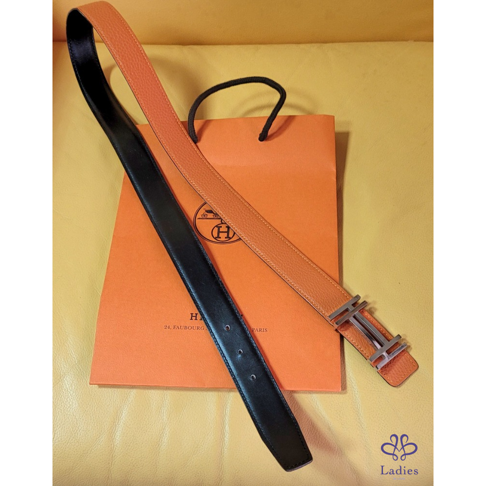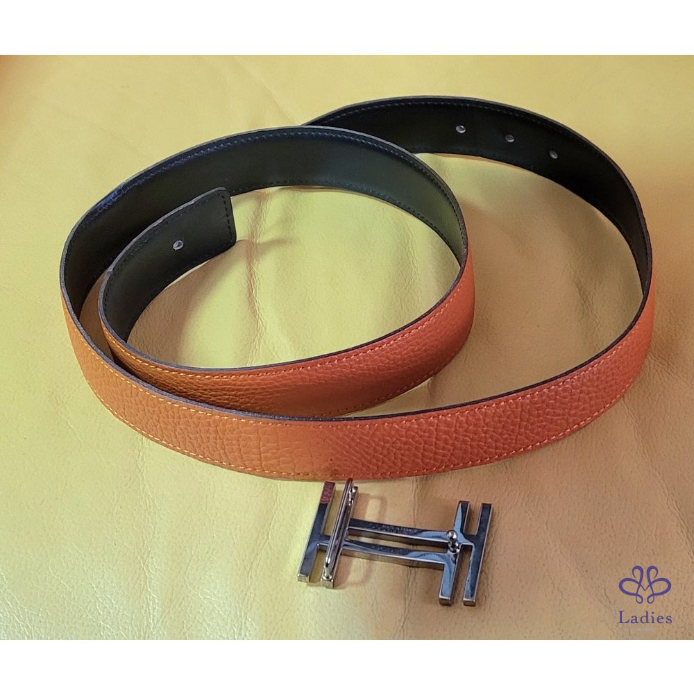 ~HERMES 銀雙H扣頭 黑+橘雙面皮革腰帶95刻印
