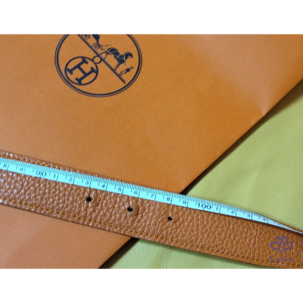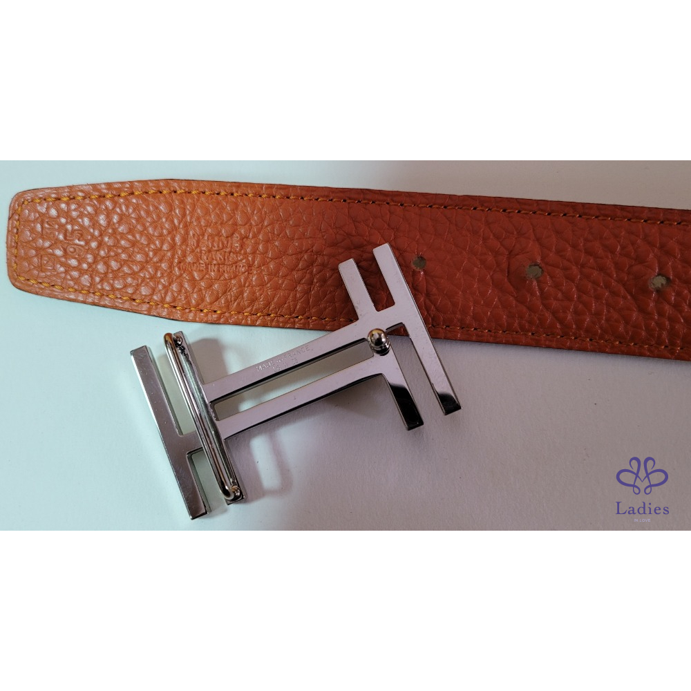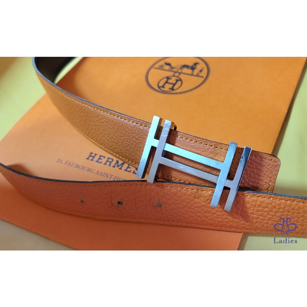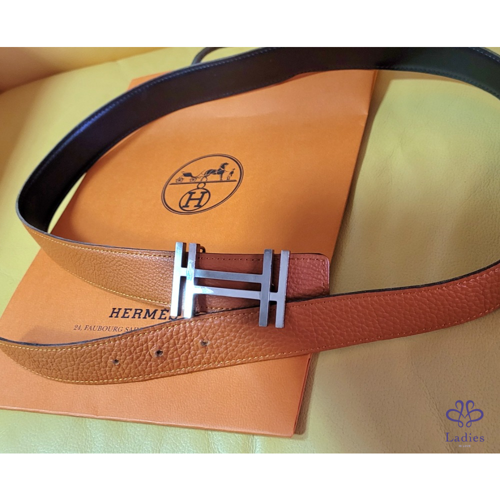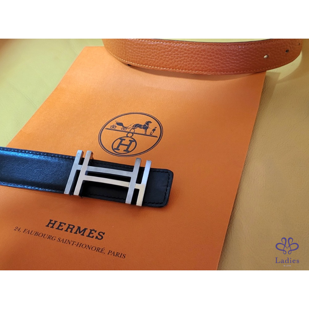 ~HERMES 銀雙H扣頭 黑+橘雙面皮革腰帶95刻印