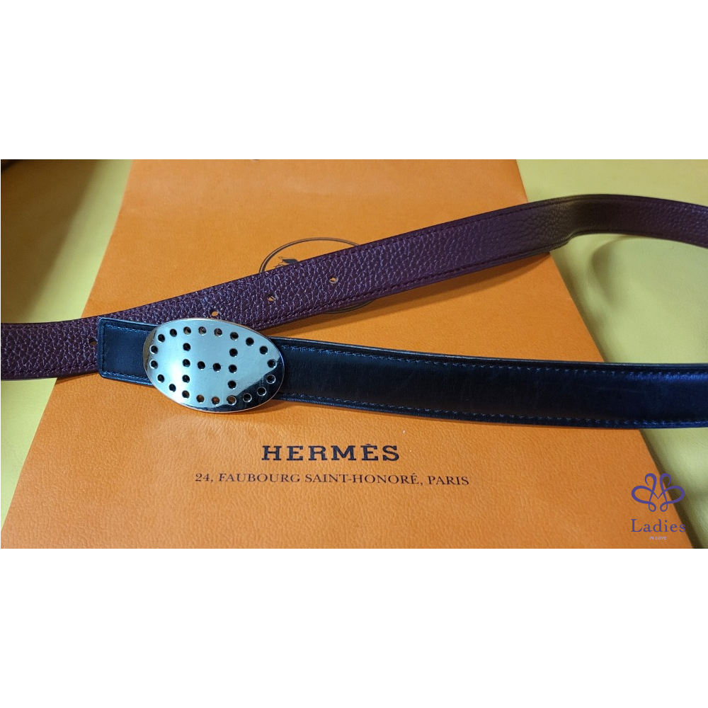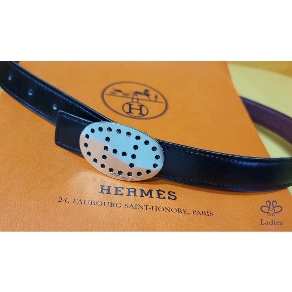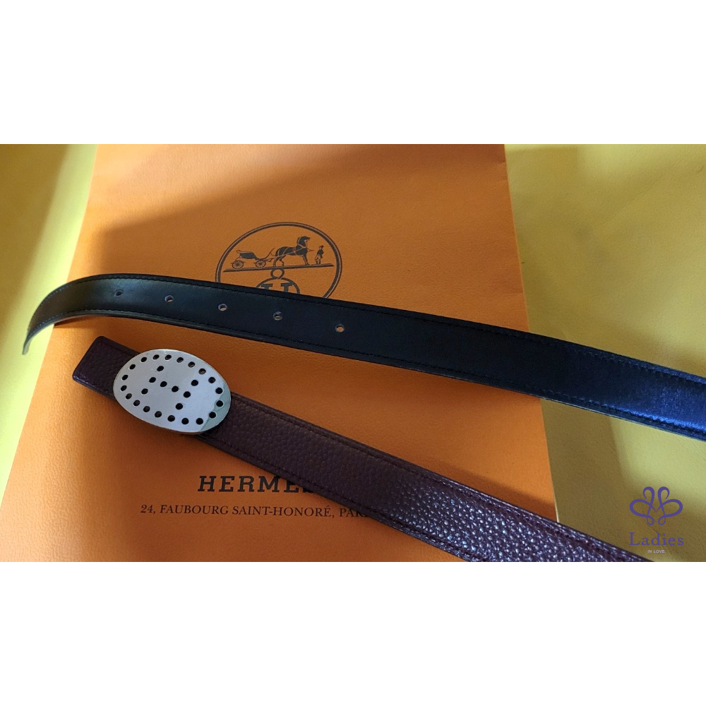 ~HERMES 銀鏤空H扣頭 黑/咖啡紅雙面腰帶85刻印
