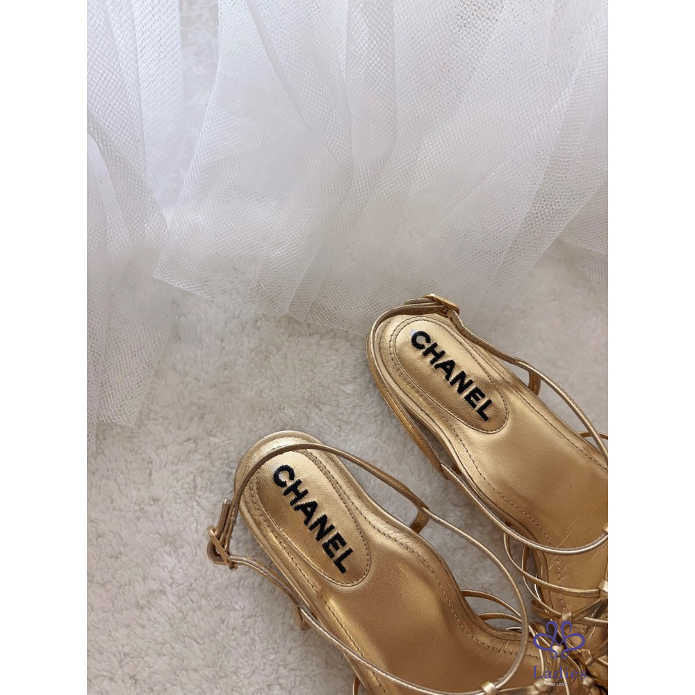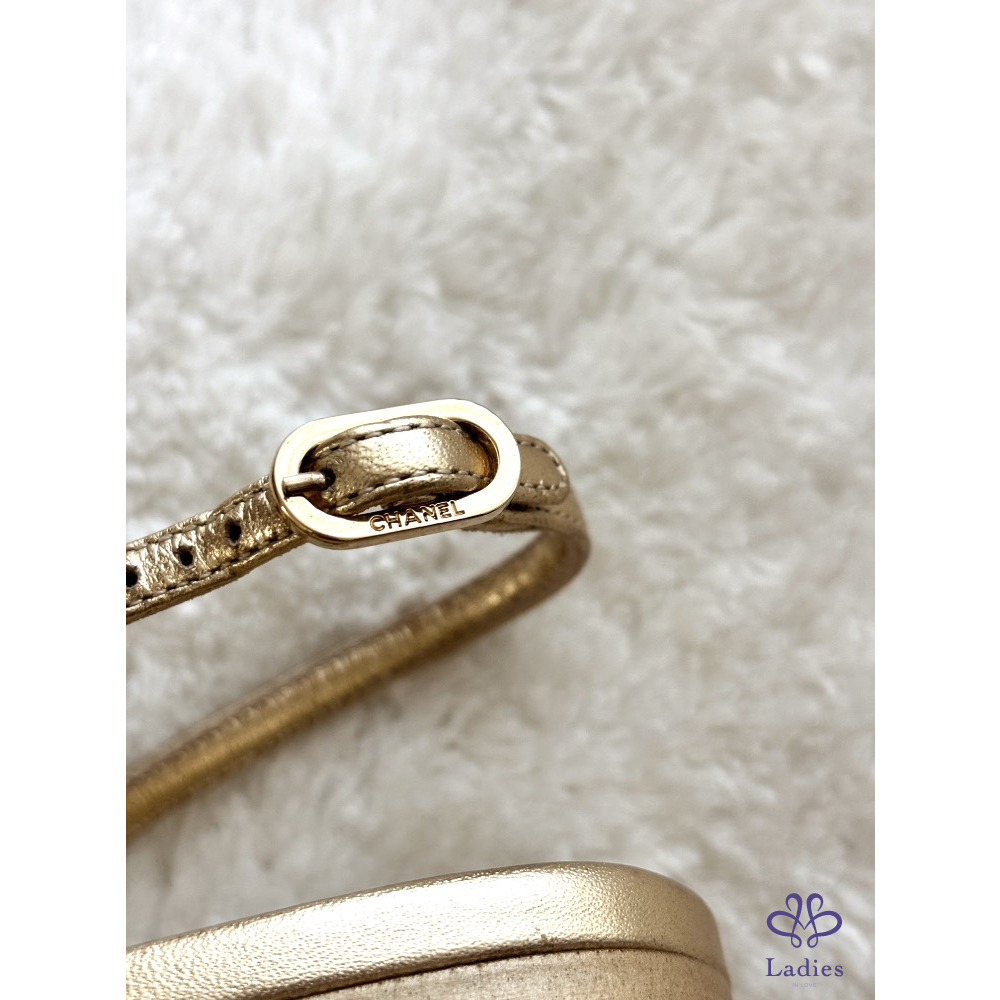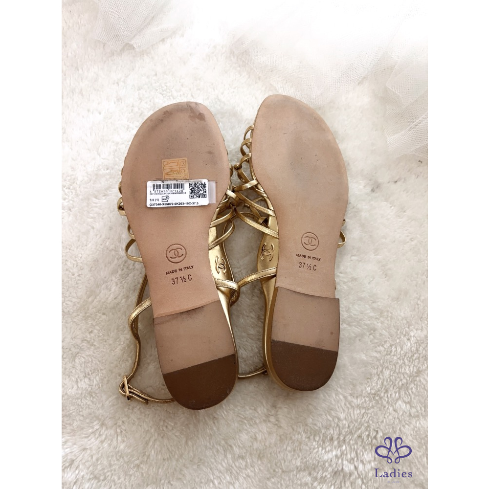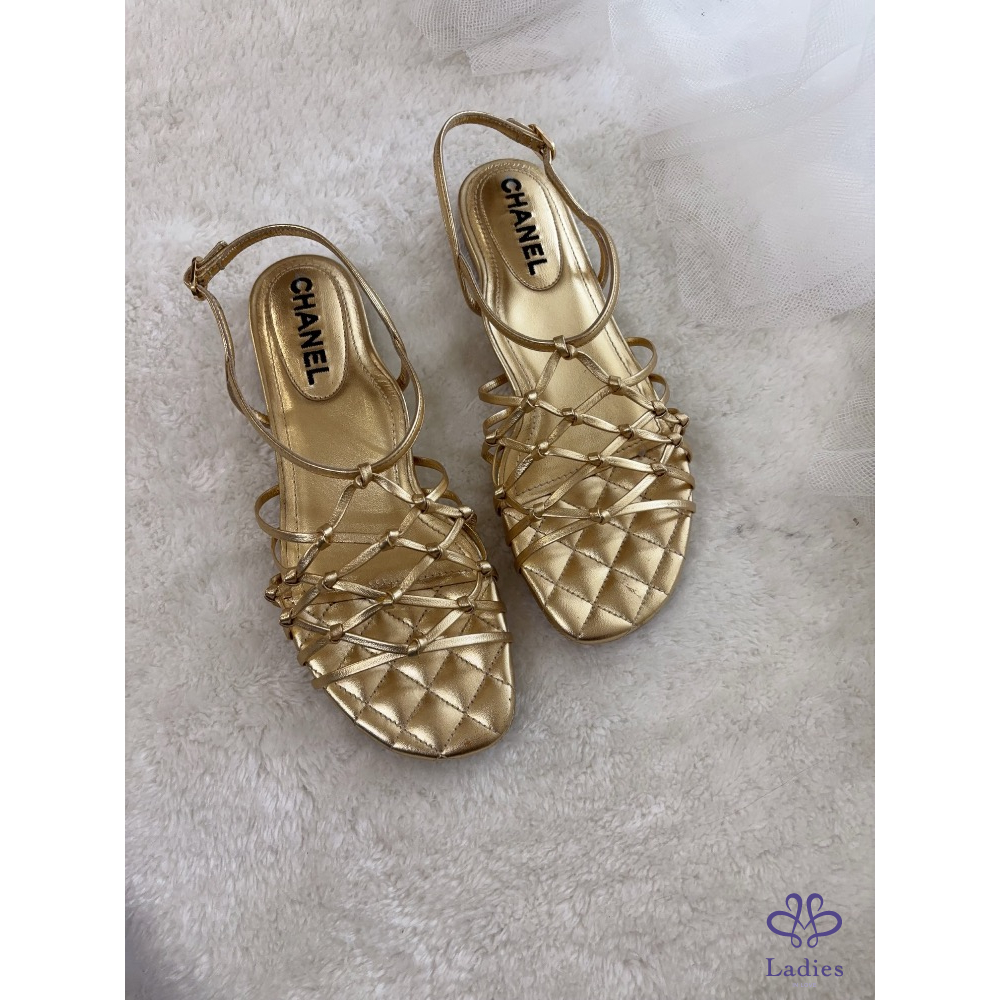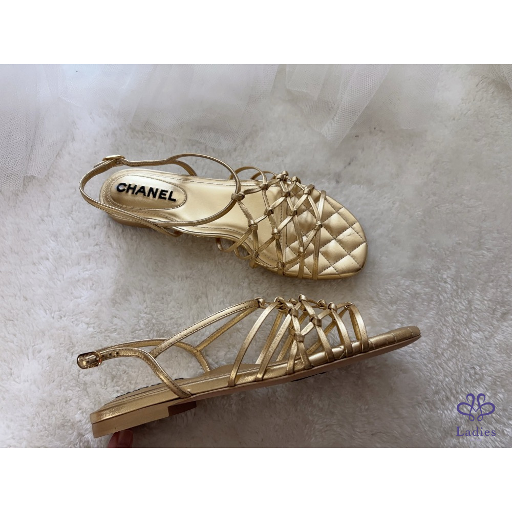 產品信息 B549 Chanel➰春夏限定款。金色網狀平底涼鞋 夏天就要有一雙超美的涼鞋, 金色很百搭,穿起來很顯白有質感~ 褲裝、裙裝都好搭配,非常時髦 全新,僅拍照,鞋頭表面有微掉色,不明顯 尺寸:37.5 原價約$35000 附盒、鞋套、小冊,它團同步 ‼️❌請確定要購買再私訊我,問問考慮勿浪費彼此時間 ‼️❌習慣已讀不回、不讀不回、議價問問請勿擾