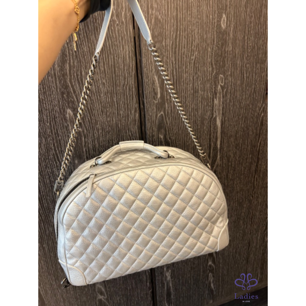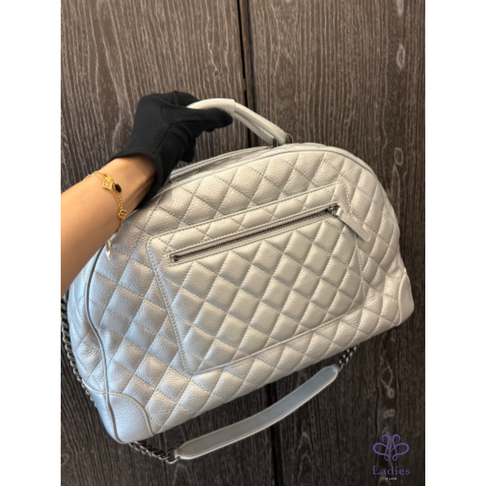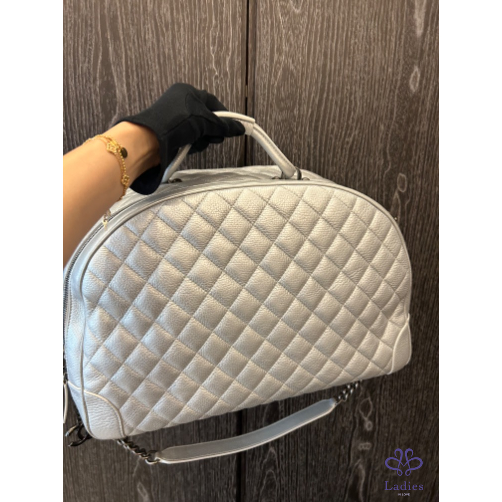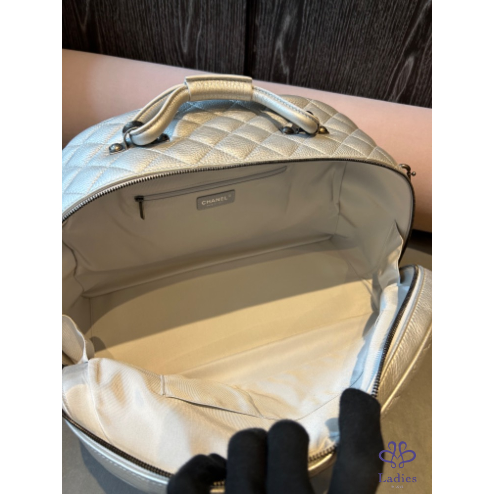 售chanel機場包。銀色荔枝皮,出國必備的旅行包。容量很夠,可以手提肩背,背面可掛在行李箱上,非常時尚好用的機場系列美包。使用過二、三次,9.5新。非常稀有的包款