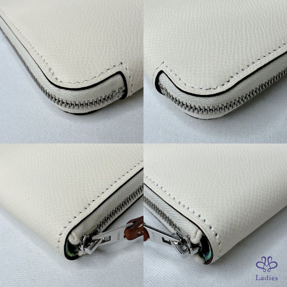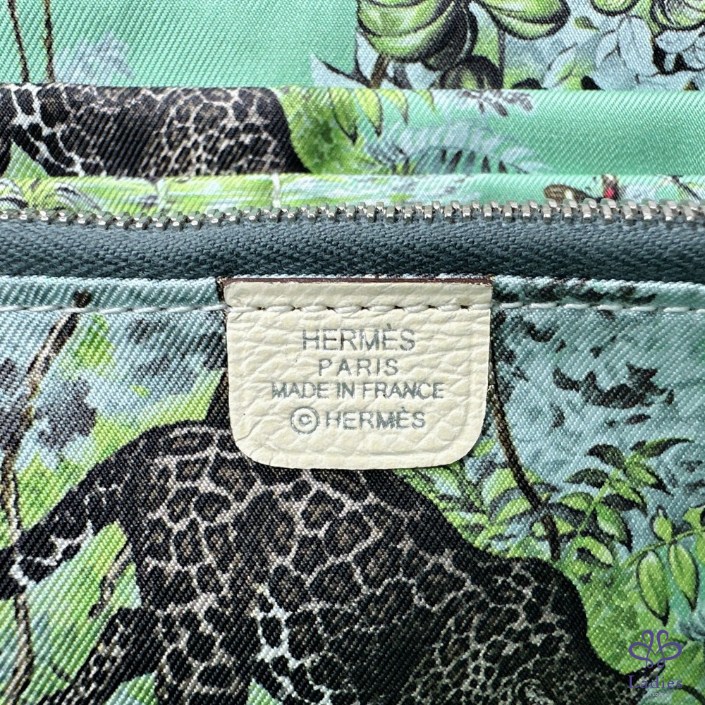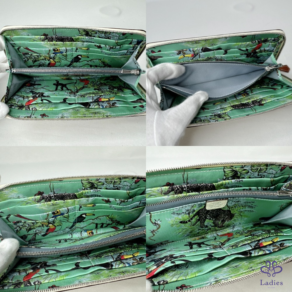 產品信息 【HERMES Silk'In赤道叢林絲巾長夾】 #E皮Z刻 #奶油白 超美薄荷綠底赤道叢林! 內裡金剛鸚鵡、長臂猿和花豹~ 喜歡的絲巾花色錯過很難再遇到 12個信用卡槽,4個鈔票層 整體包況約9成5新,二手商品均有正常使用/存放痕跡 尺寸:20x11x2cm 附件:原廠盒、台灣購證影本(去個資) #B114032001