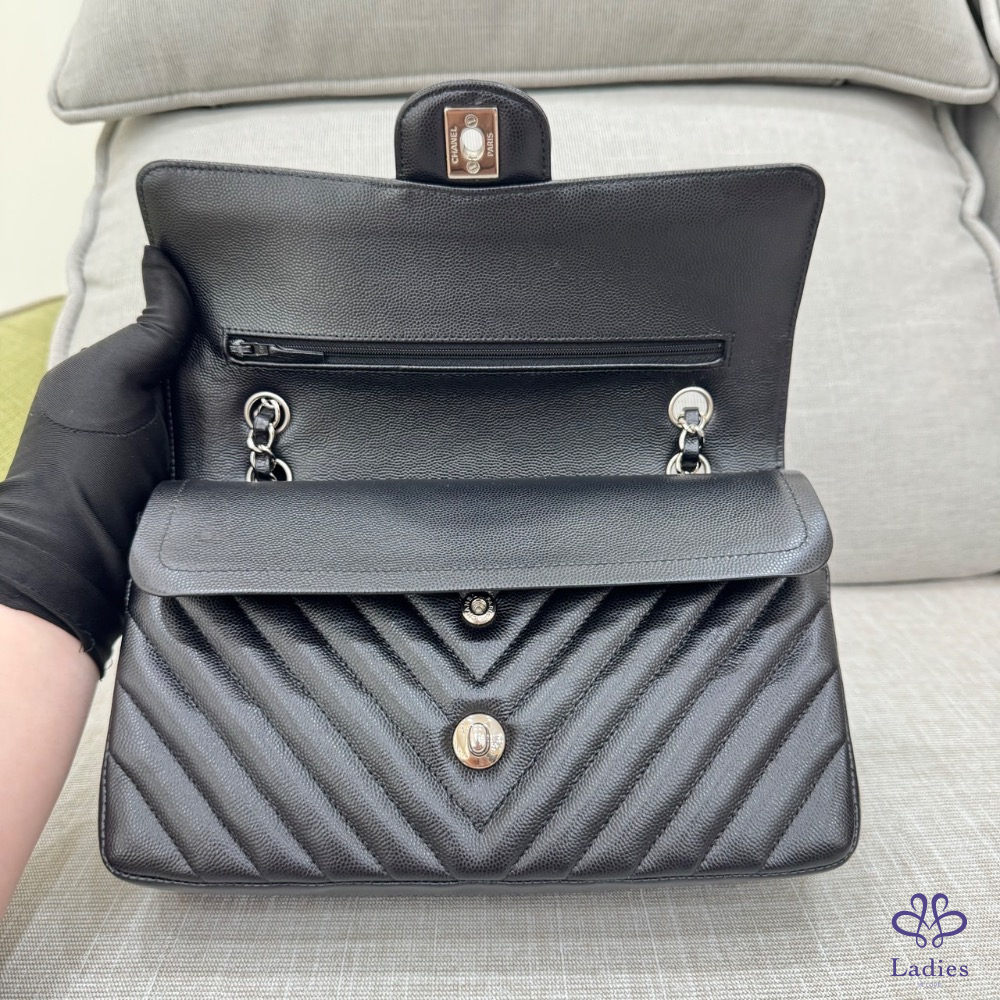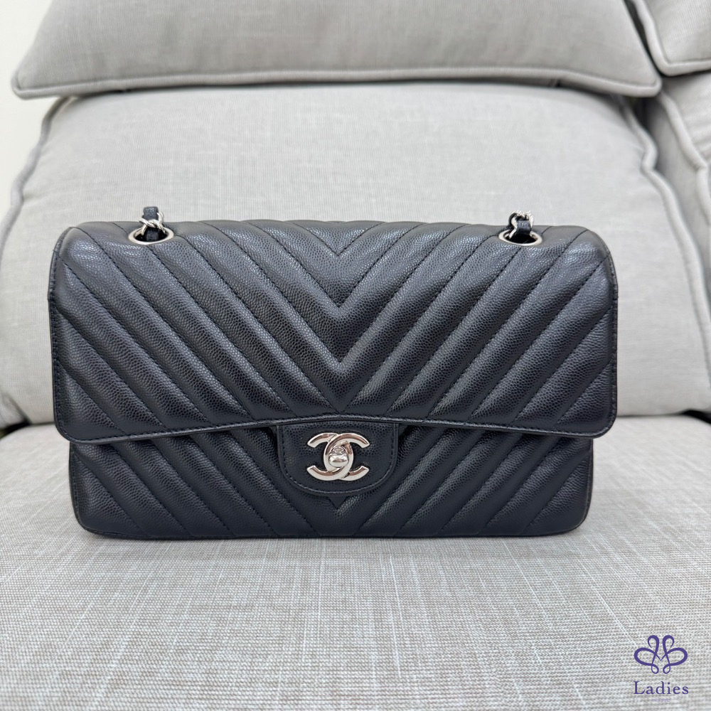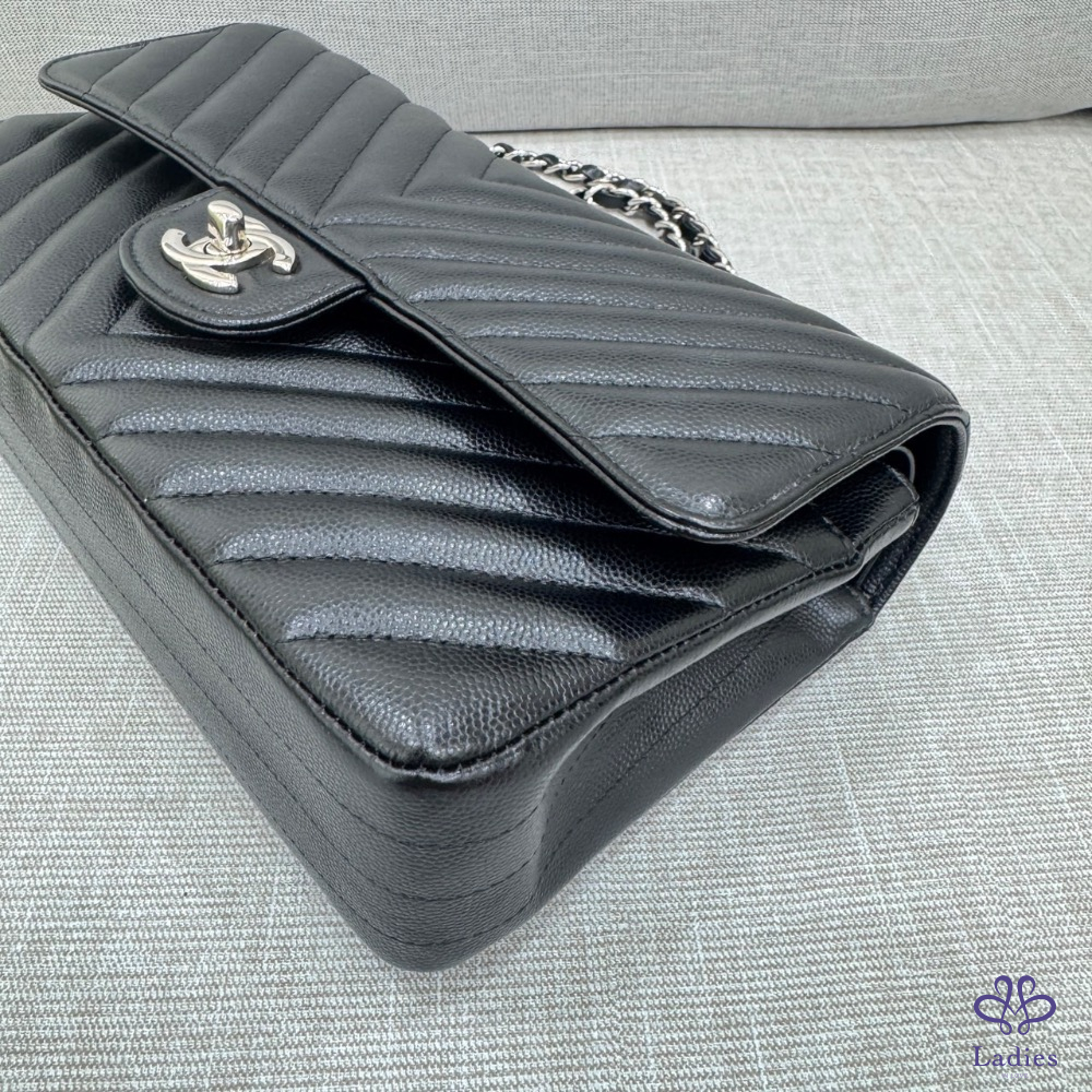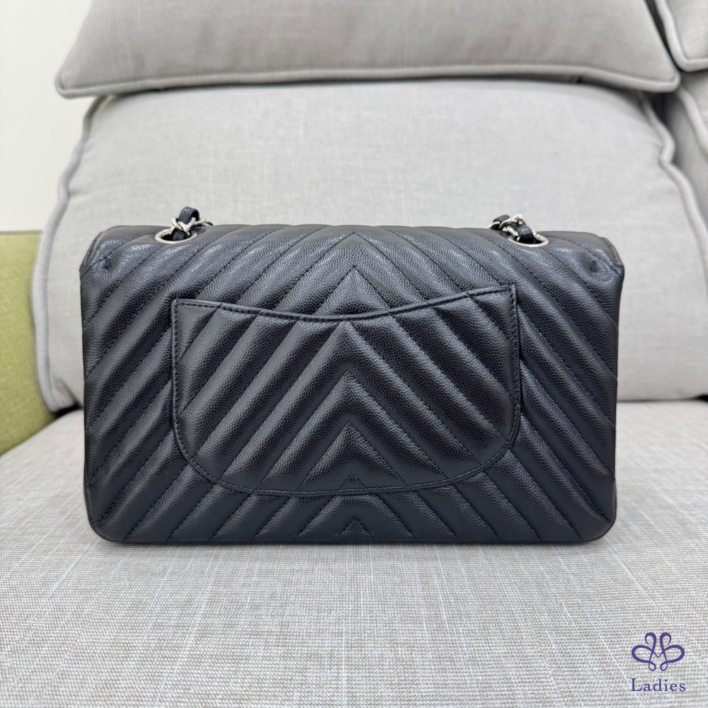 💝💝代售 香奈兒 CHANEL cf25 黑銀v紋牛皮荔枝紋經典常青款 中號