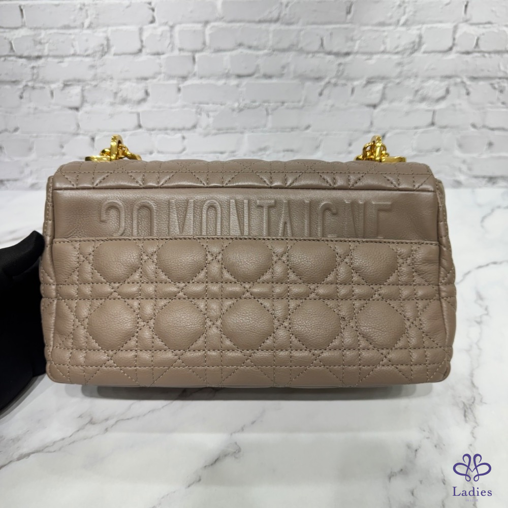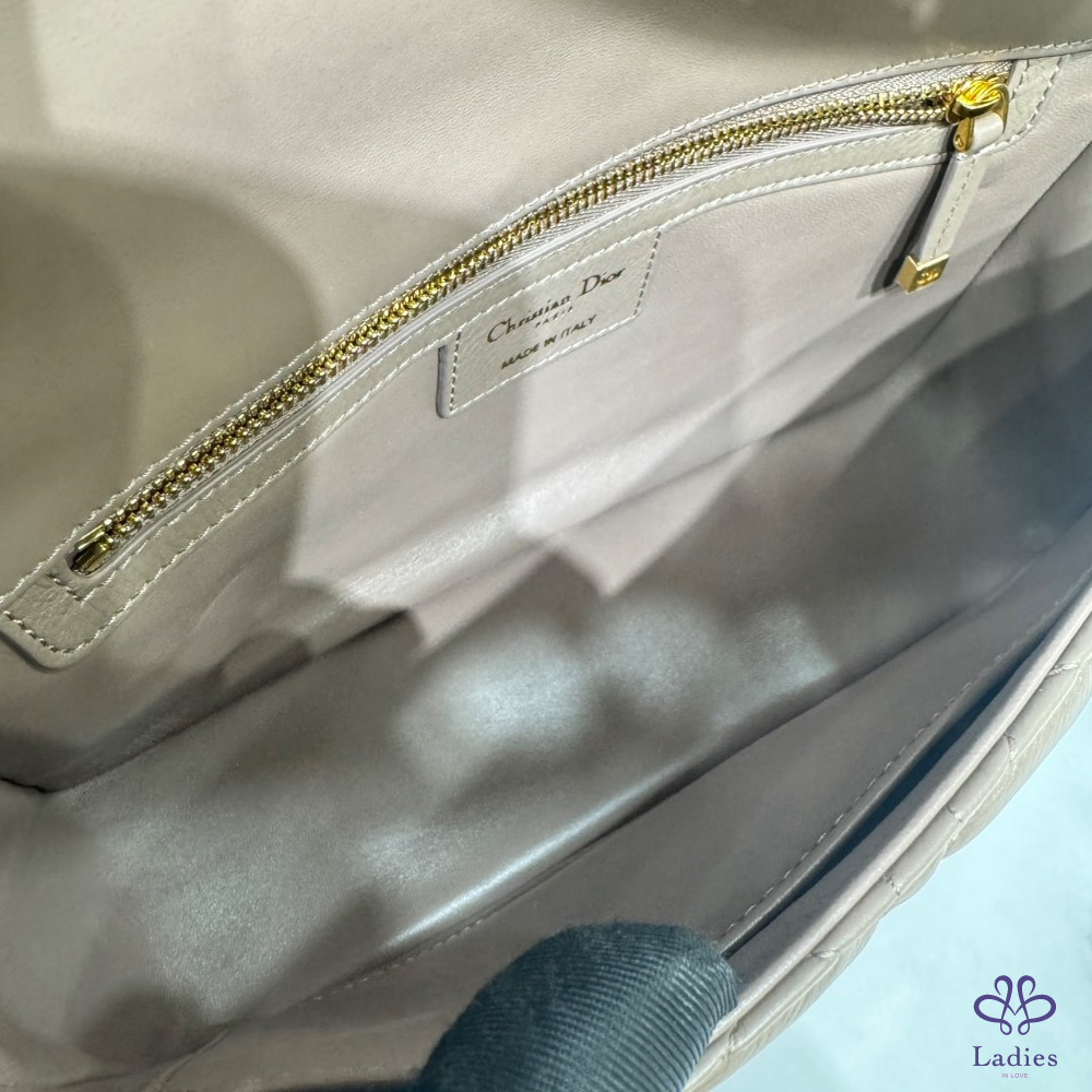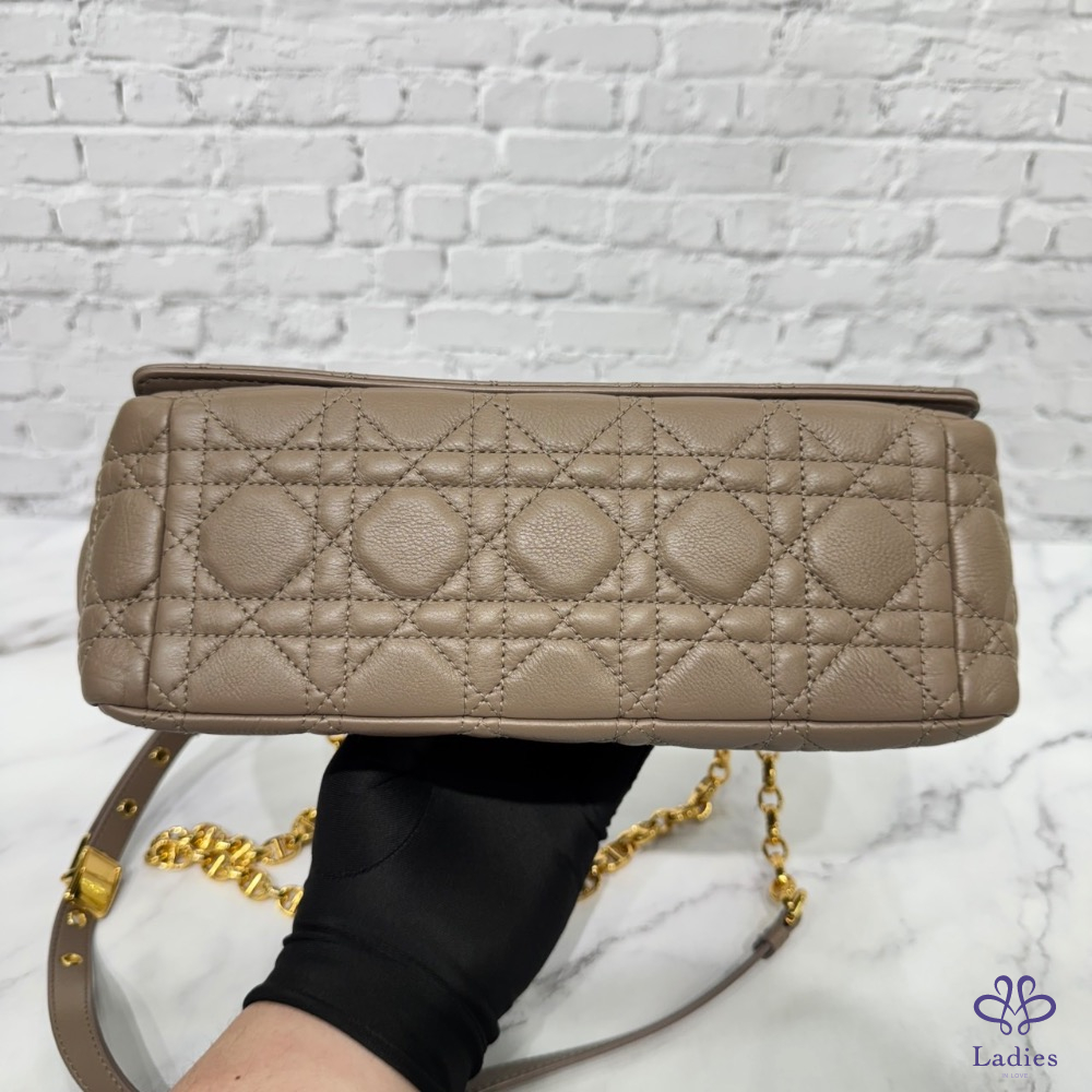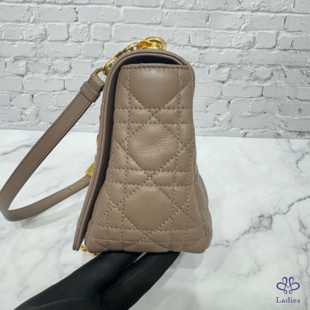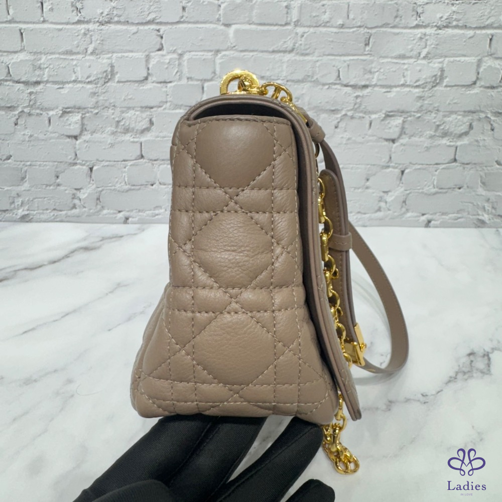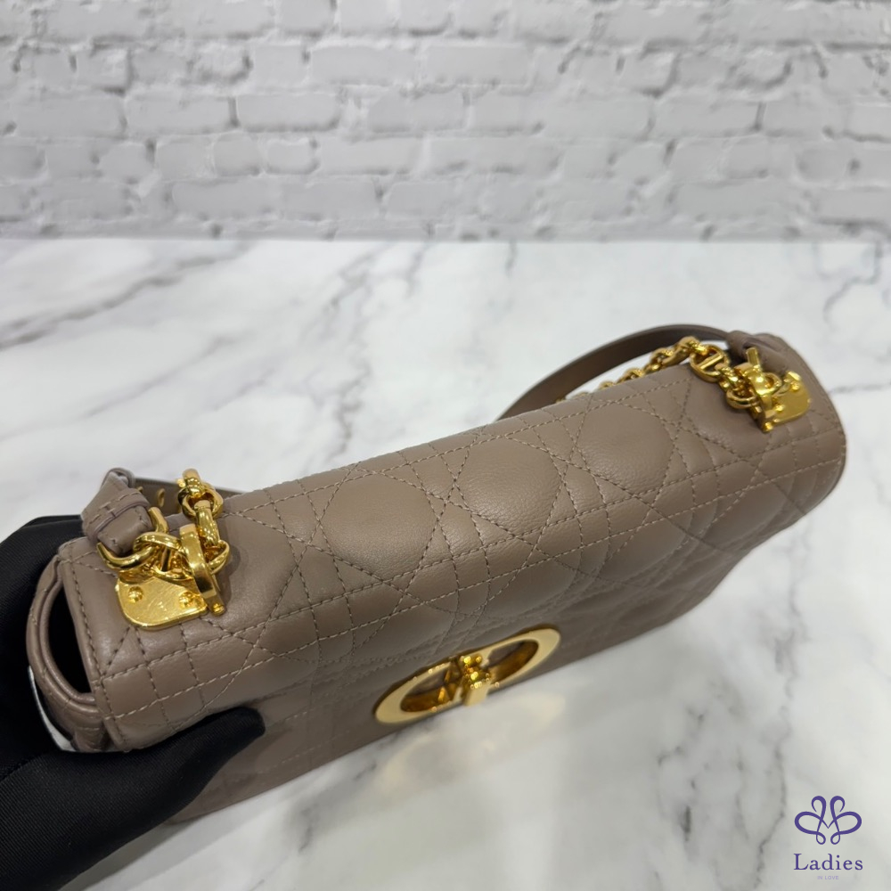 Dior Caro 包款糅合時尚風格與雋永優雅氣質,點綴 Cannage 籐格紋縫線。翻蓋設計搭配復古金色飾面金屬 CD 旋轉鎖扣,靈感來自Christian Dior 香水瓶封口。這款中型包配備可拆卸鏈帶,搭配 CD 標誌鏈環,可手提、肩背或斜背,也可換上品牌的寬版刺繡肩背帶,日夜造型皆可搭配。