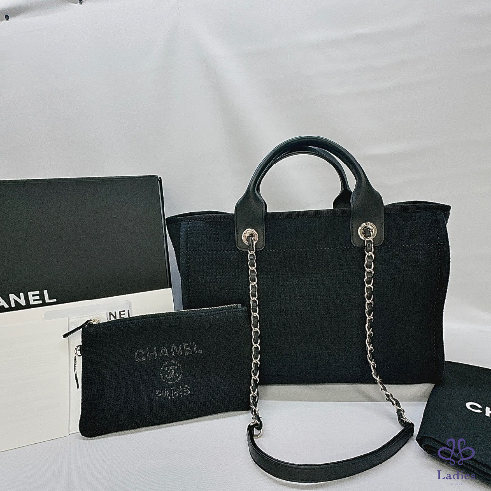 產品信息 【CHANEL 黑色帆布沙灘包】 #專櫃價16萬 經典黑色搭配浅金色的五金特别吸睛亮眼👀 容量很大可以放下日常出行的必備用品 满足喜歡纯黑低调出行人的一切幻想,好装又好看💘 ⚜️整體包況約9成5新,二手商品均有正常使用/存放痕跡 ⚜️型號:AS3351 ⚜️尺寸:26x41x17cm ⚜️附件:原廠紙盒、防塵袋、國外購證影本(去個資)、 卡冊、小包 #A114041101