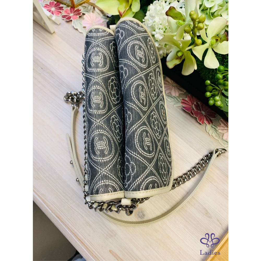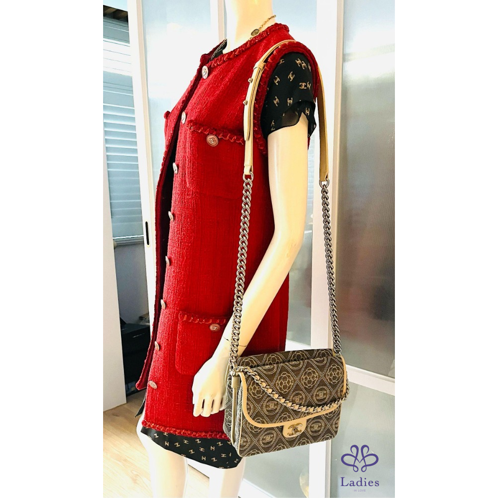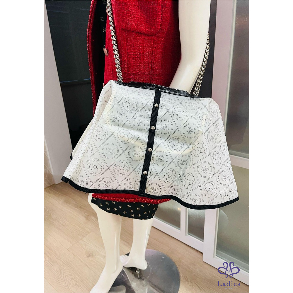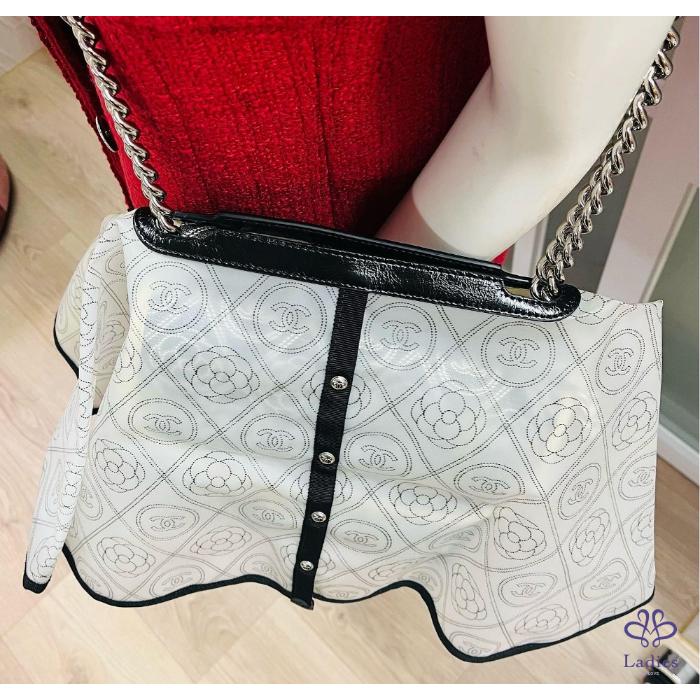 九成五以上新,尺寸:23. ×18×9公分,有兩條鍊子,短的可以手拿,長的可以鈄背、側背並可調整長度。雙面使用,中間還有一個夾層,是一個多公用的包包。防水布材質,四周都滾了白色的皮邊,香奈兒Logo和山茶花,是你不注意它的都很難。限量商品。附防塵袋、保卡、及雨衣。