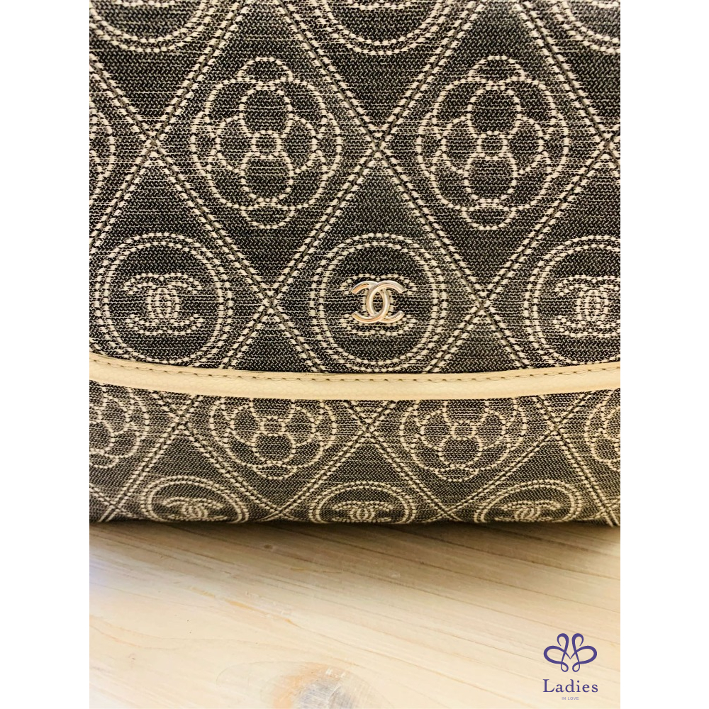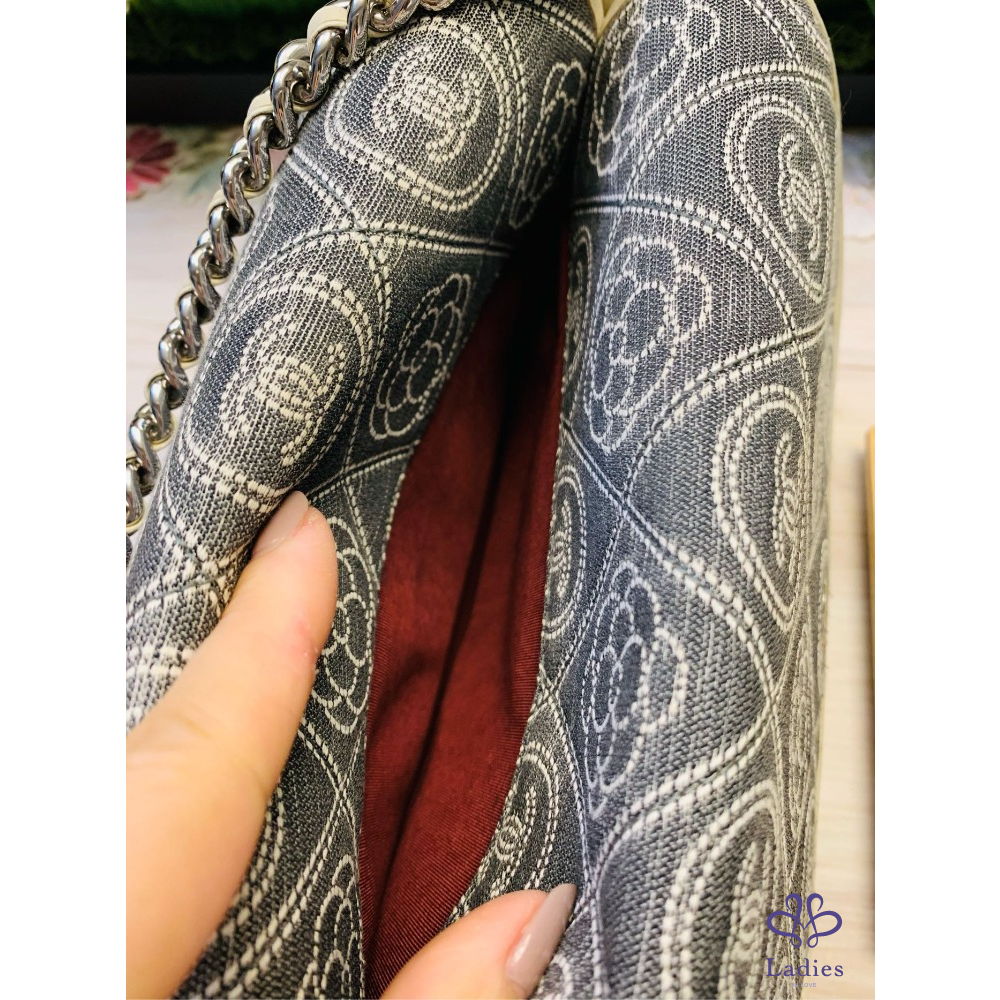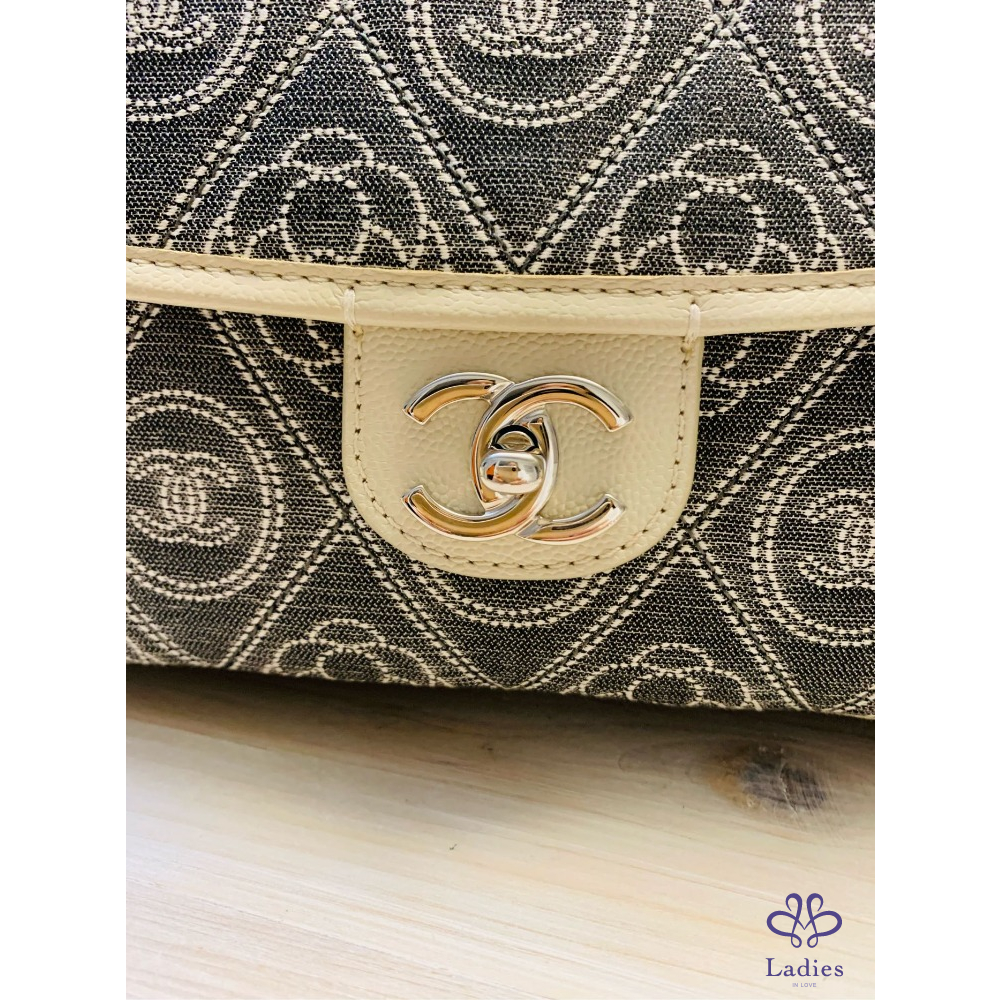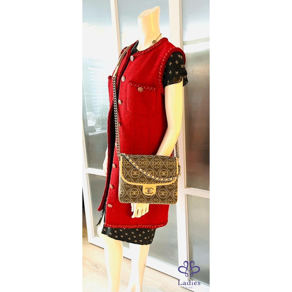 九成五以上新,尺寸:23. ×18×9公分,有兩條鍊子,短的可以手拿,長的可以鈄背、側背並可調整長度。雙面使用,中間還有一個夾層,是一個多公用的包包。防水布材質,四周都滾了白色的皮邊,香奈兒Logo和山茶花,是你不注意它的都很難。限量商品。附防塵袋、保卡、及雨衣。