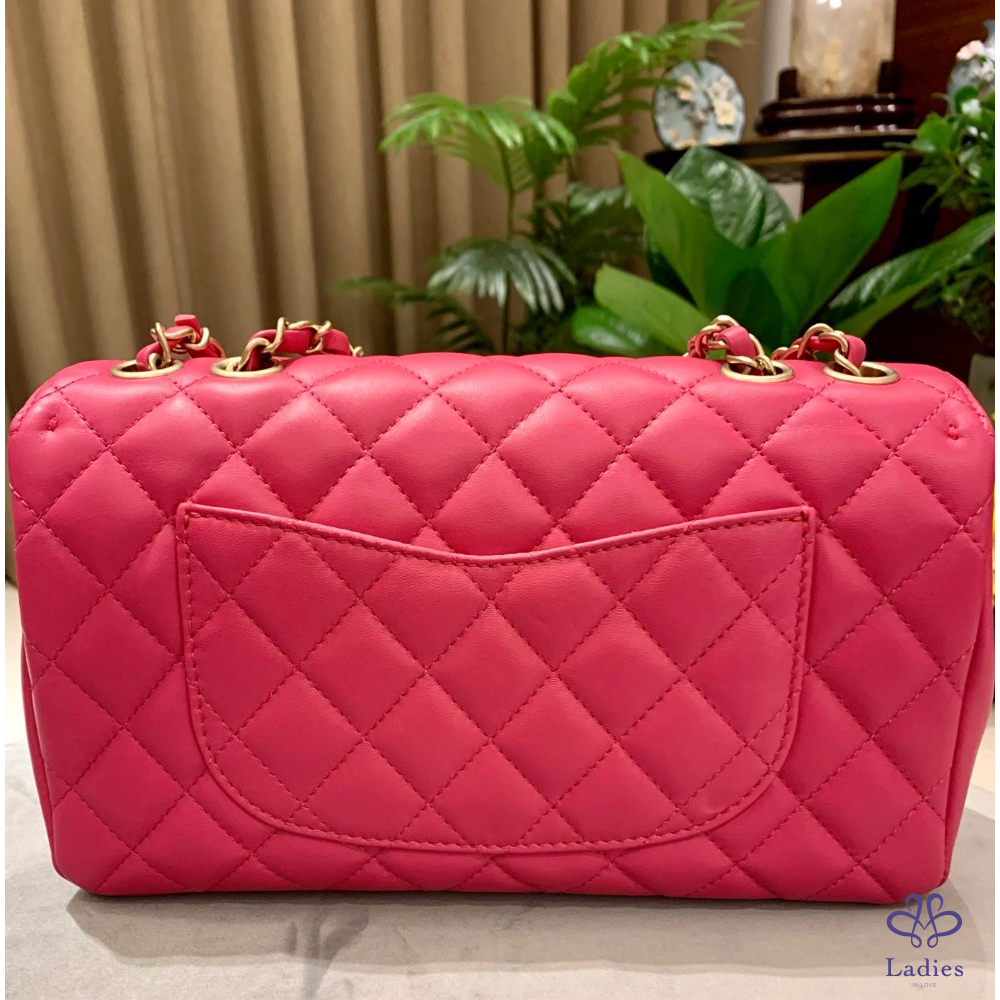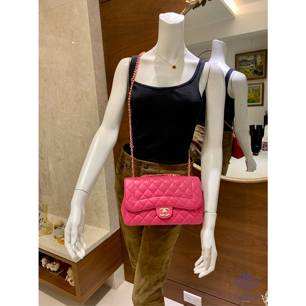 98成新,附保證卡、購買證明、防塵袋及盒子。漂亮的苺果紅的口蓋包,四角完整,沒有沾污,可雙鍊側背,單鍊側背或鈄背。尺寸:25×8×15公分,現售價約18萬元。